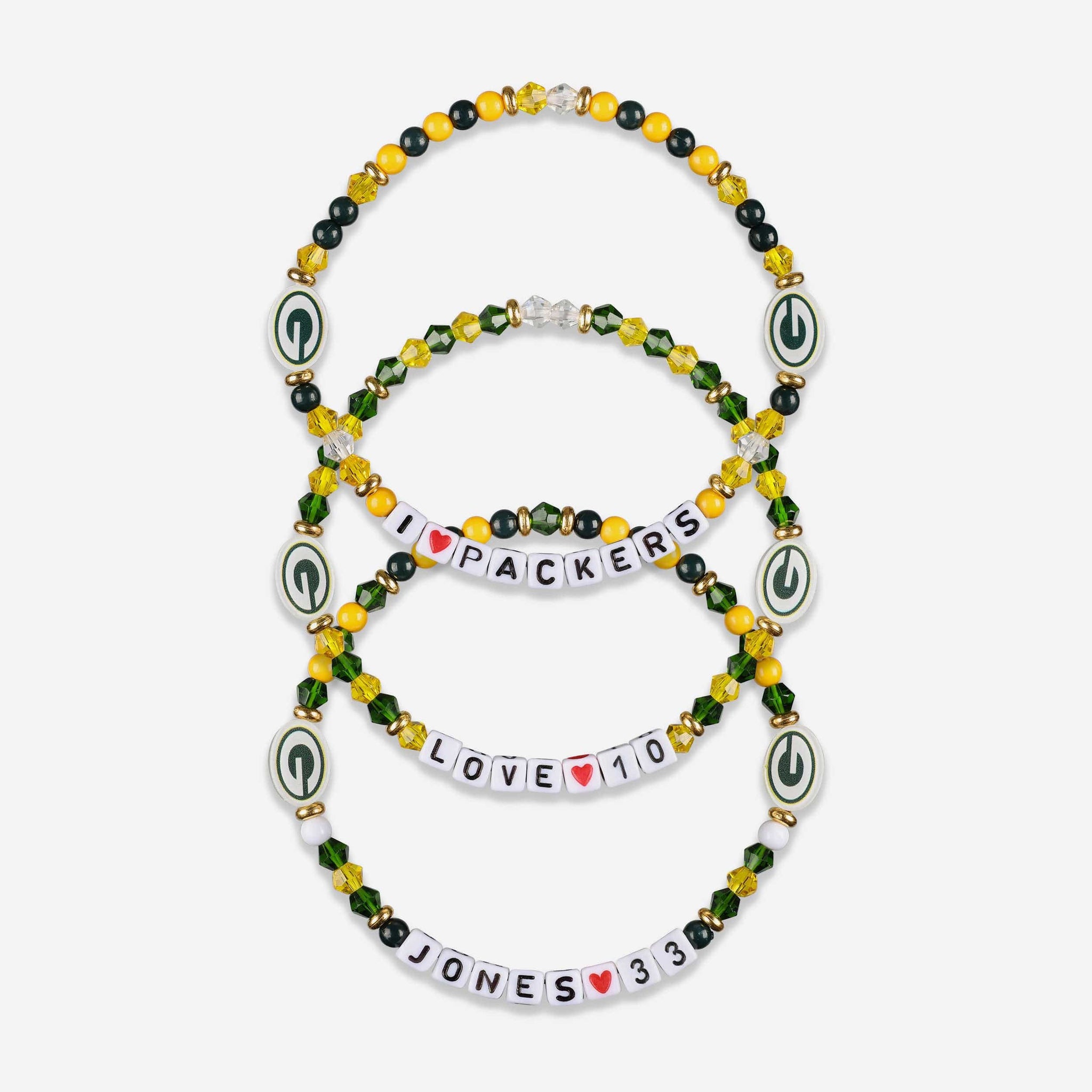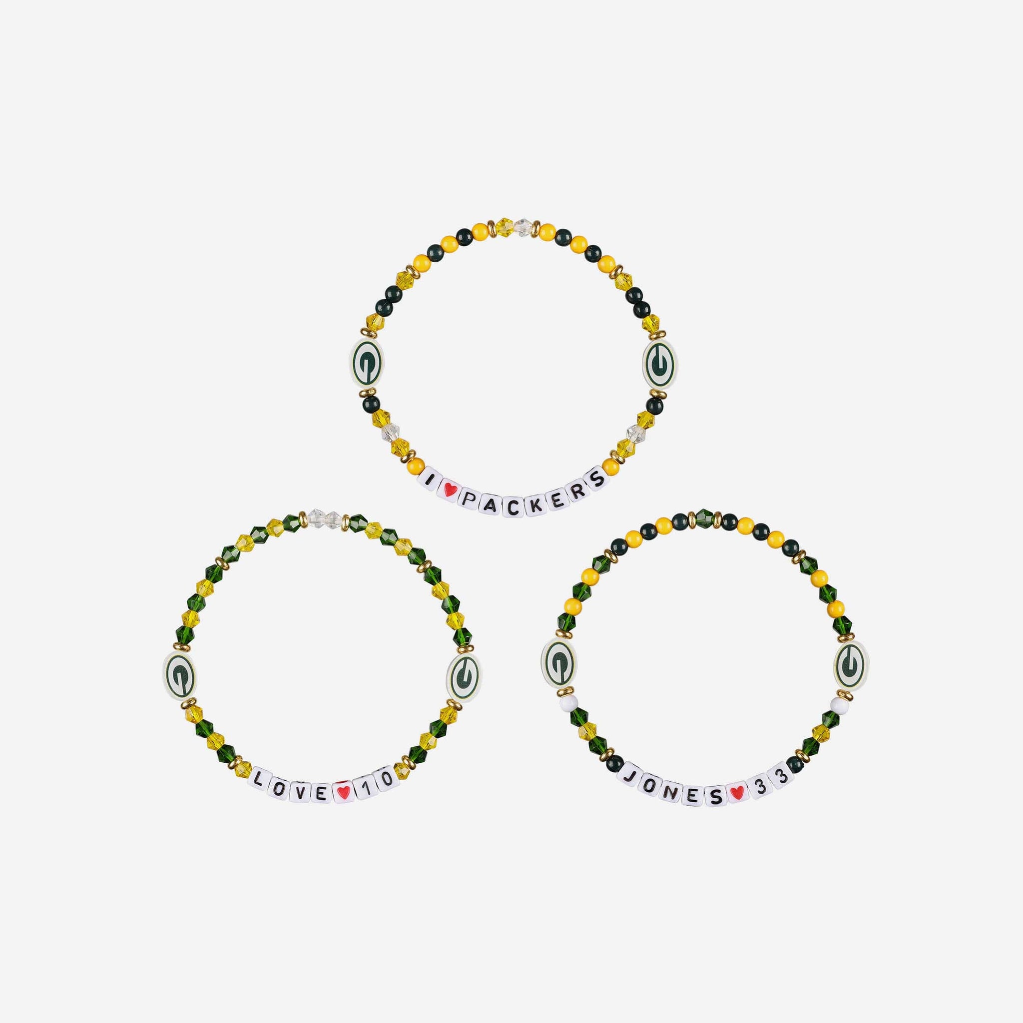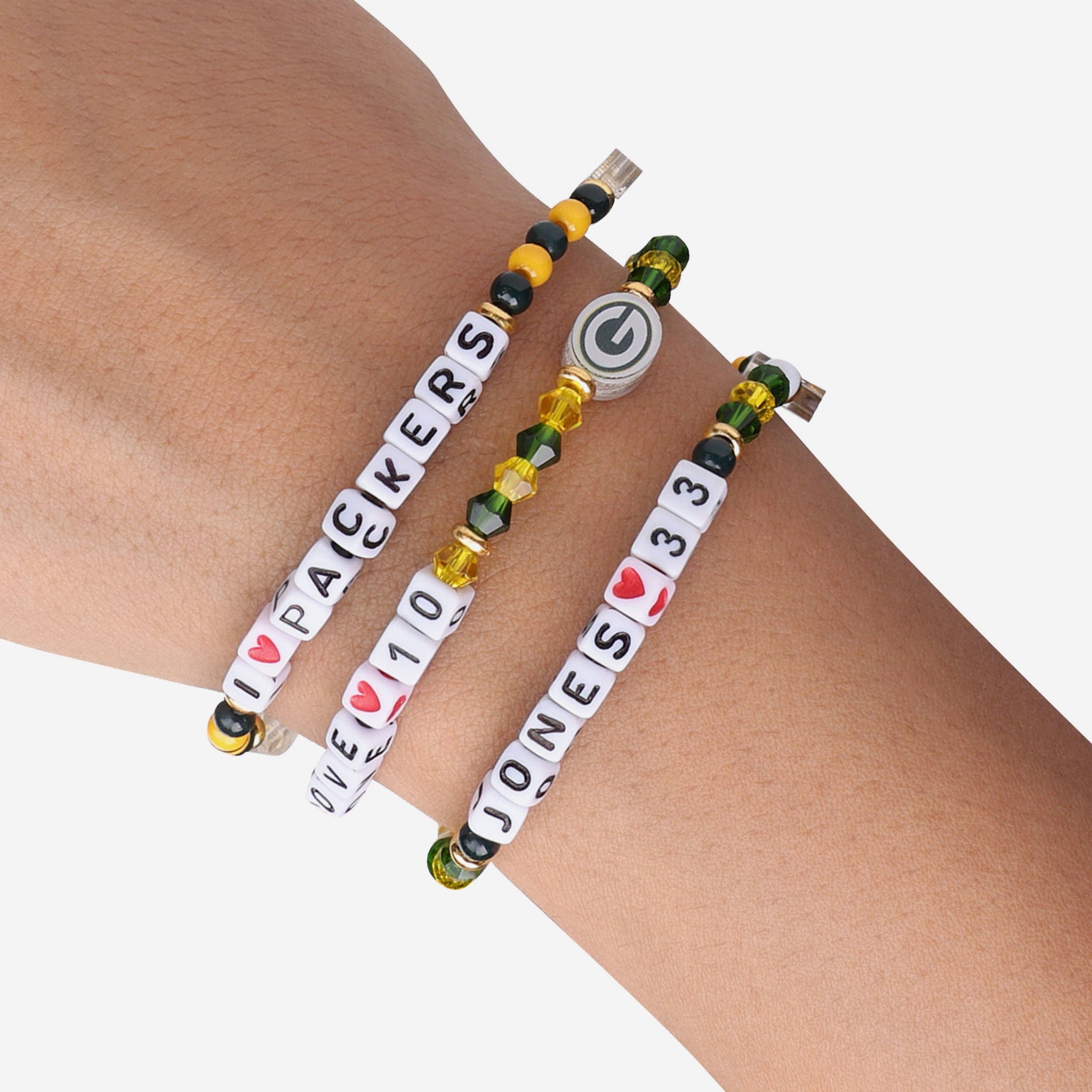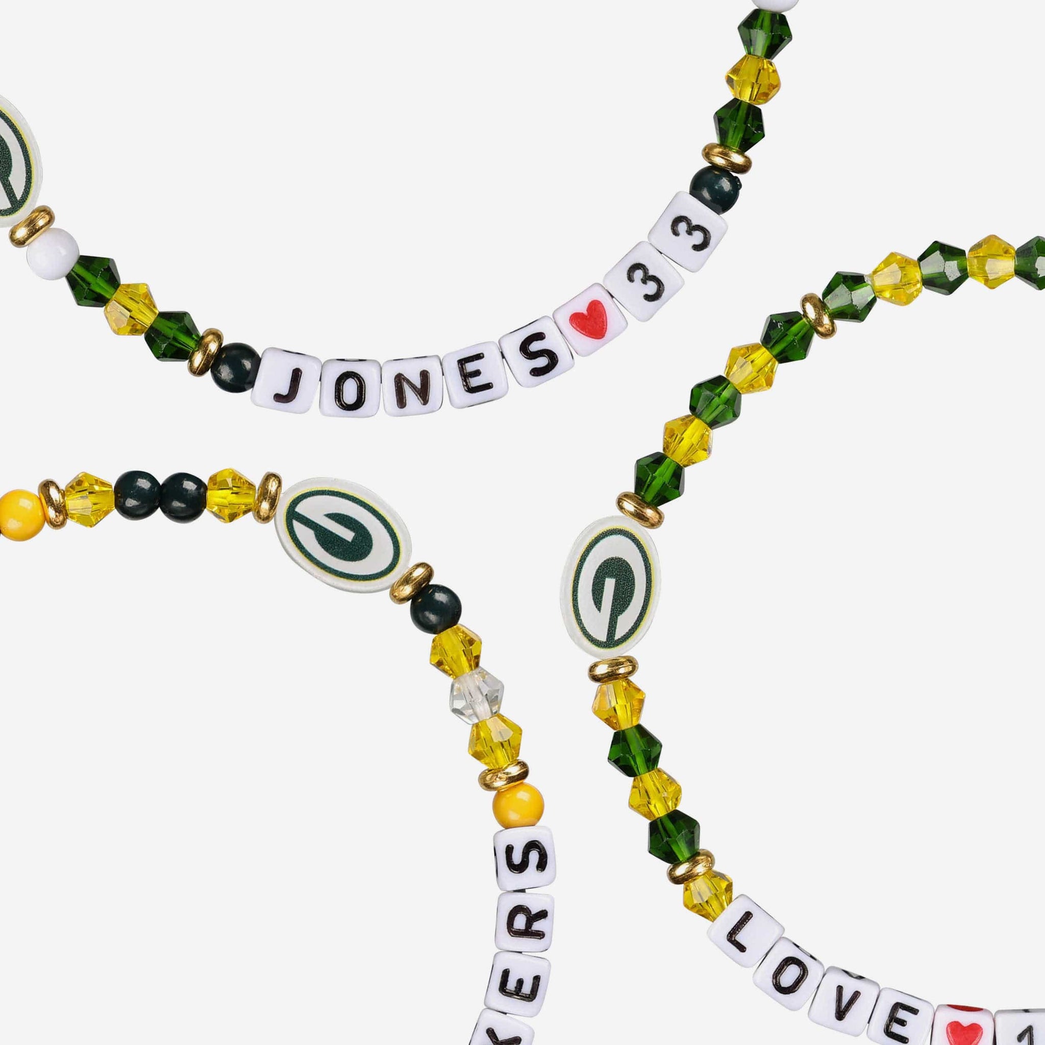 - Thematic words displayed: Letter cubes are organized on a friendship bracelet string to display team-specific words, messages, and player names that will make sure these Jordan Love & Aaron Jones player friendship bracelets always have your team spirit front and center.