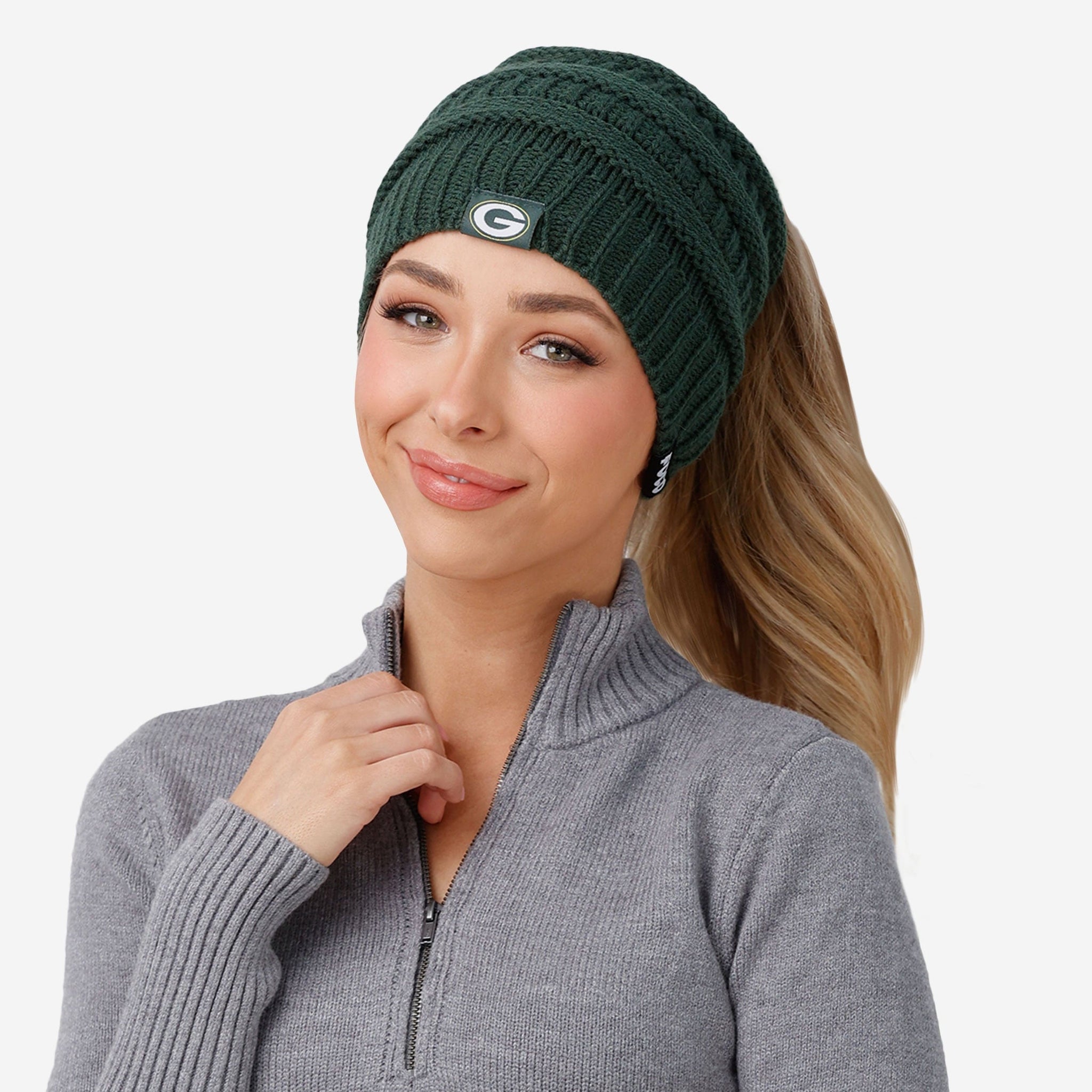 Putting together the ultimate fit for the tailgate and beyond? Make sure to get your head in the game with the Green Bay Packers Women's Solid Ponytail Beanie!