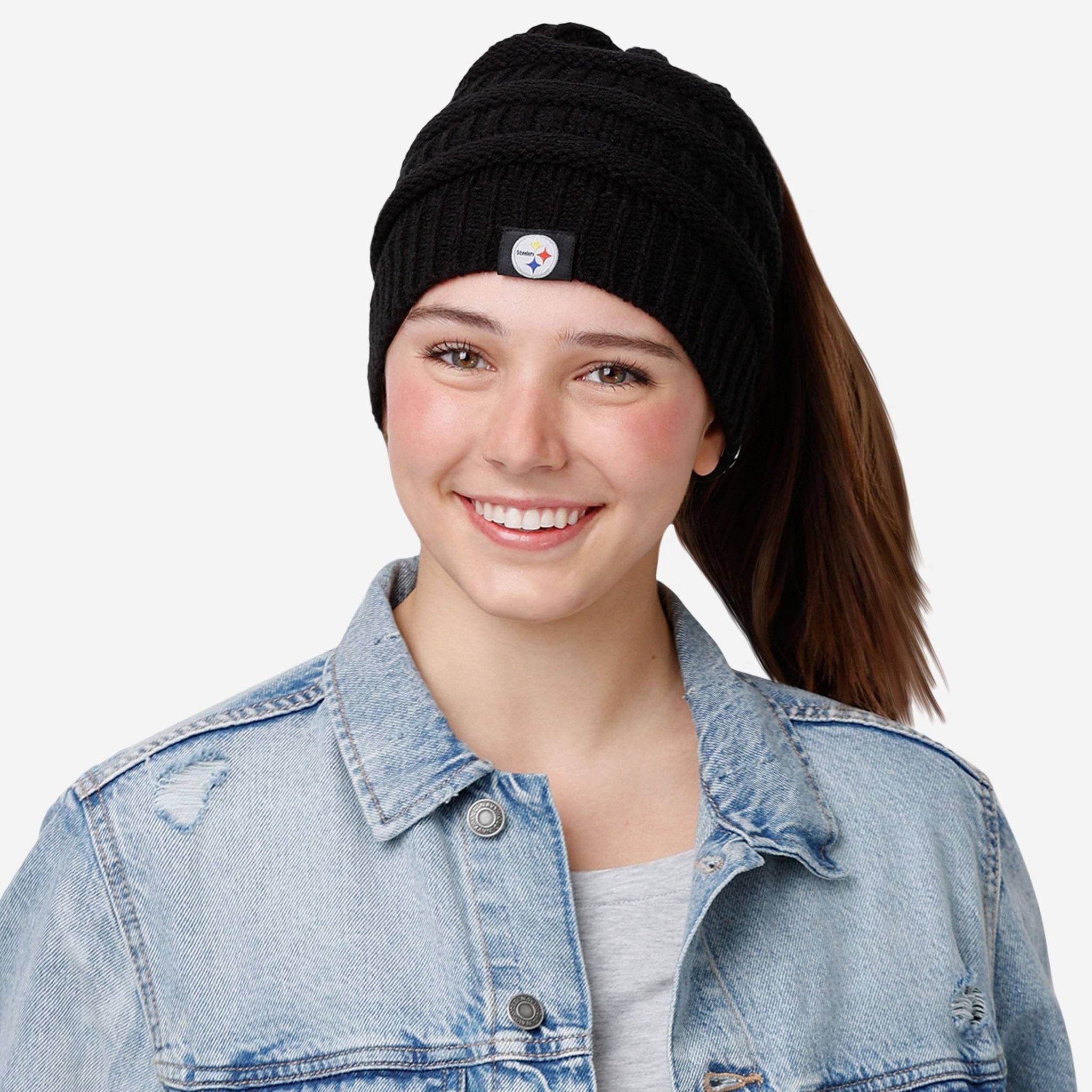 Putting together the ultimate fit for the tailgate and beyond? Make sure to get your head in the game with the Pittsburgh Steelers Women's Solid Ponytail Beanie!
