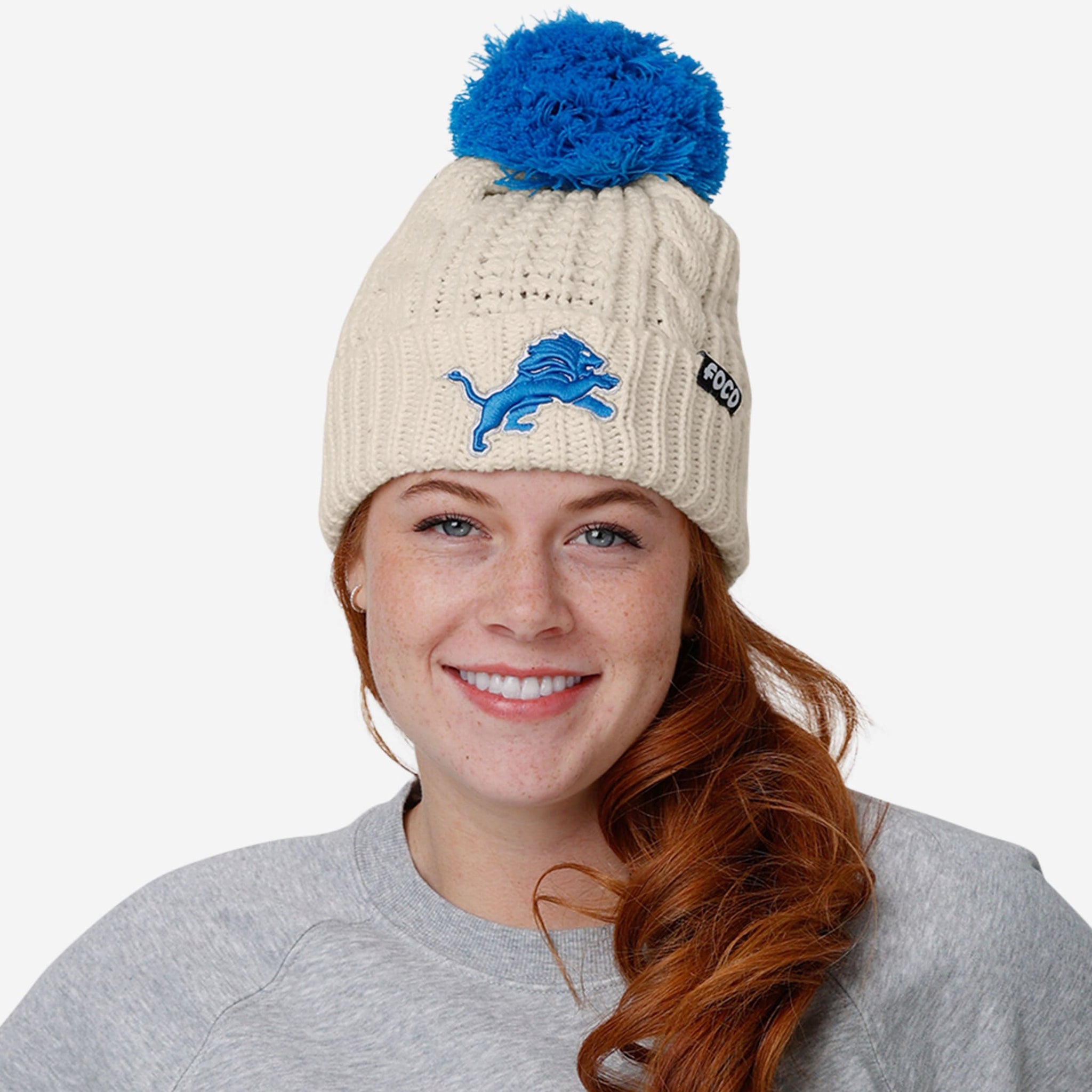 Detroit Lions Womens Primary Logo White Cable Knit Pom Beanie FOCO - FOCO.com