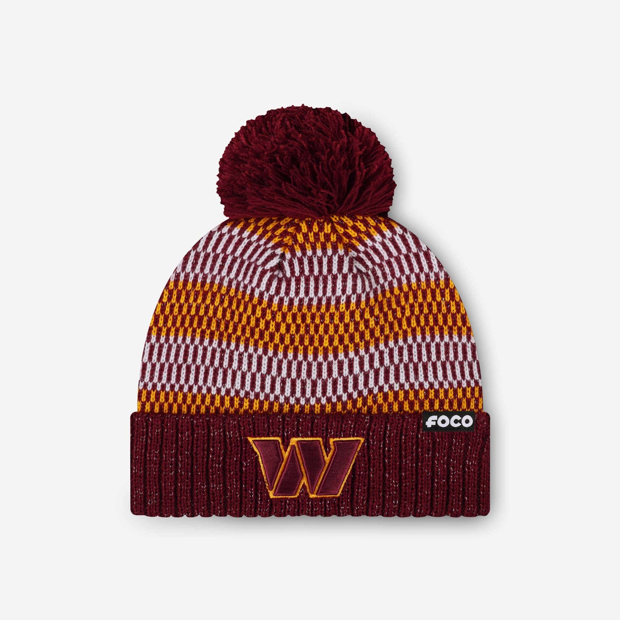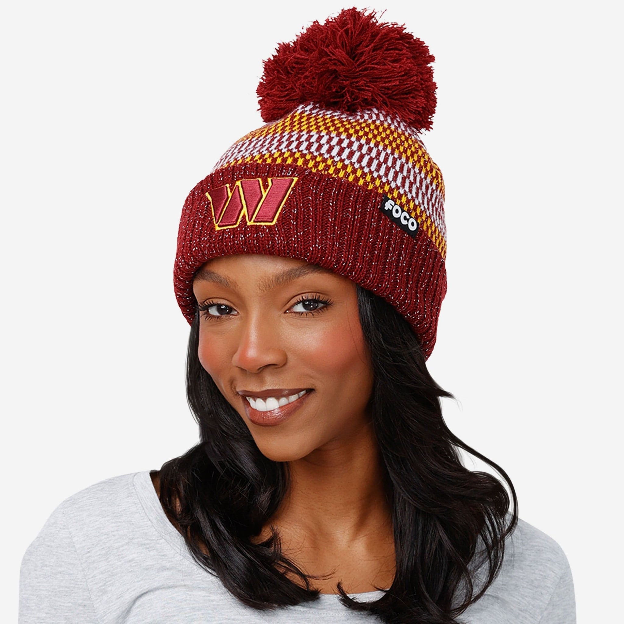 Putting together the ultimate fit for the tailgate and beyond? Make sure to get your head in the game with the Washington Commanders Women's Cozy Knit Metallic Thread Pom Beanie!