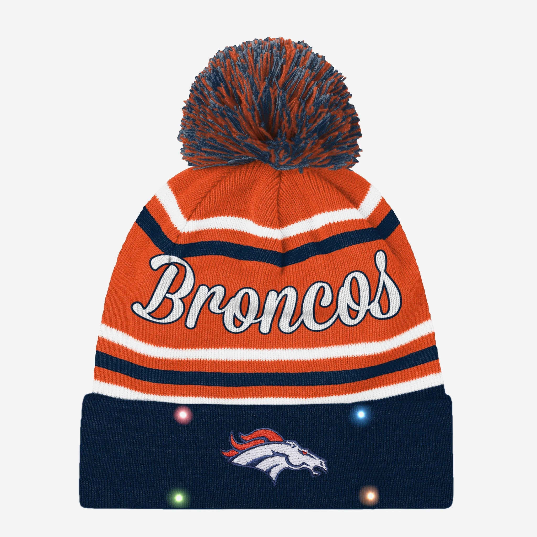 Turn that snow day into a glow day. The weather outside may be frightful, but wearing this Denver Broncos Women's Wordmark Script Light Up Beanie is truly delightful.