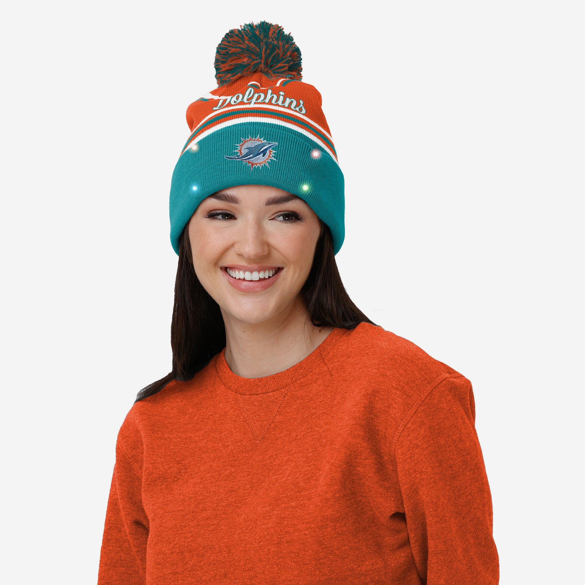 Turn that snow day into a glow day. The weather outside may be frightful, but wearing this Miami Dolphins Women's Wordmark Script Light Up Beanie is truly delightful.