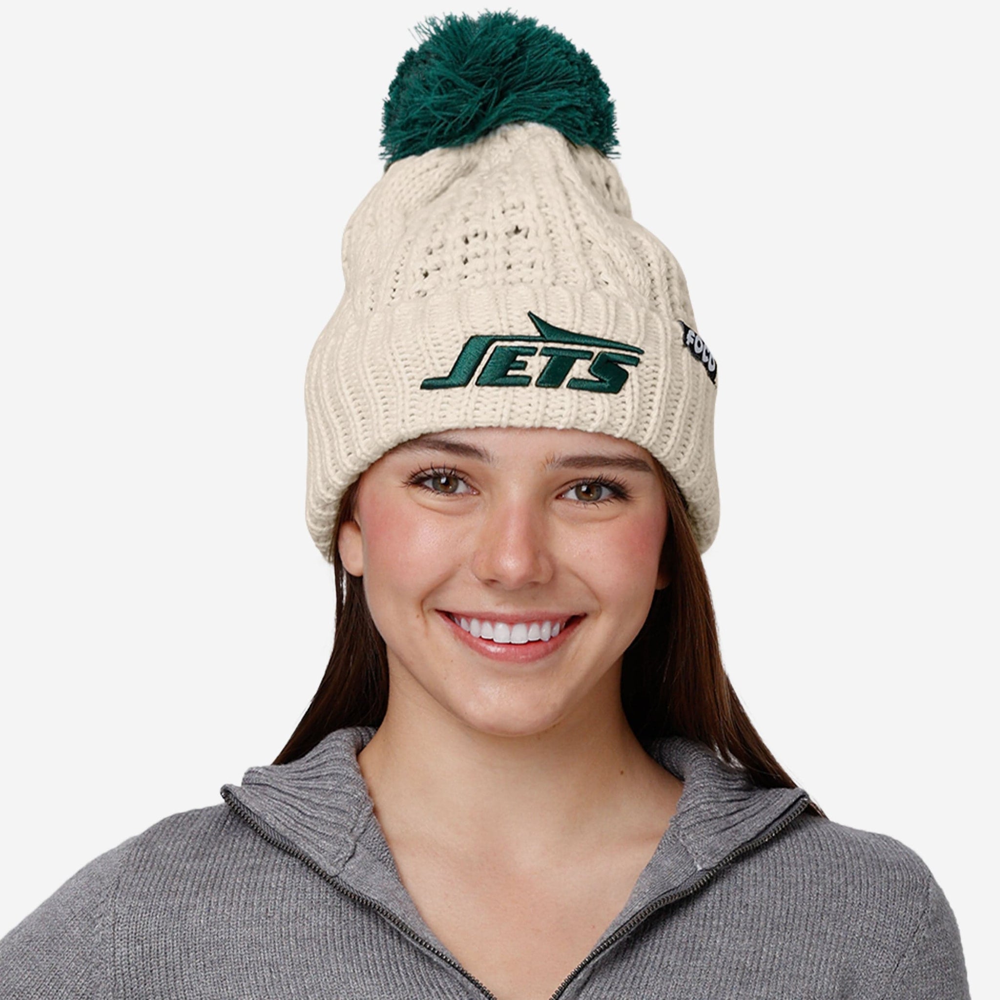 Putting together the ultimate fit for the tailgate and beyond? Make sure to get your head in the game with the New York Jets Women's Primary Logo White Cable Knit Pom Beanie!