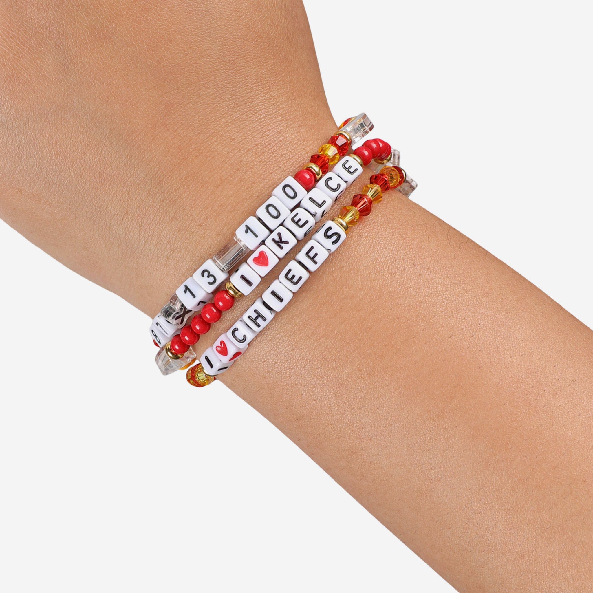 - Thematic words displayed: Letter cubes are organized on a friendship bracelet string to display team-specific words and messages that will make sure these Travis Kelce player friendship bracelets have your team front and center.