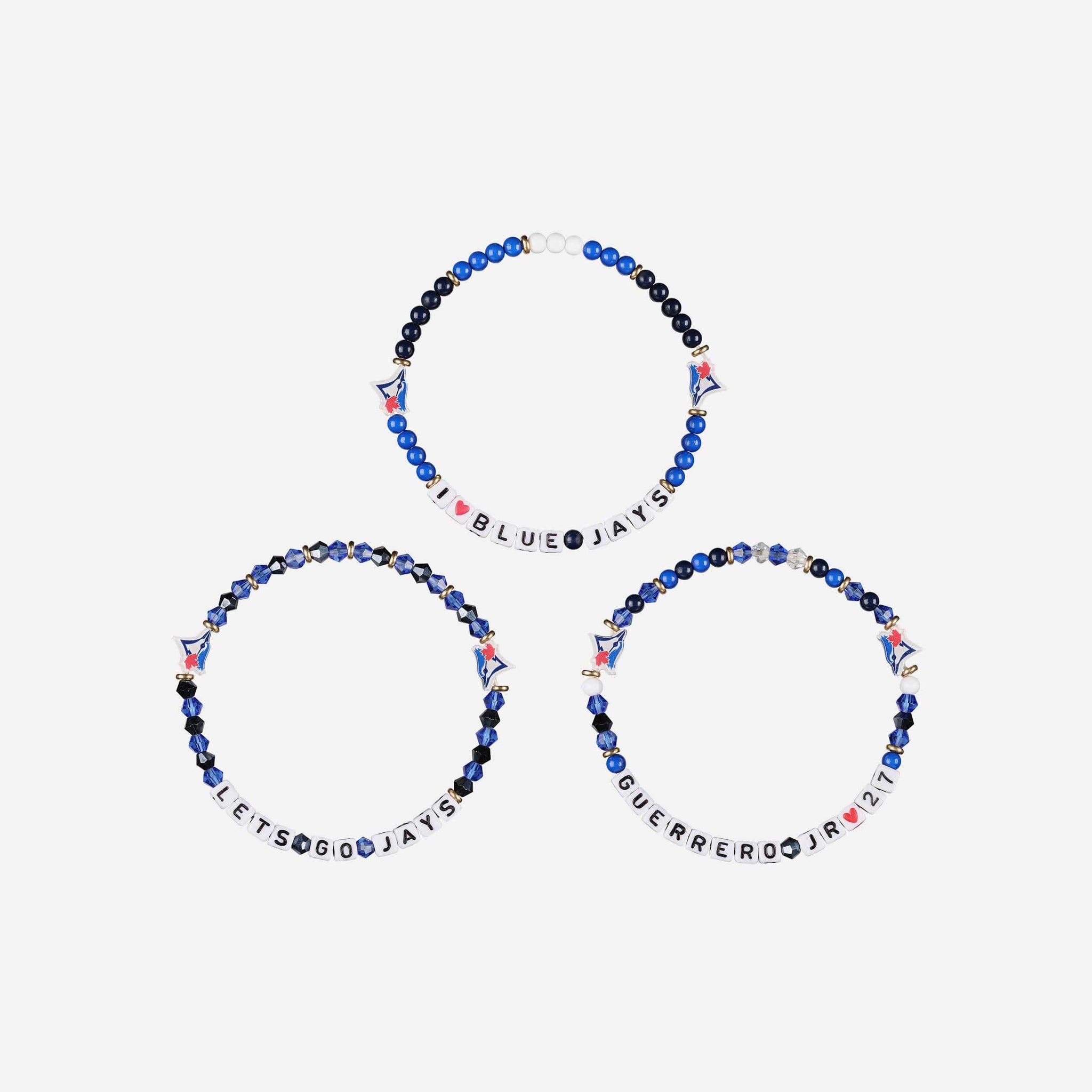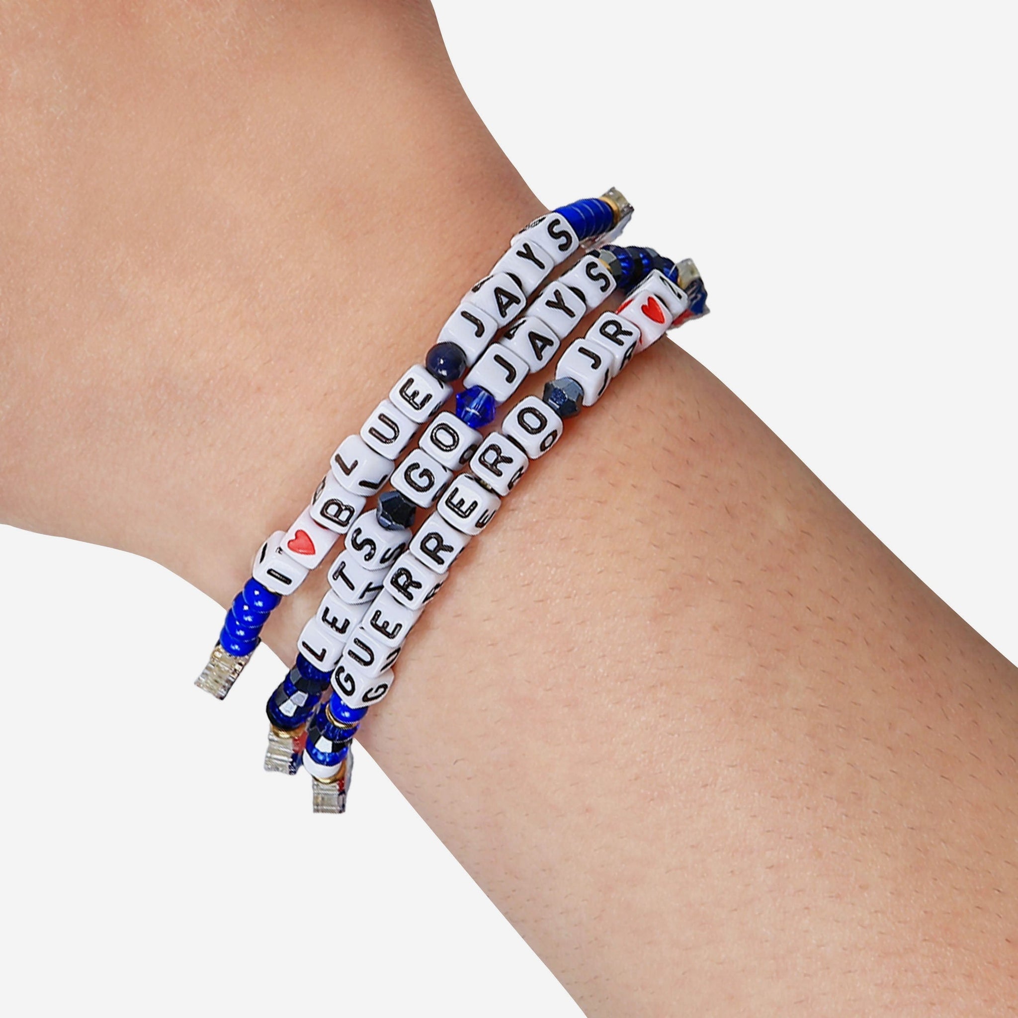 - Thematic words displayed: Letter cubes are organized on a friendship bracelet string to display team-specific words, messages, and player names that will make sure these Vladimir Guerrero Jr. player friendship bracelets always have your team spirit front and center.