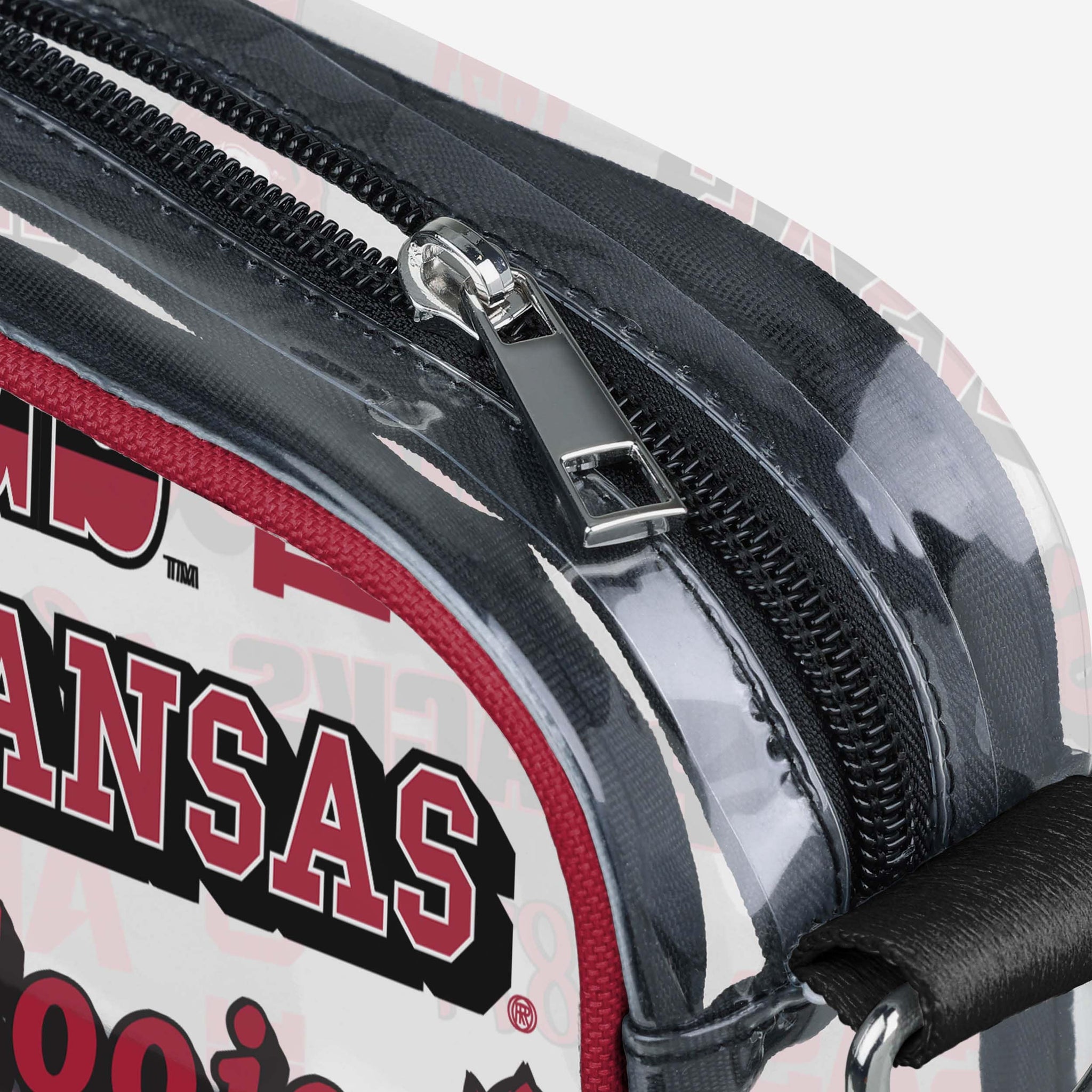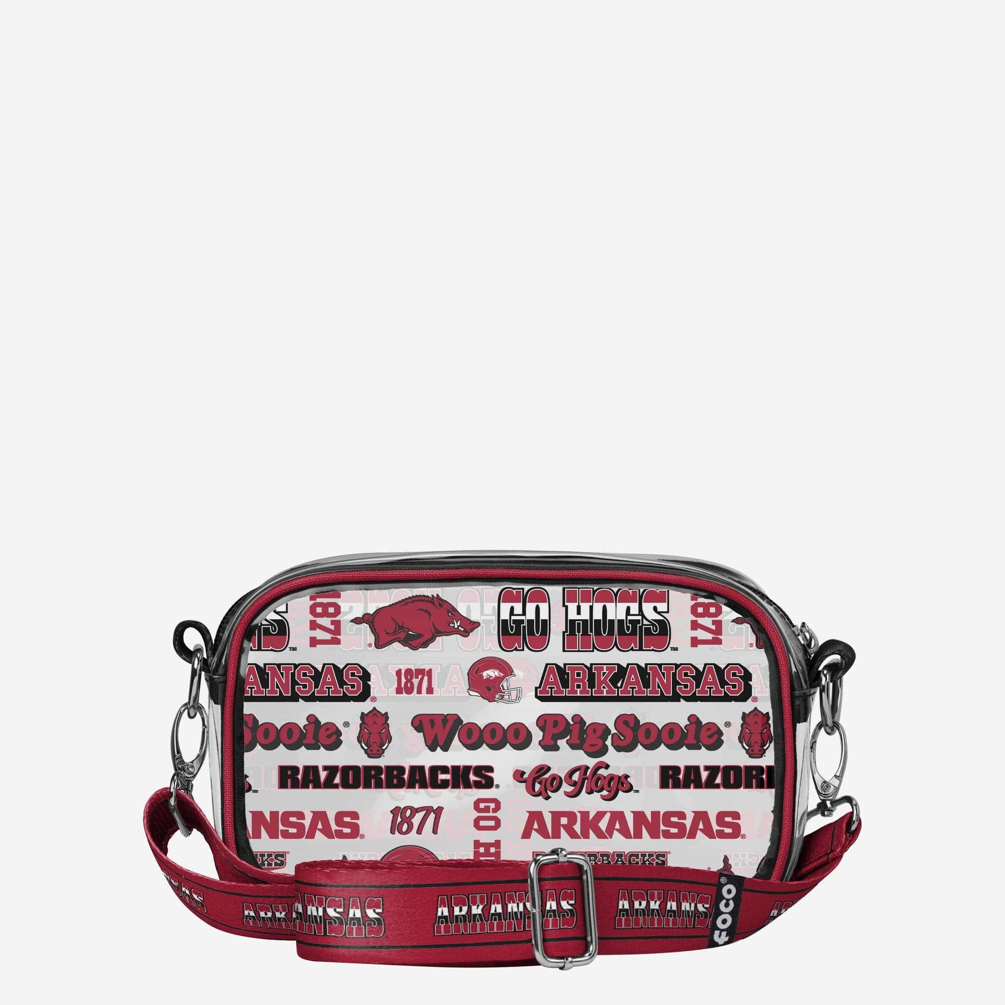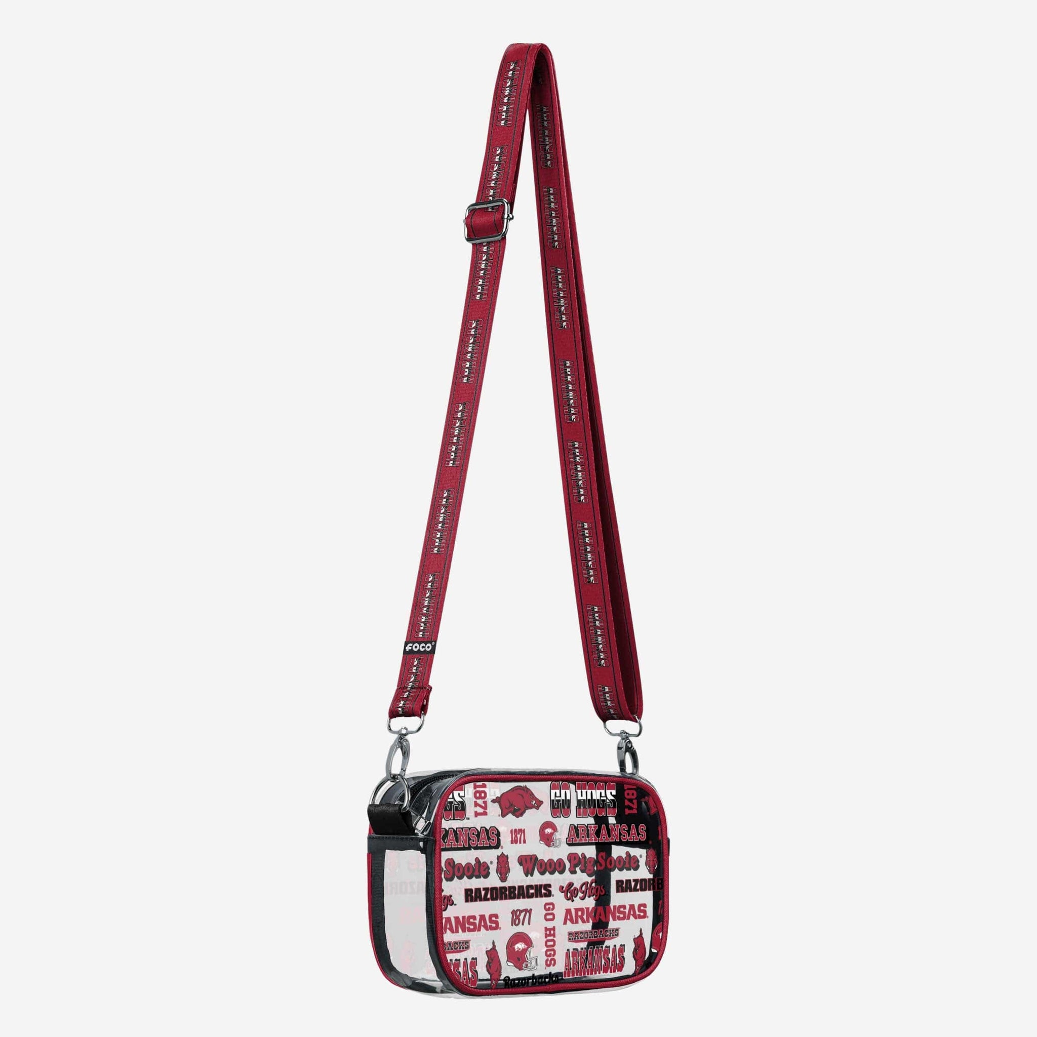 Over your shoulder and off to the game. Whether you're running errands on the town or running the tailgate in the parking lot, this Arkansas Razorbacks Repeat Retro Print Clear Crossbody Bag is the perfect way to carry the team like never before.