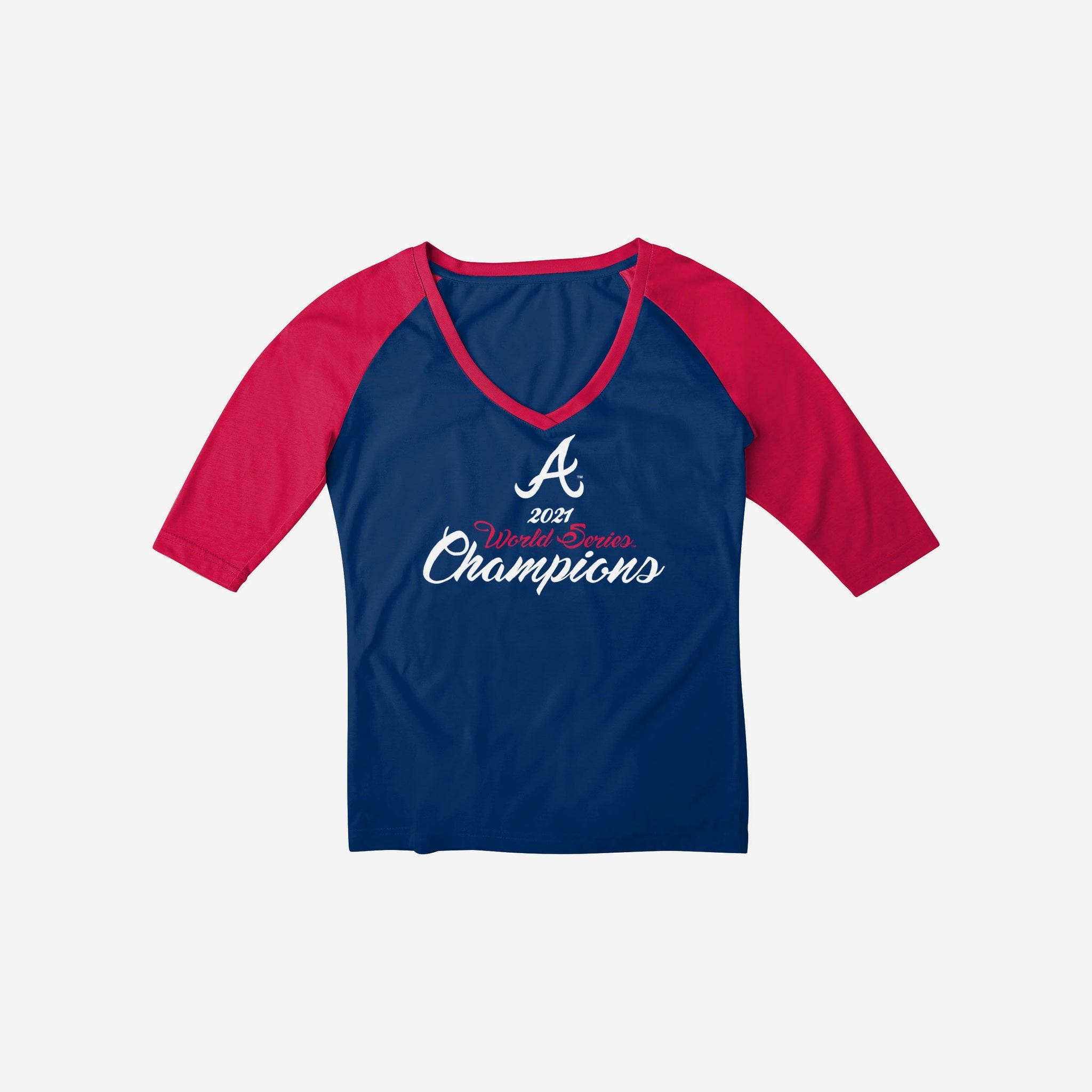 You fan like a champ. You're ready to celebrate like a champ. Now it's time to dress like a champ! Look as good as a championship victory feels by rocking this Atlanta Braves 2021 World Series Champions Women's V-Neck Raglan Shirt!