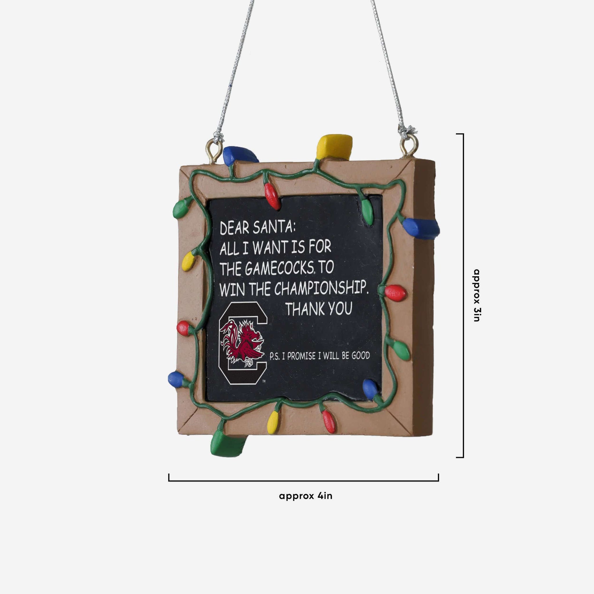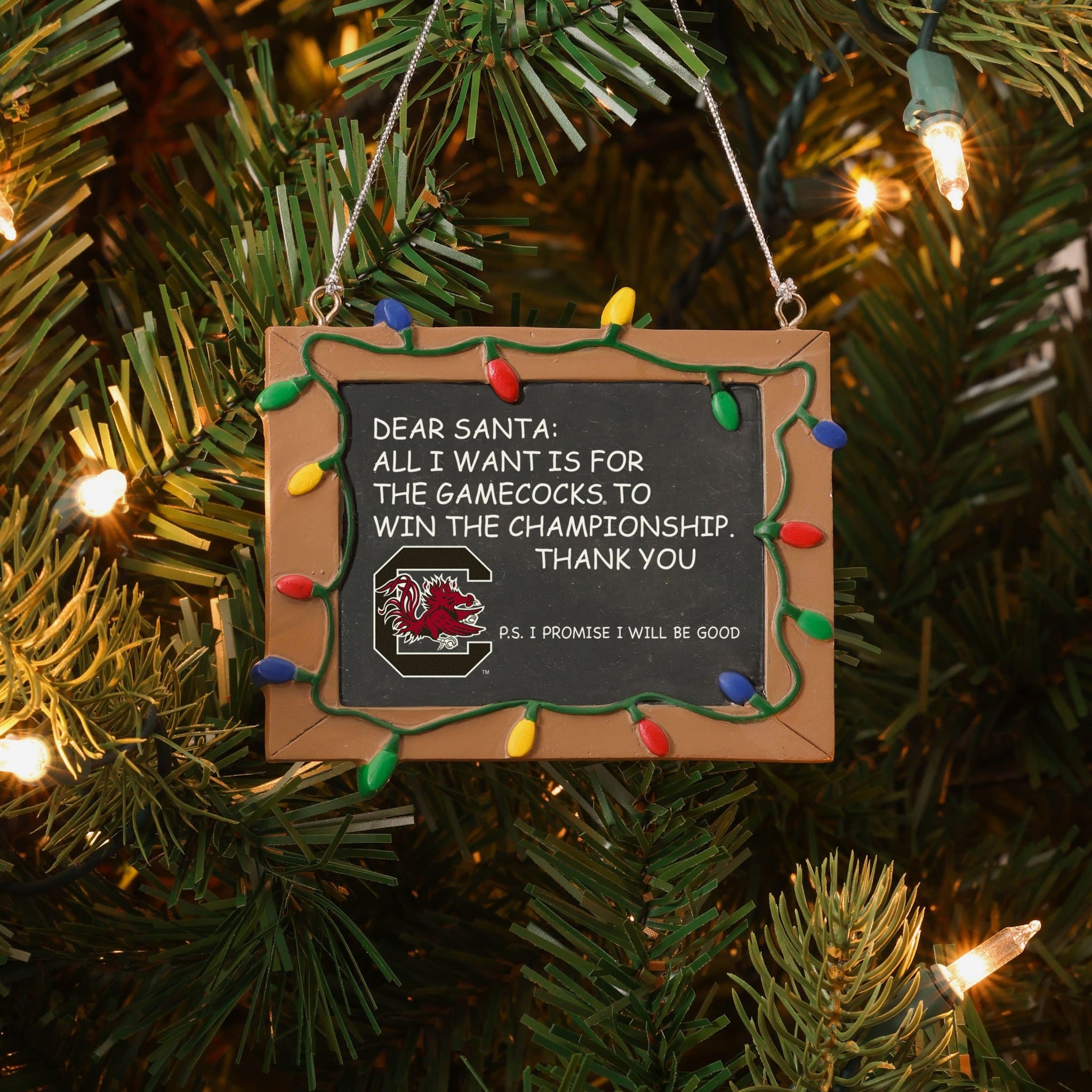 So, you made your list and sent it to jolly ol' Fanta Claus, asking him for a championship. But sometimes letters can get lost in the mail. Just in case, put this South Carolina Gamecocks Resin Chalkboard Sign Ornament on your tree to let him know how good you've been this year, and that all you want for the holidays is a trophy.