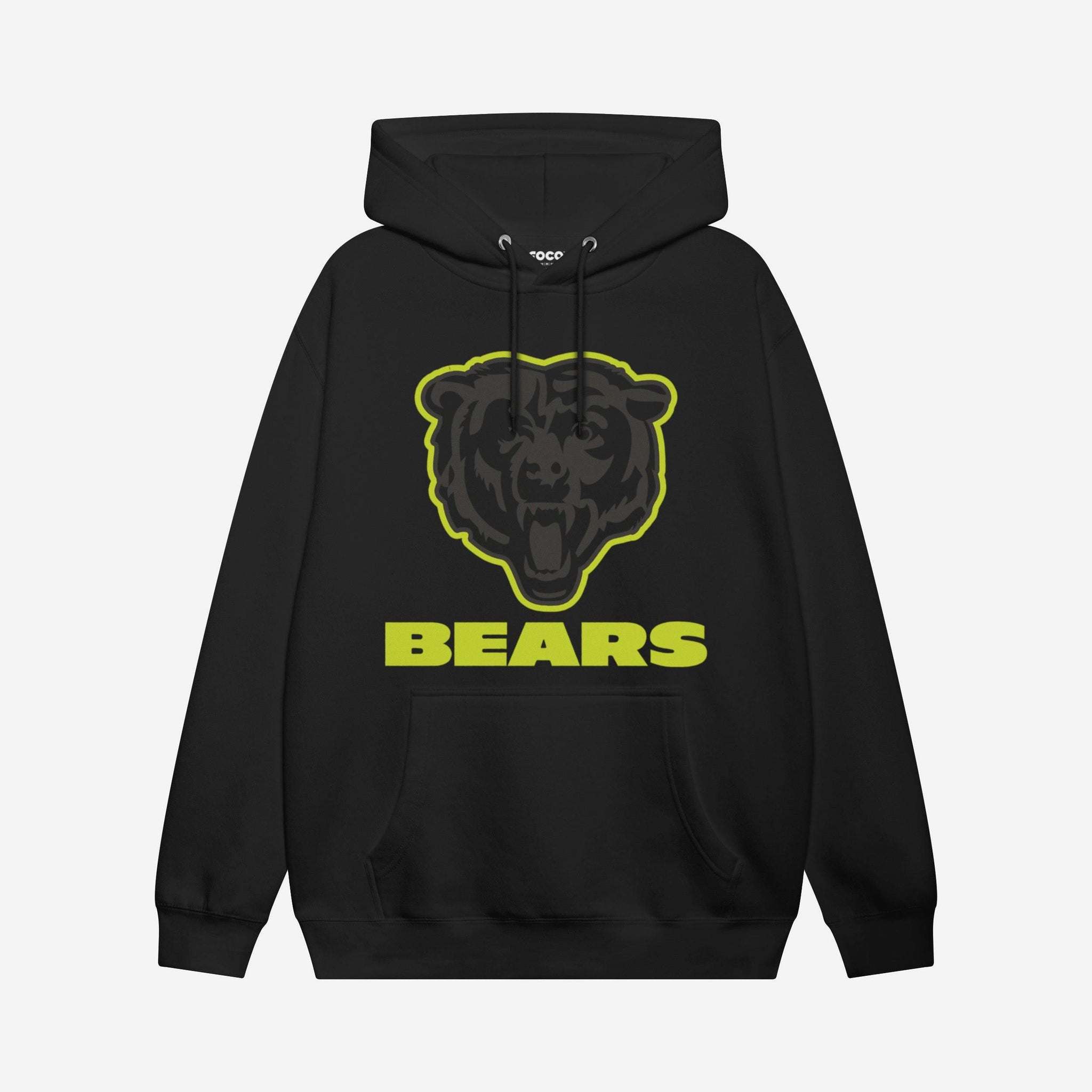 - Team logo display with highlight outline: The front of this apparel features a black Chicago Bears team logo display outlined in neon, and a neon team name display