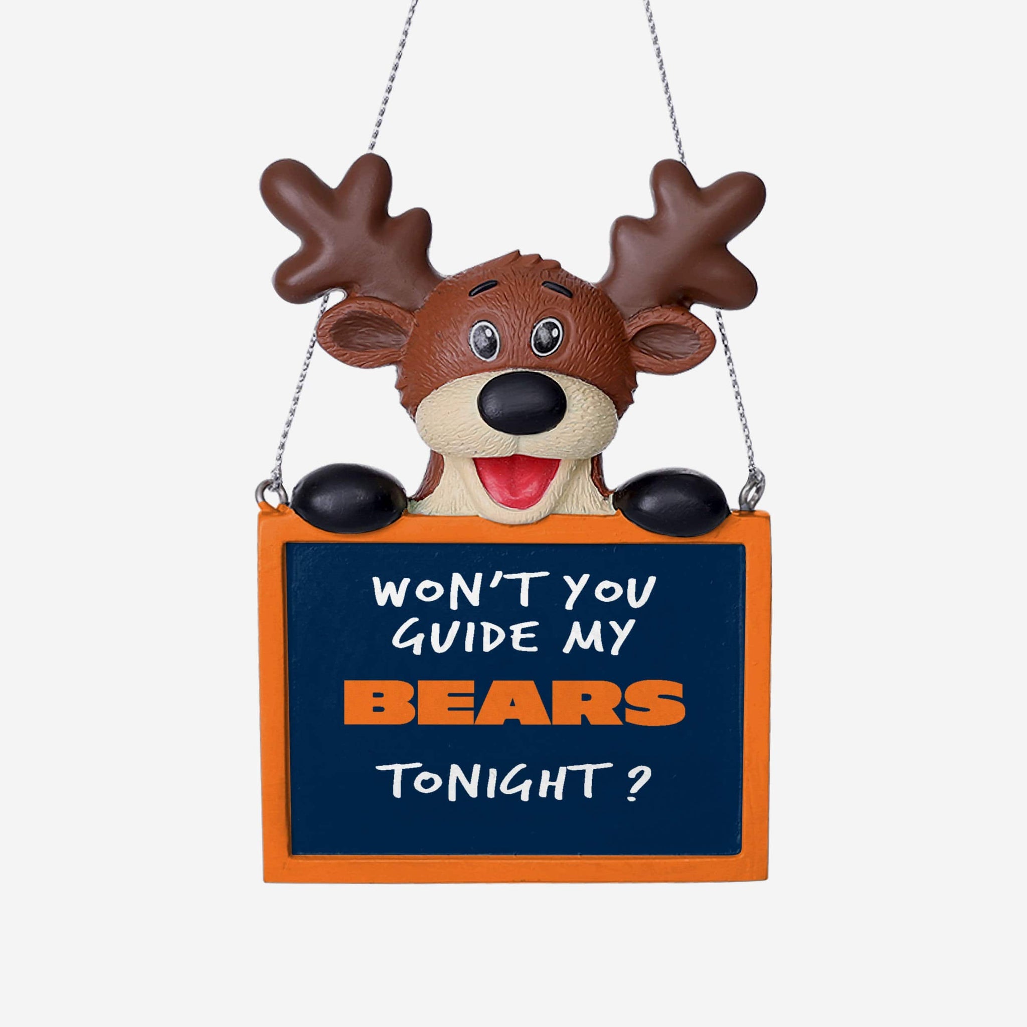 Tired: Dasher. Dancer. Prancer. Vixen. Wired: This Chicago Bears Reindeer with Sign Ornament.