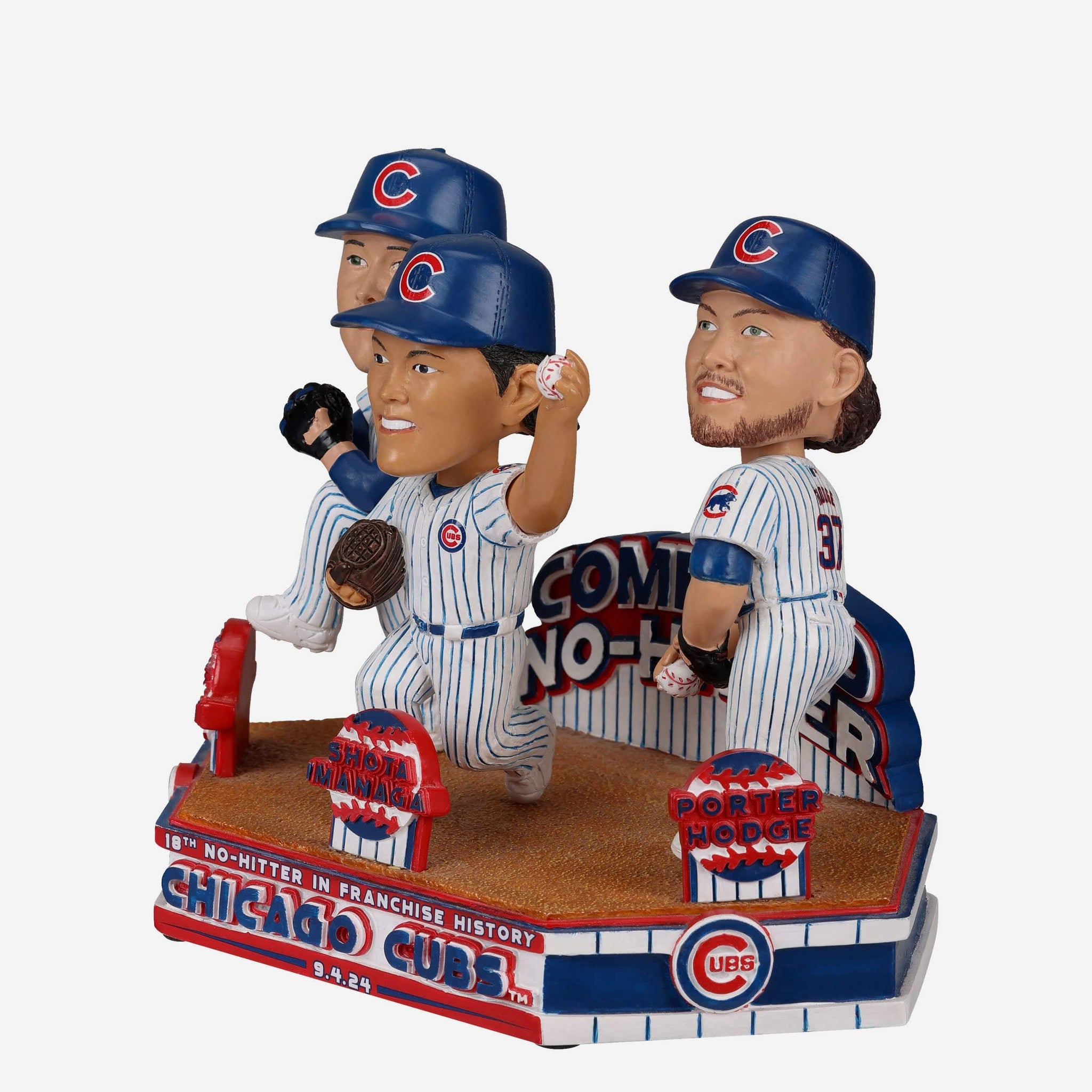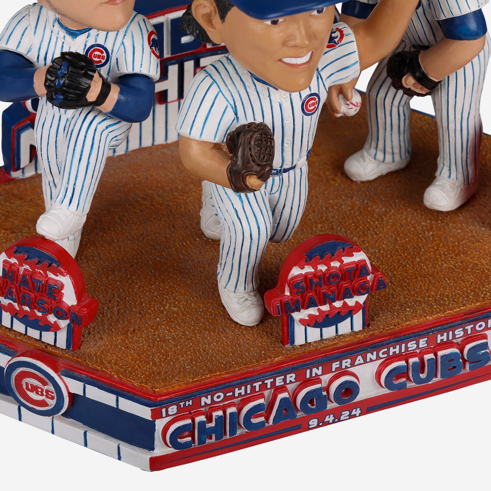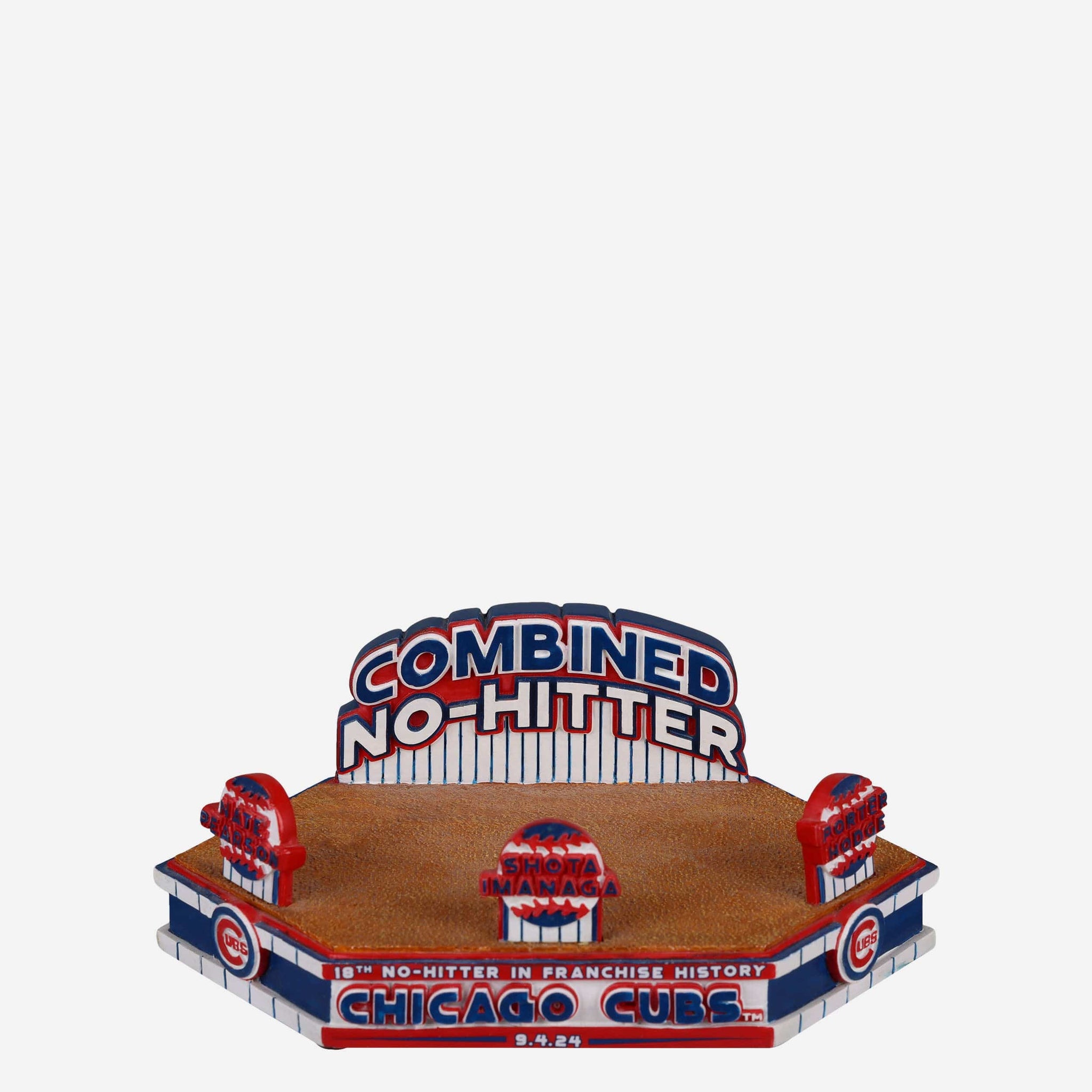 - “CHICAGO CUBS,” “18TH NO-HITTER IN FRANCHISE HISTORY,” and “9.4.24” text displays on front of base, so you never forget this moment