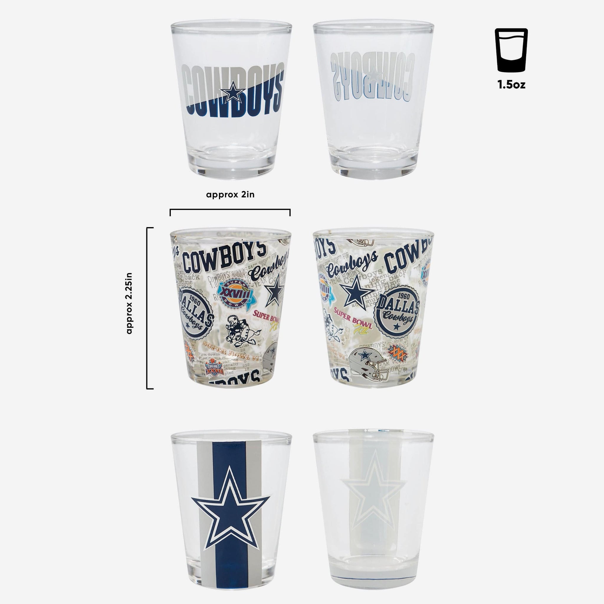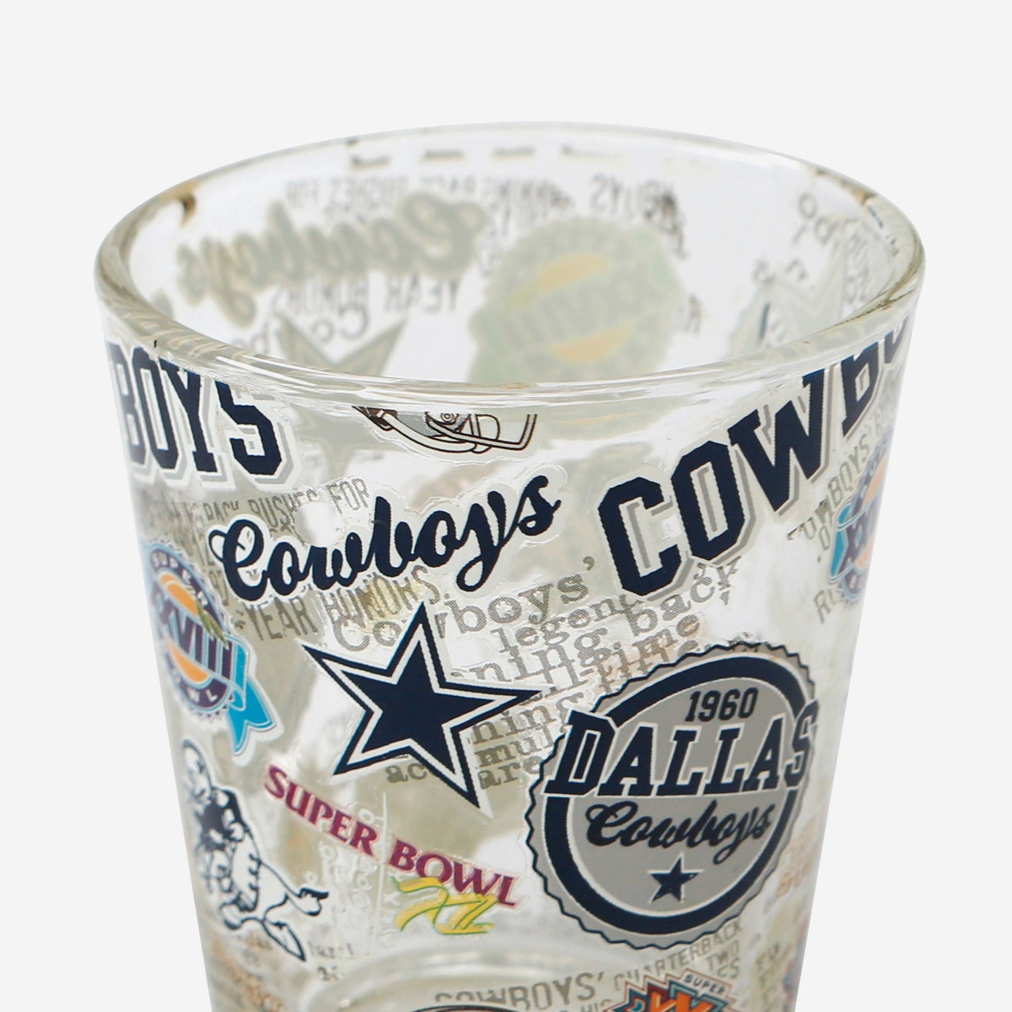 - Third glass features all-over repeat design with team logo displays and thematic team-specific elements throughout that will really get the party started