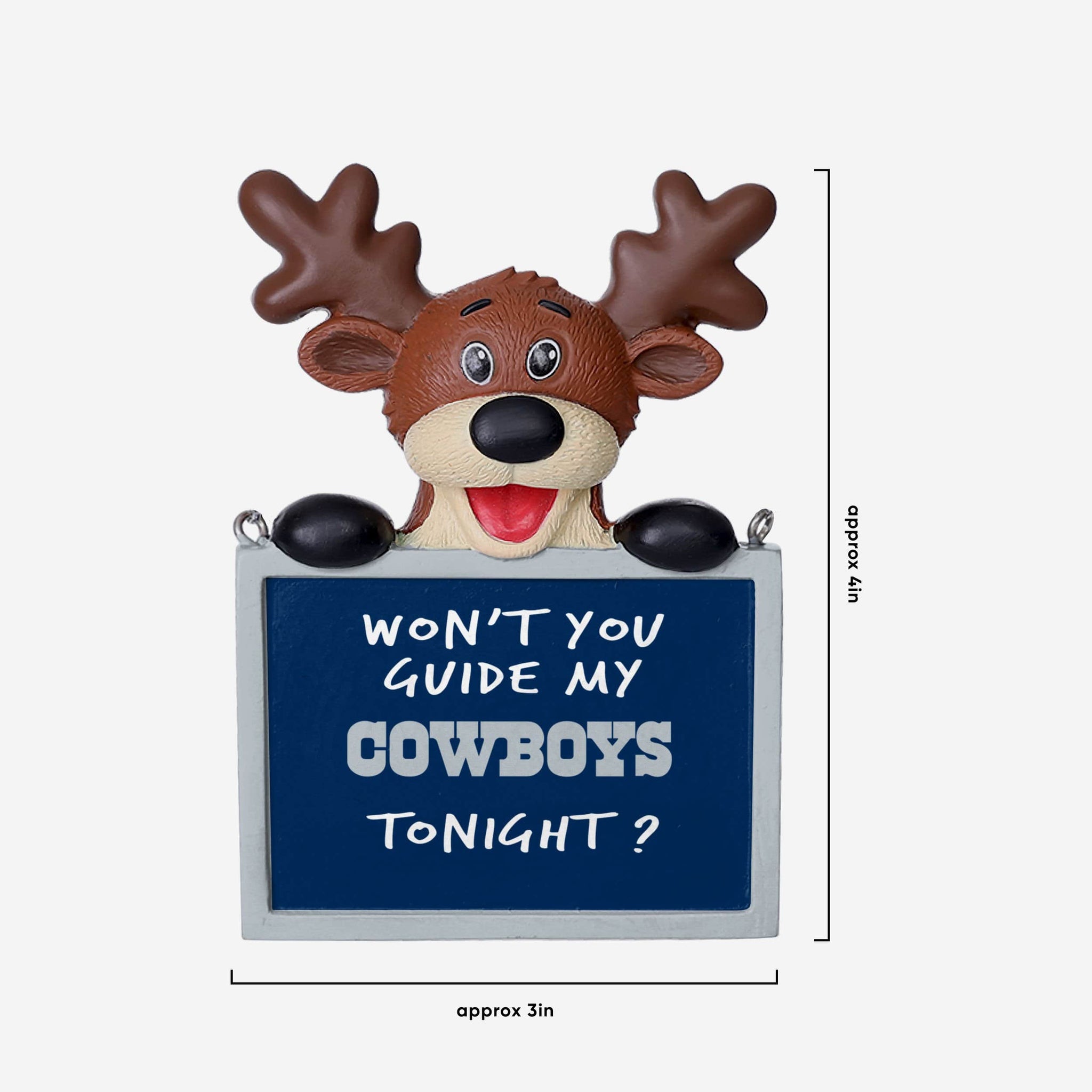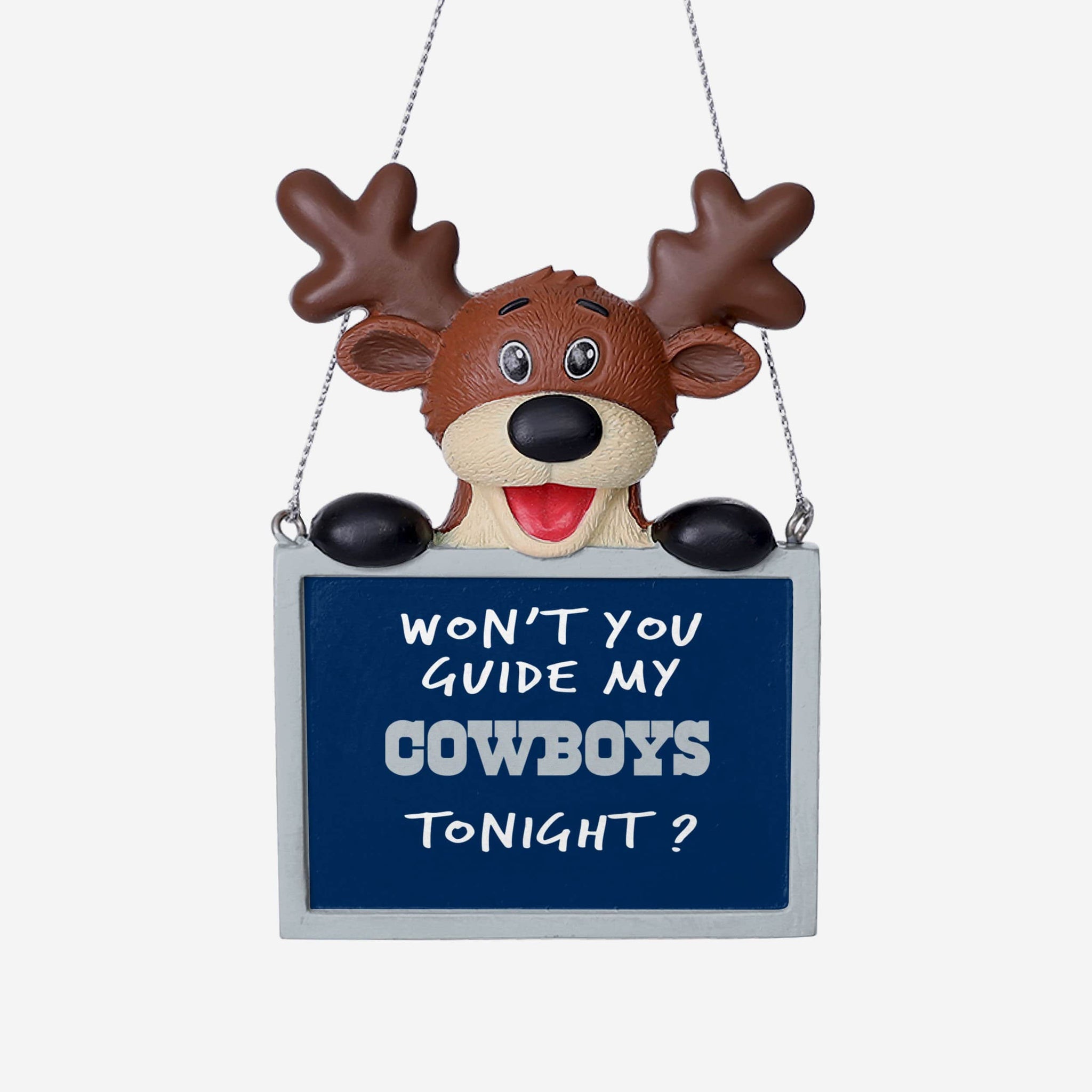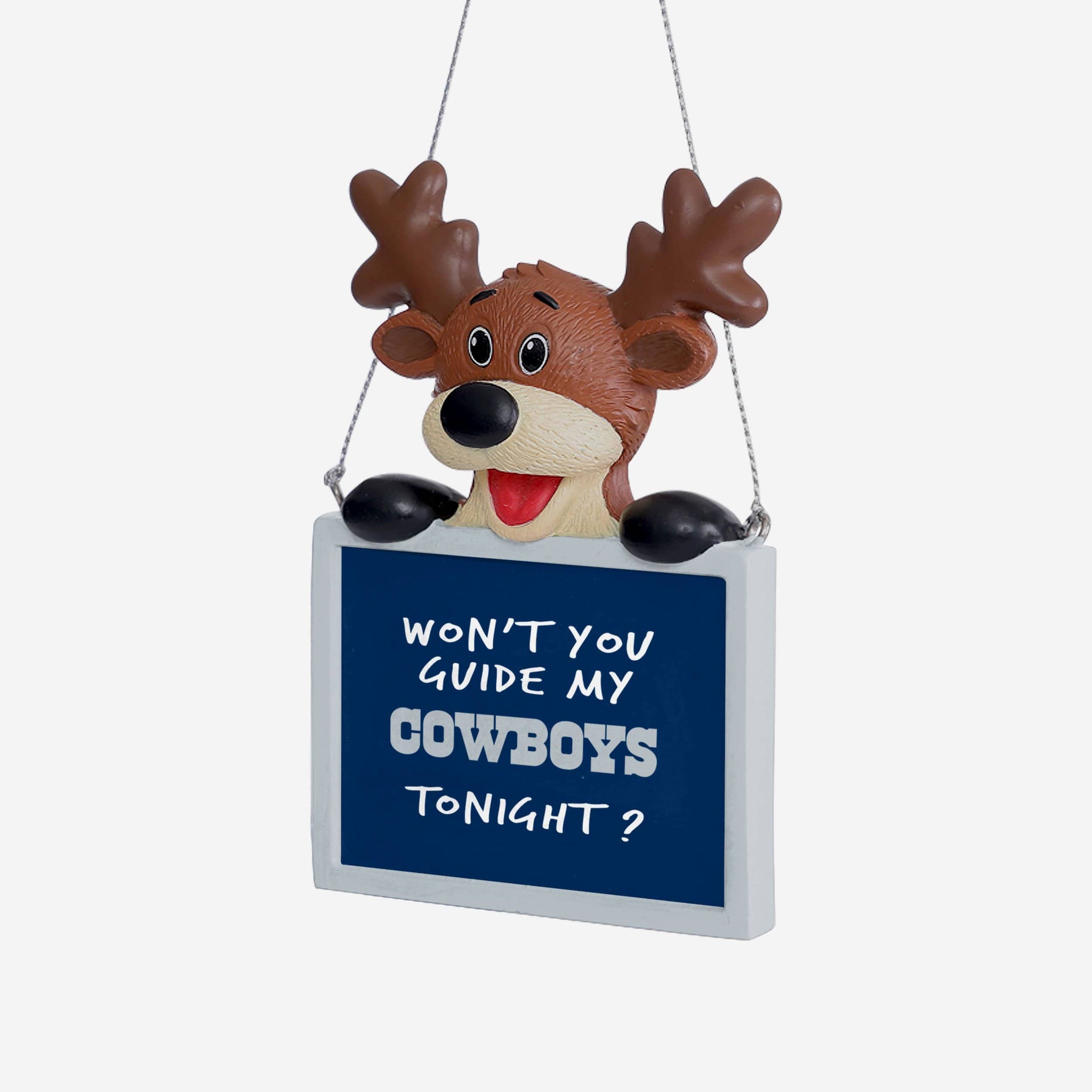 Tired: Dasher. Dancer. Prancer. Vixen. Wired: This Dallas Cowboys Reindeer with Sign Ornament.