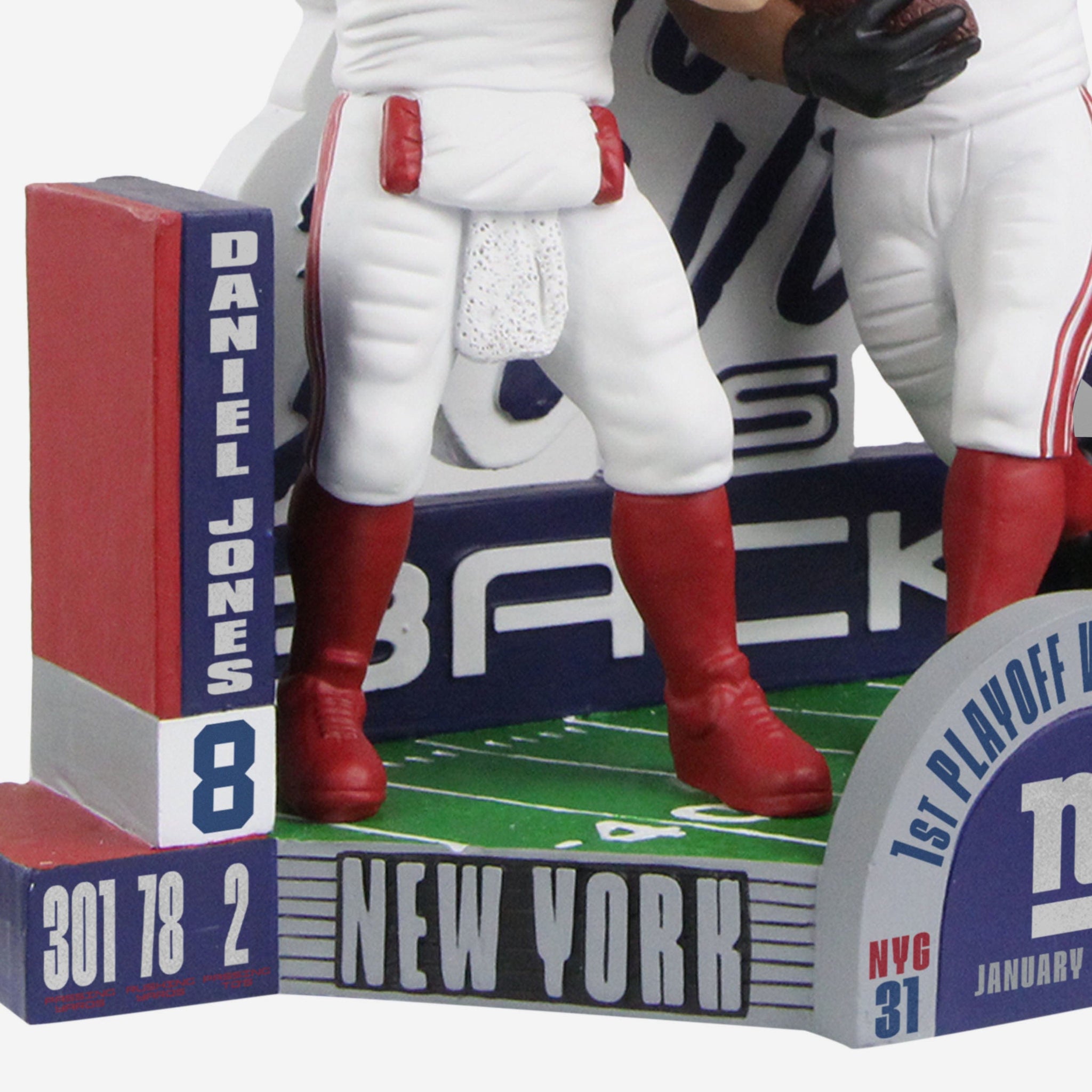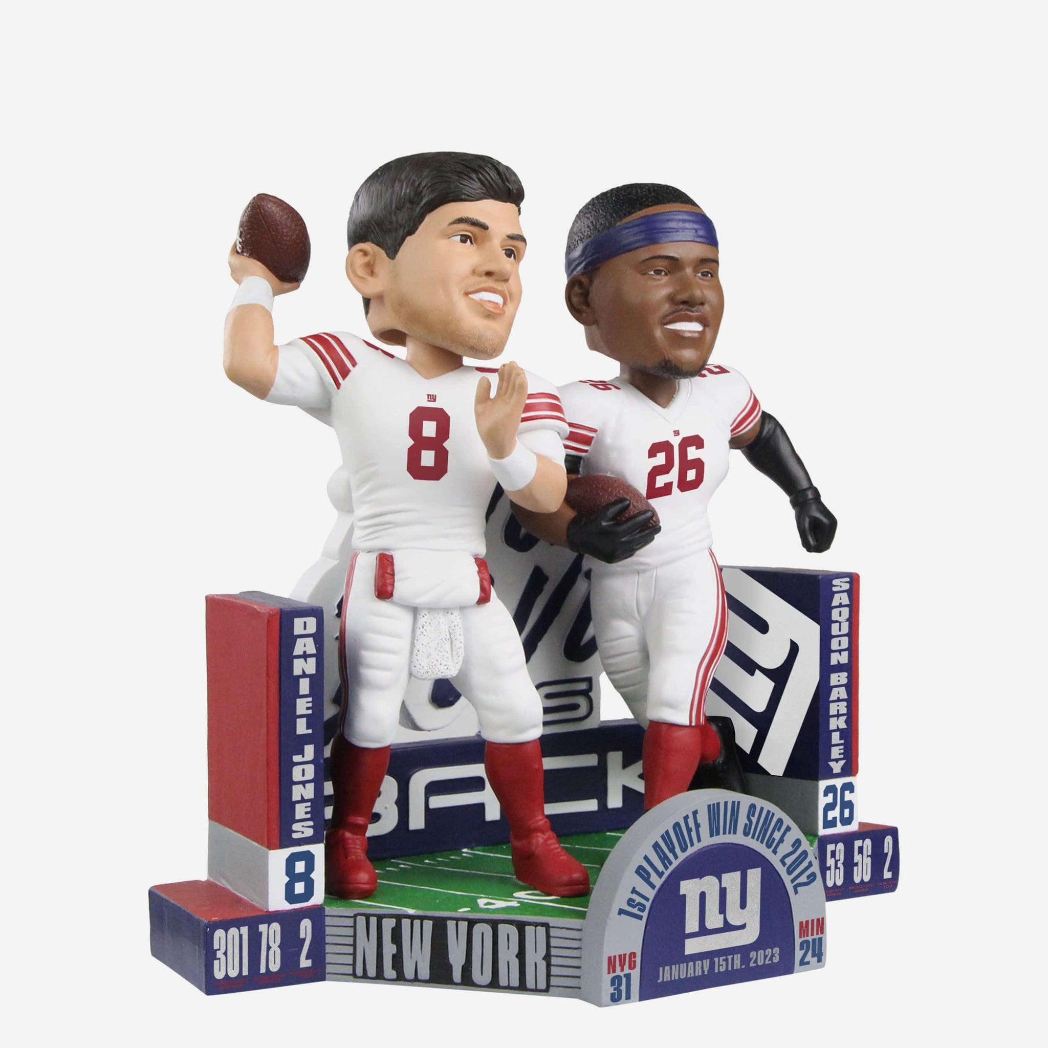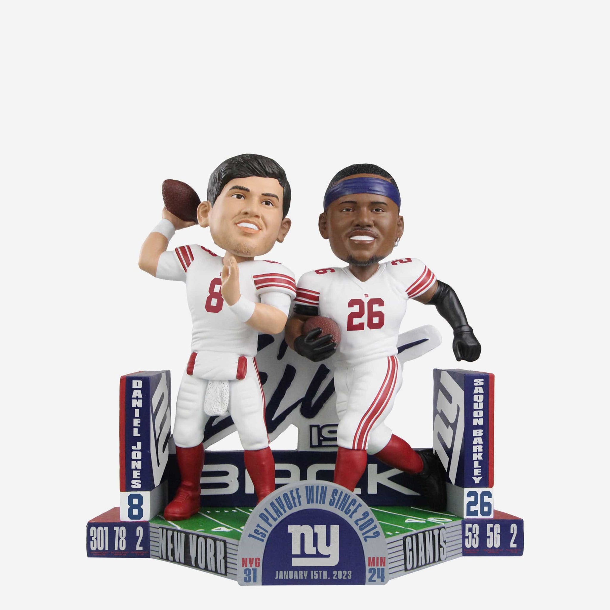 • Text displays on front of base showcasing Jones’ and Barkley’s stats from the Giants’ Wild Card Round victory, and the numbers never lie