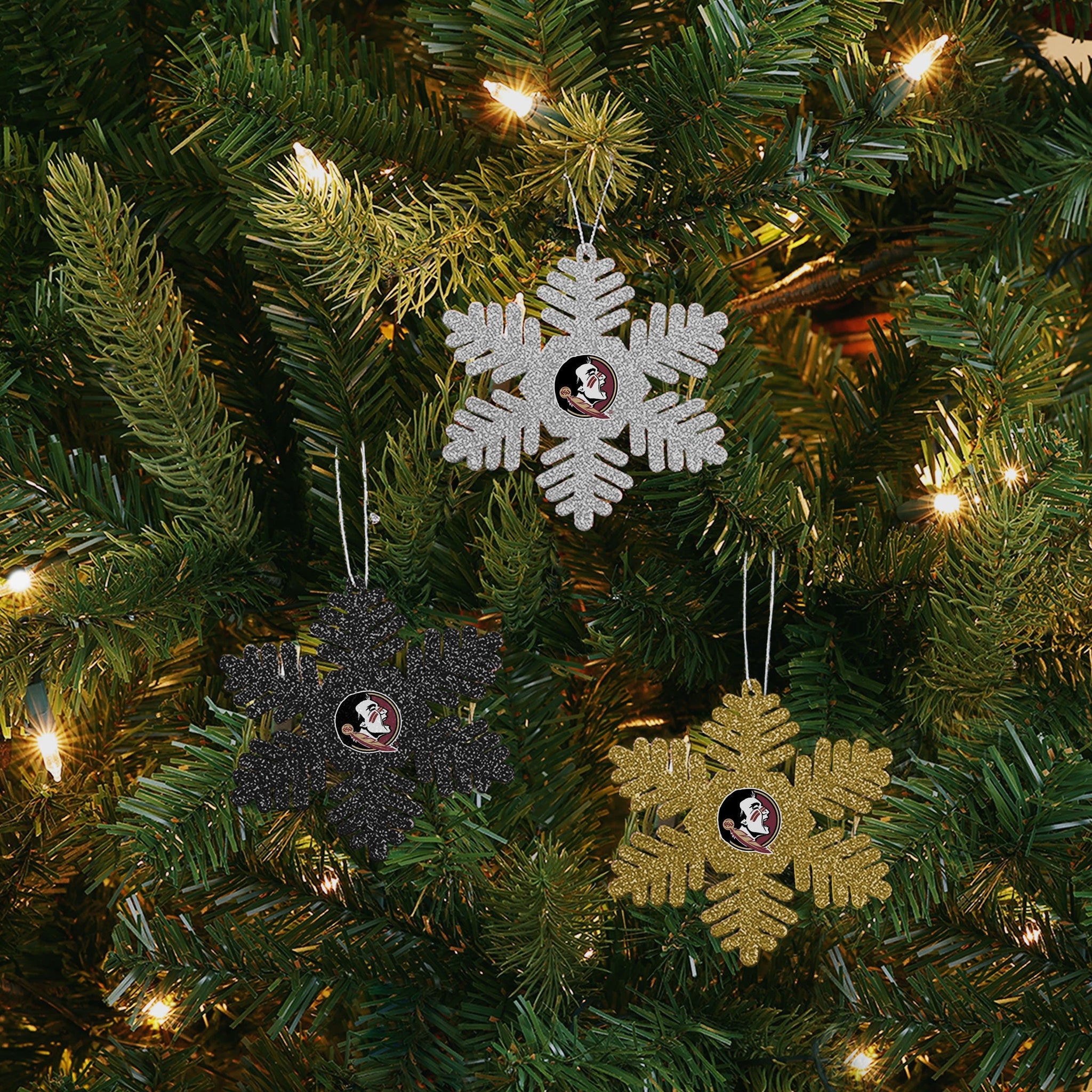 One half "Let it Snow", one half "Go Team Go!" This holiday season, let your team spirit AND holiday spirit shine by proudly displaying this Florida State Seminoles 3 Pack Metal Glitter Snowflake Ornament!
