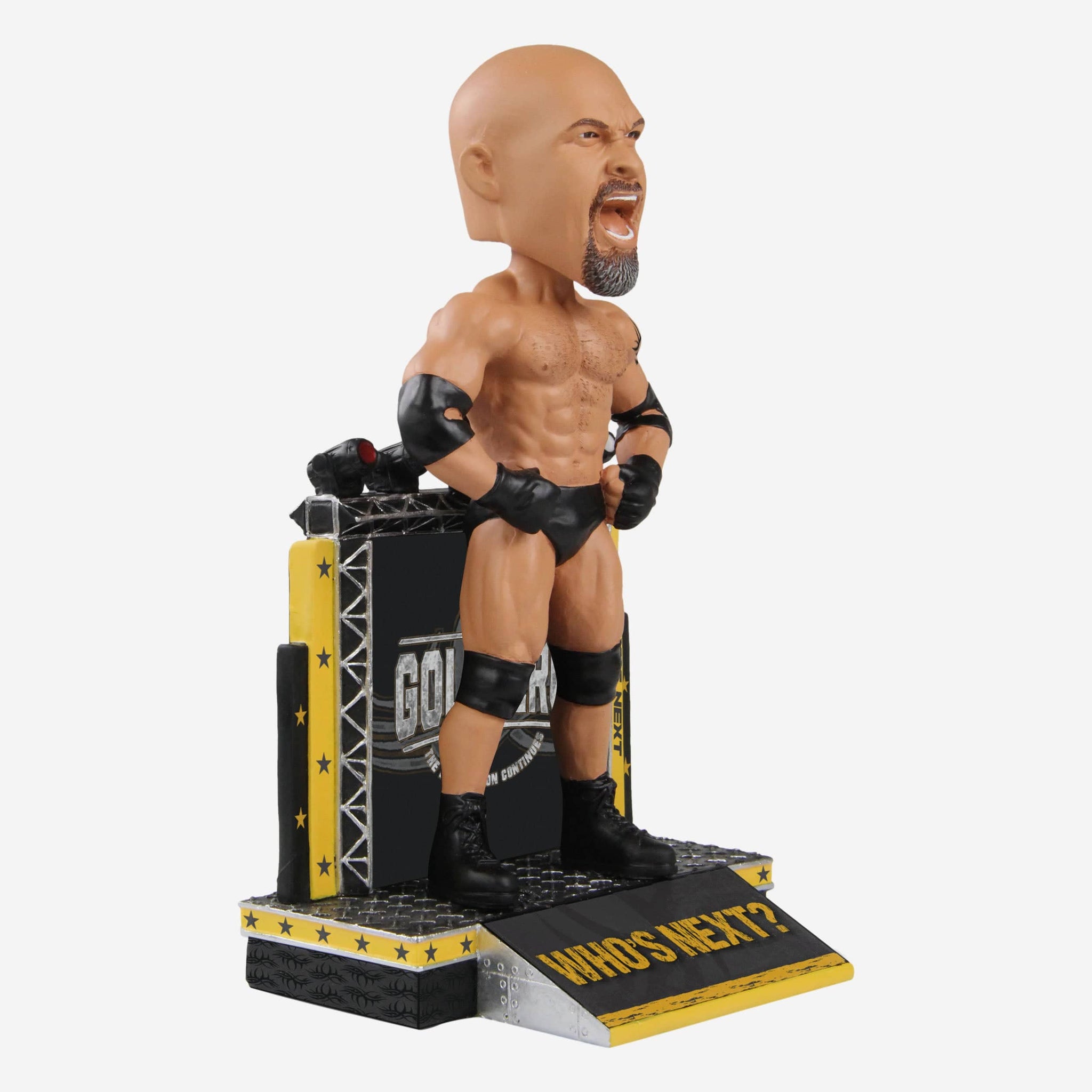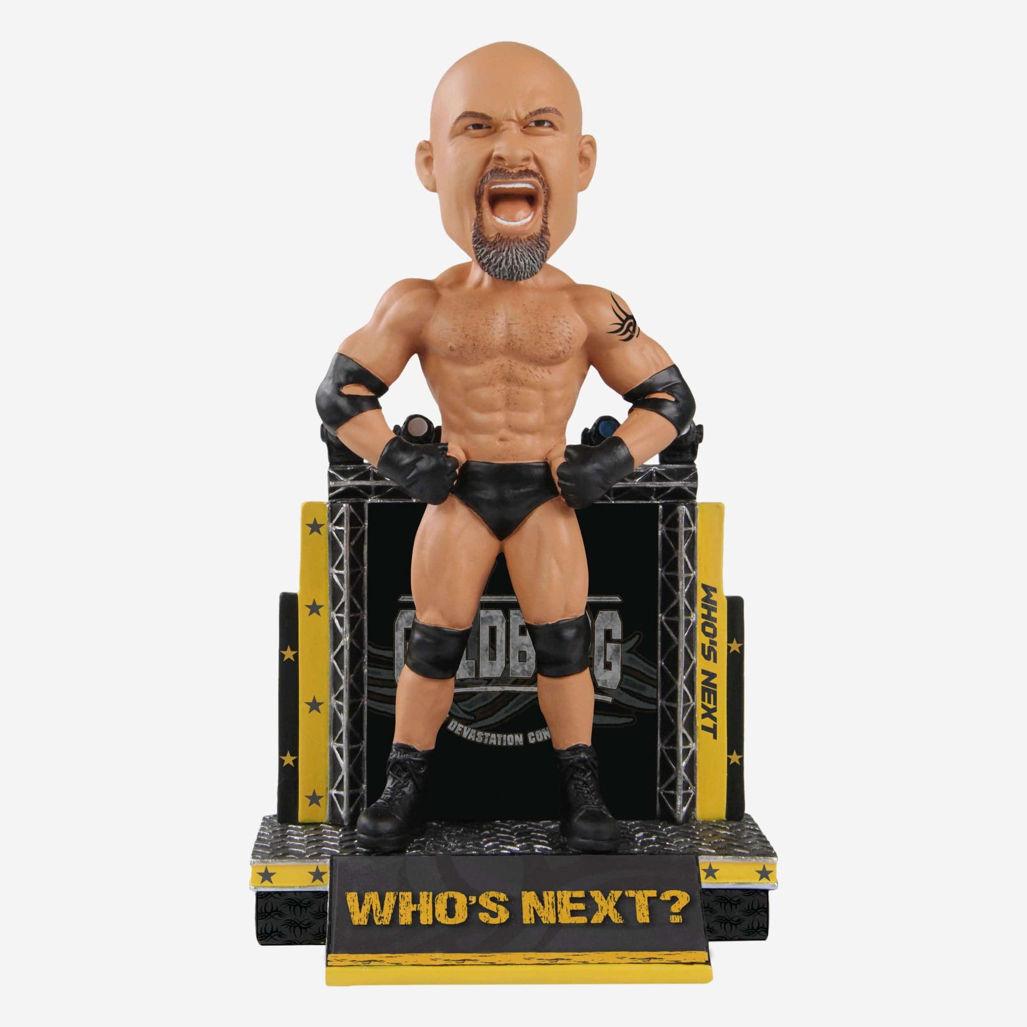 Question: Who's next for your collection? Answer: GOOOOOOLDBERG! GOOOOOOLDBERG! Introducing the Goldberg WWE Bobblehead.