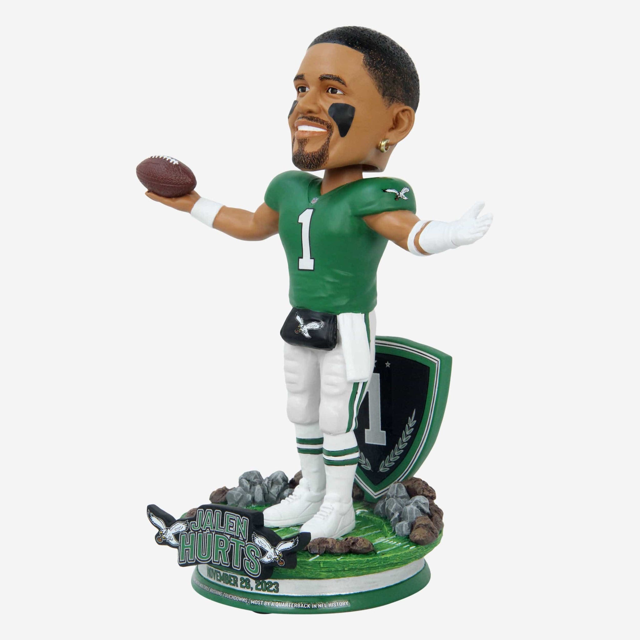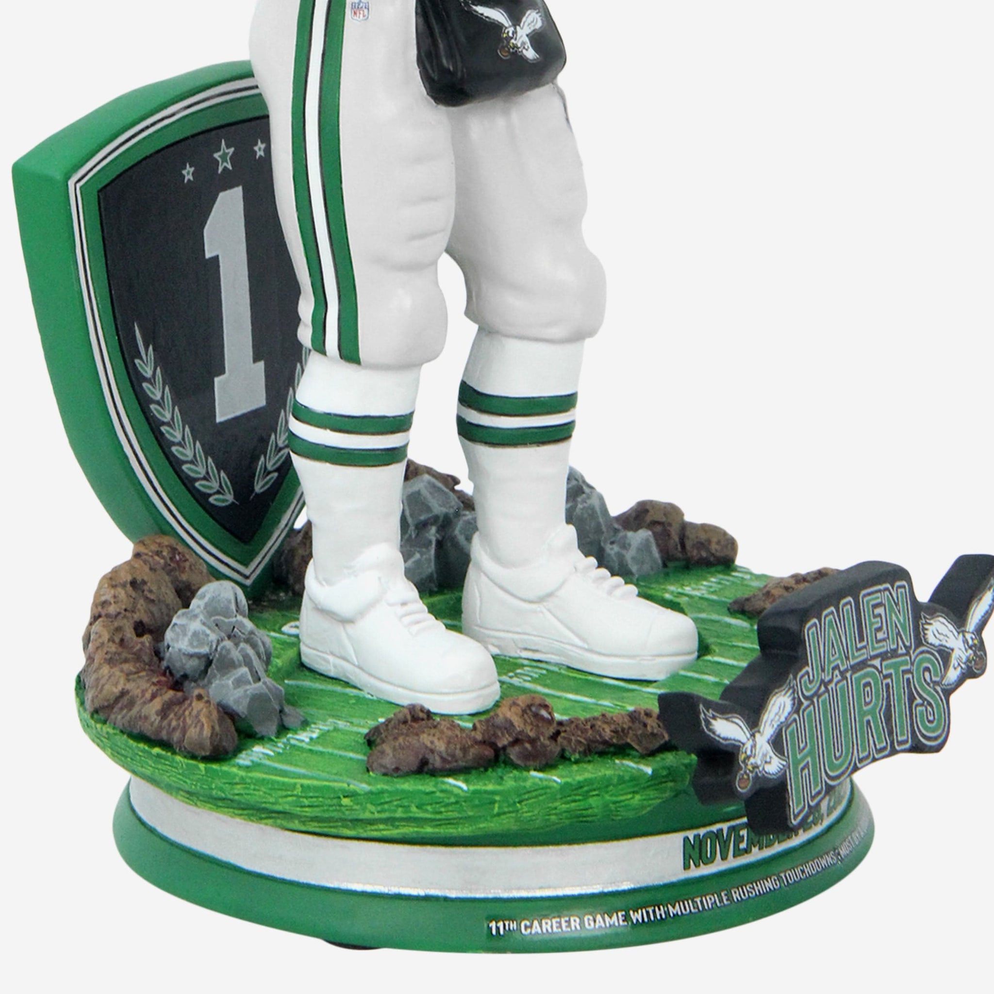 - “NOVEMBER 26, 2023” and “11TH CAREER GAME WITH MULTIPLE RUSHING TOUCHDOWNS IS NOW MOST BY A QUARTERBACK IN NFL HISTORY” text displays on front of base to celebrate his historic performance