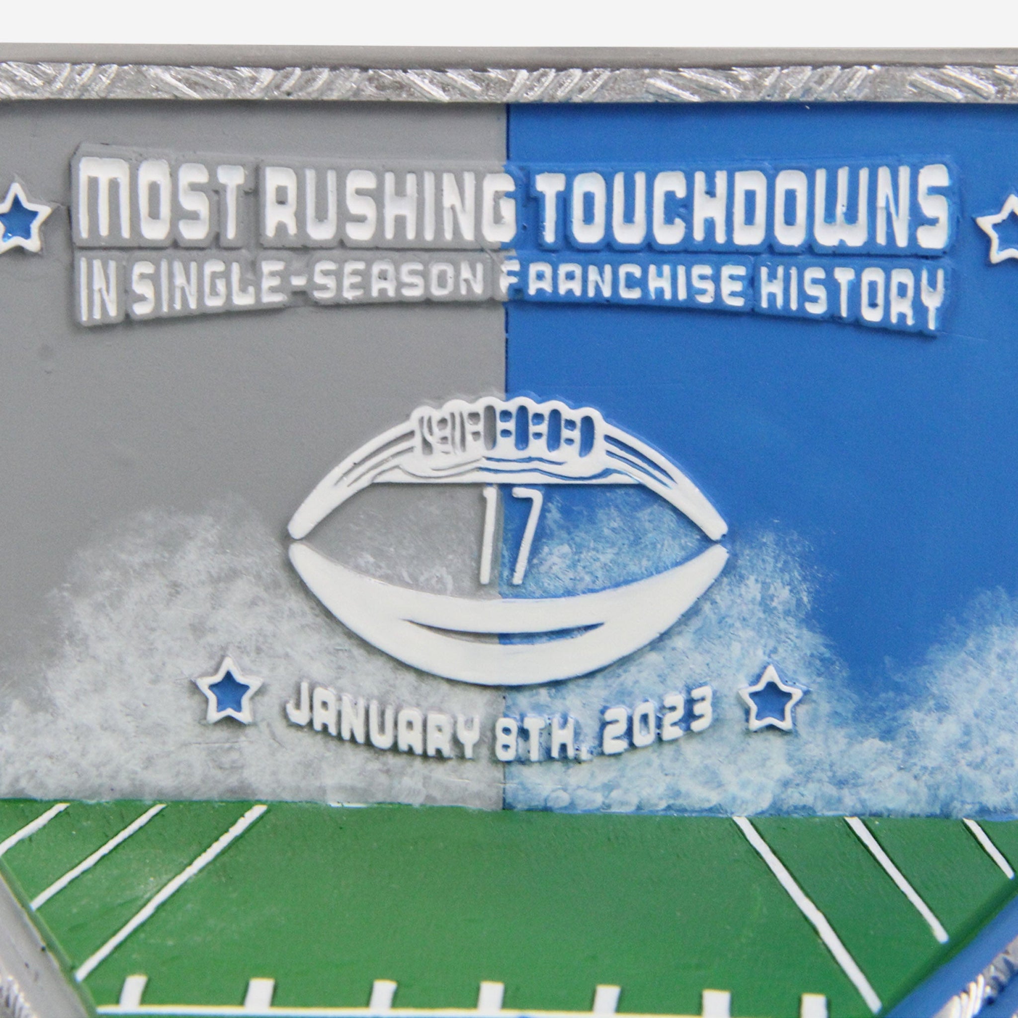 - Thematic, team-colored backdrop with 17 football accent and MOST RUSHING TOUCHDOWNS IN SINGLE-SEASON FRANCHISE HISTORY text display to immortalize his incredible campaign