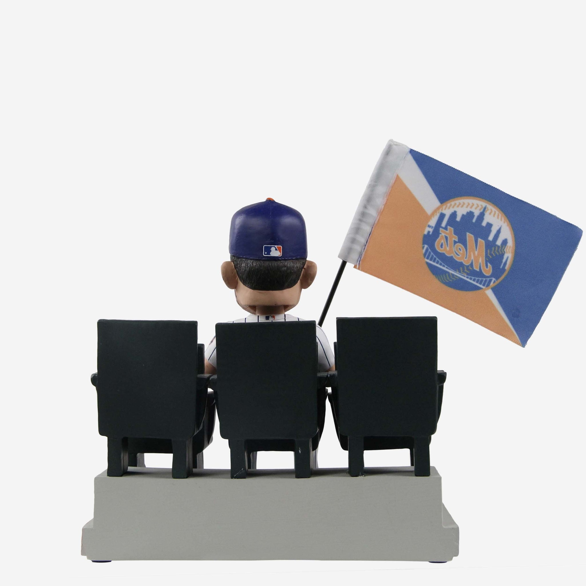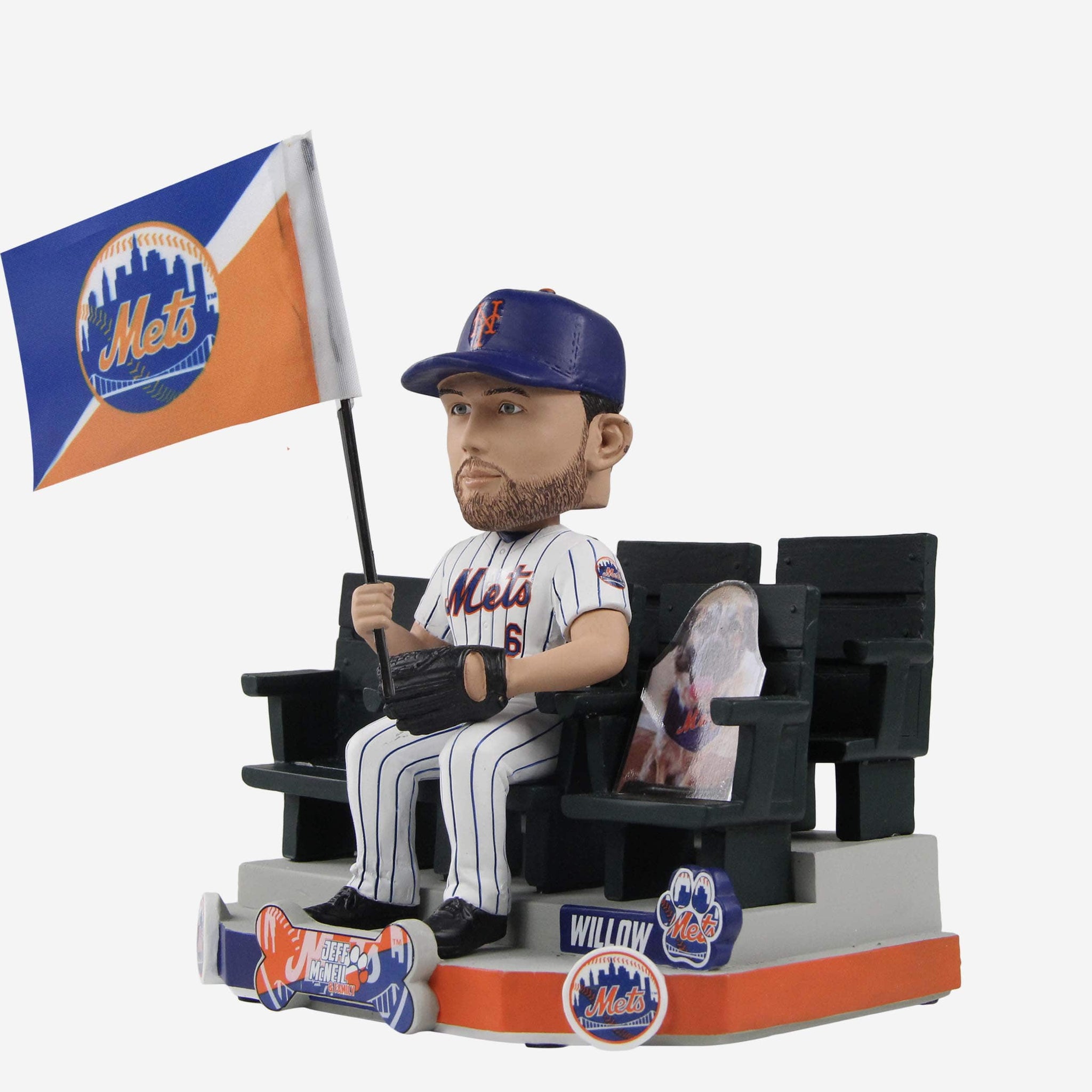 - Portrays McNeil sitting in a stadium seat next to a cutout of his dog while holding a team logo flag, always repping the Mets