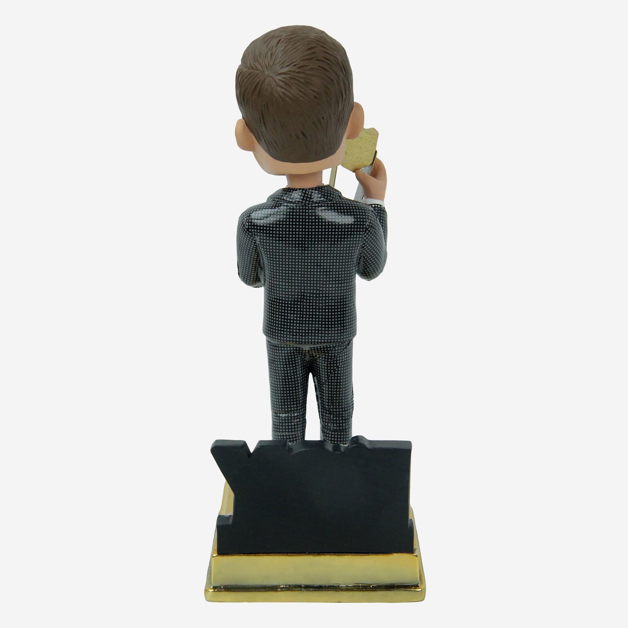 • Portrays Flacco posing in a suit and holding a trophy, showing off some hard-earned hardware