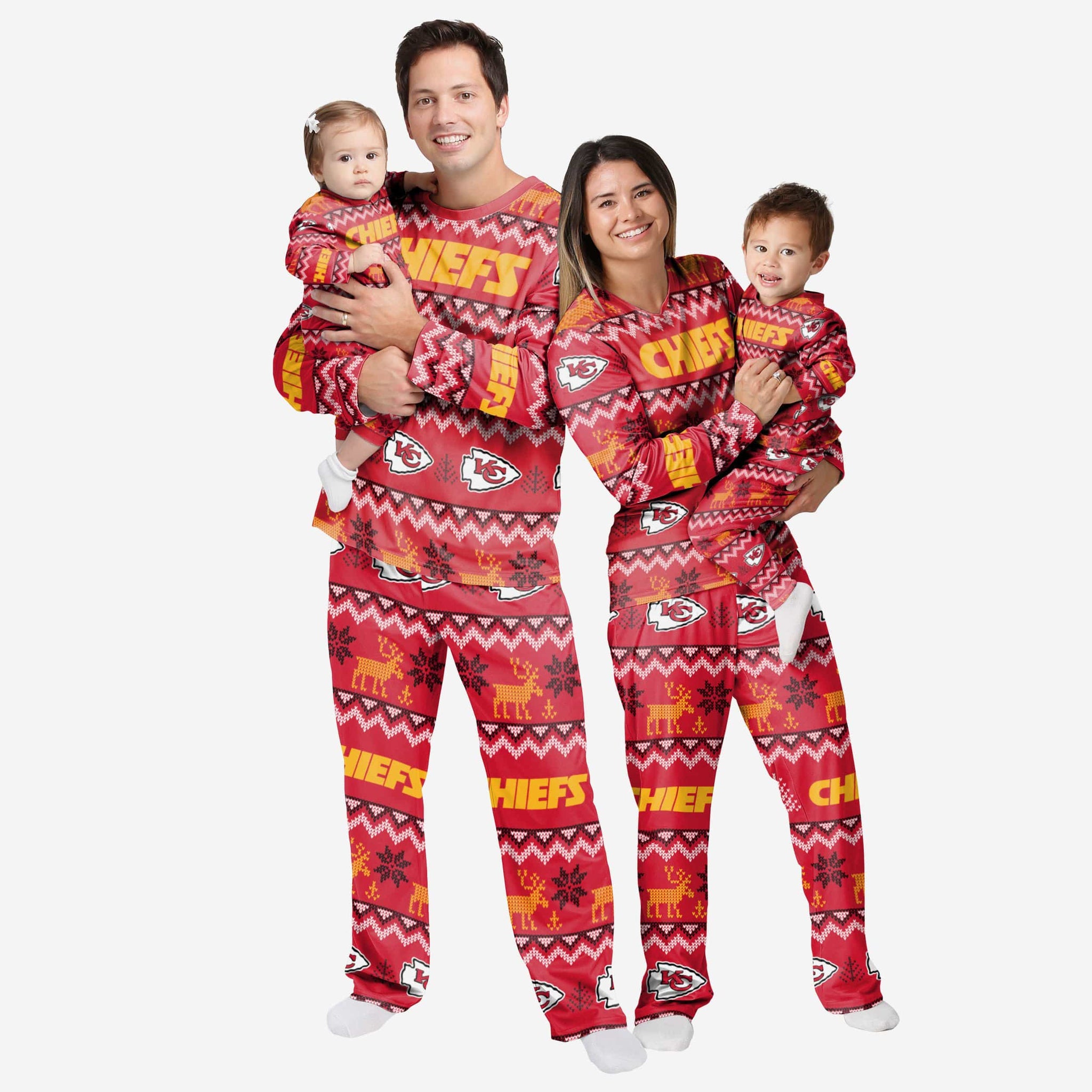 Get your young fan started early this holiday season in these Kansas City Chiefs Infant Ugly Pattern Family Holiday Pajamas! Your baby will absolutely love these matching Christmas pajamas! Make sure your infant enjoys sweet dreams filled with holiday joy by having them sleep in infant pajamas. Don’t forget to take your holiday photo with the whole family wearing matching Christmas pajamas!