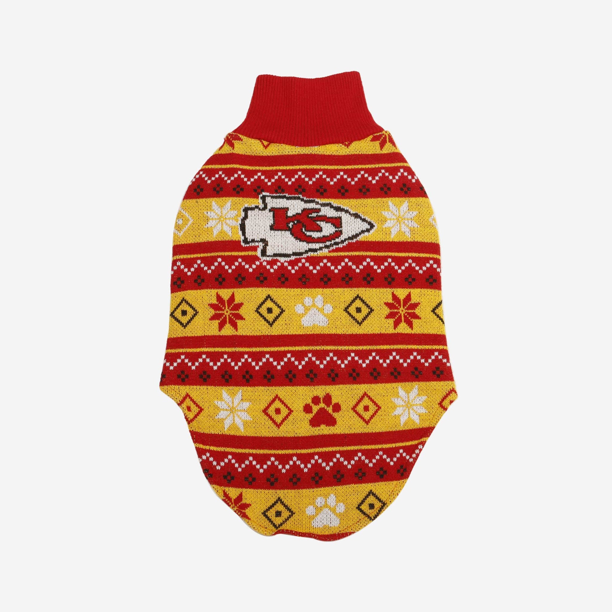 Show off your pet's holiday spirit with this dog sweater! Your good boy (or girl) will love this Kansas City Chiefs Knitted Holiday Dog Sweater so much, they'll be saying "woof bark awooo" (that's "thank you" in pup language). Don't forget to match your canine's sweater with a set of matching holiday pajamas!