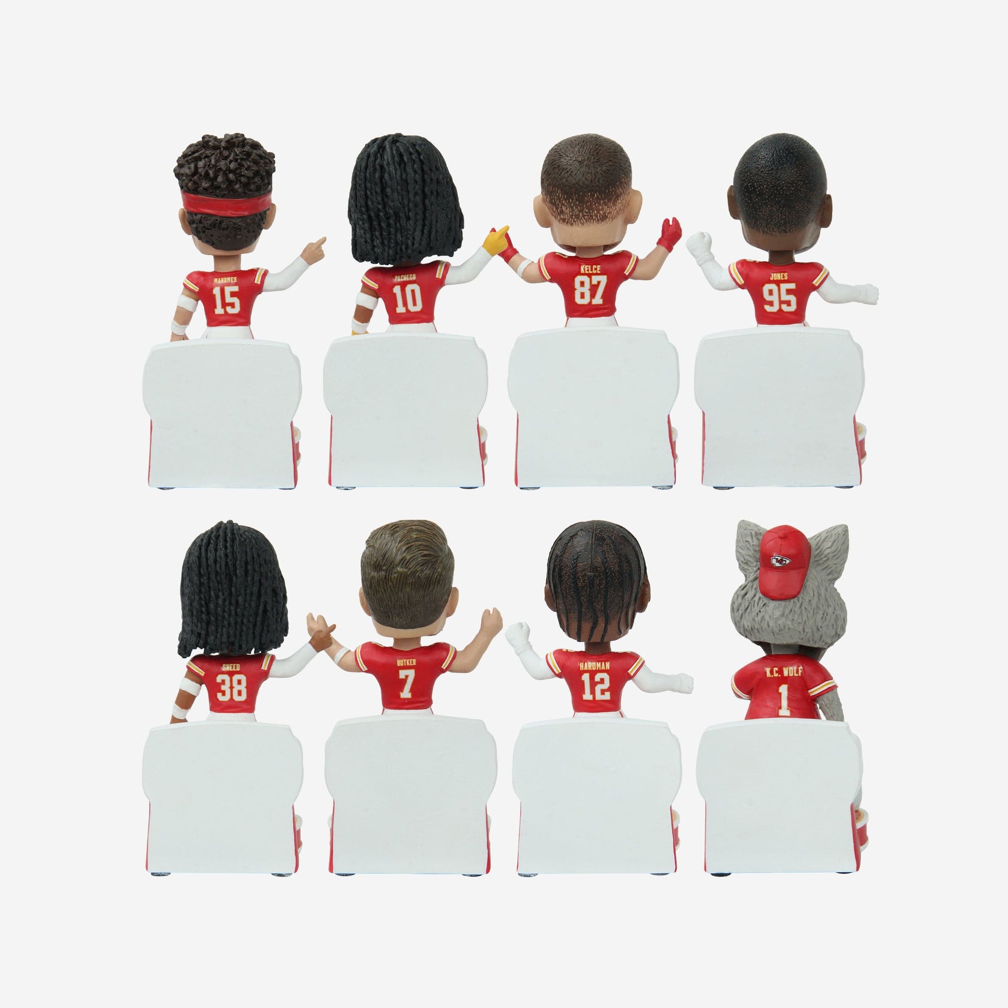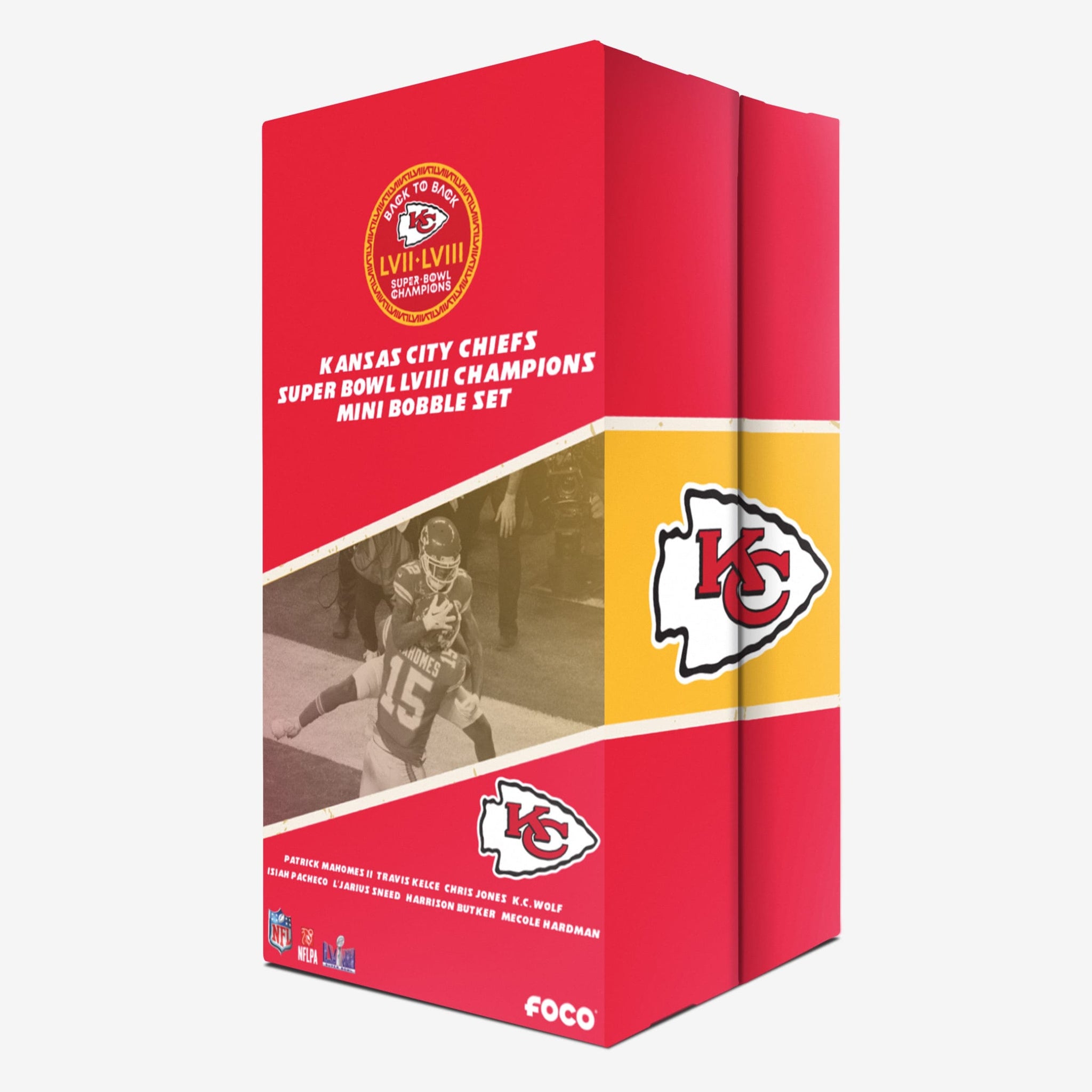 Mahomes. Kelce. Jones. Pacheco. Sneed. Butker. Hardman. K.C. Wolf. Get ready to celebrate the Super Bowl Champions in miniature fashion with the Kansas City Chiefs Super Bowl LVIII Champions Mini Bobblehead Boxed Set.
