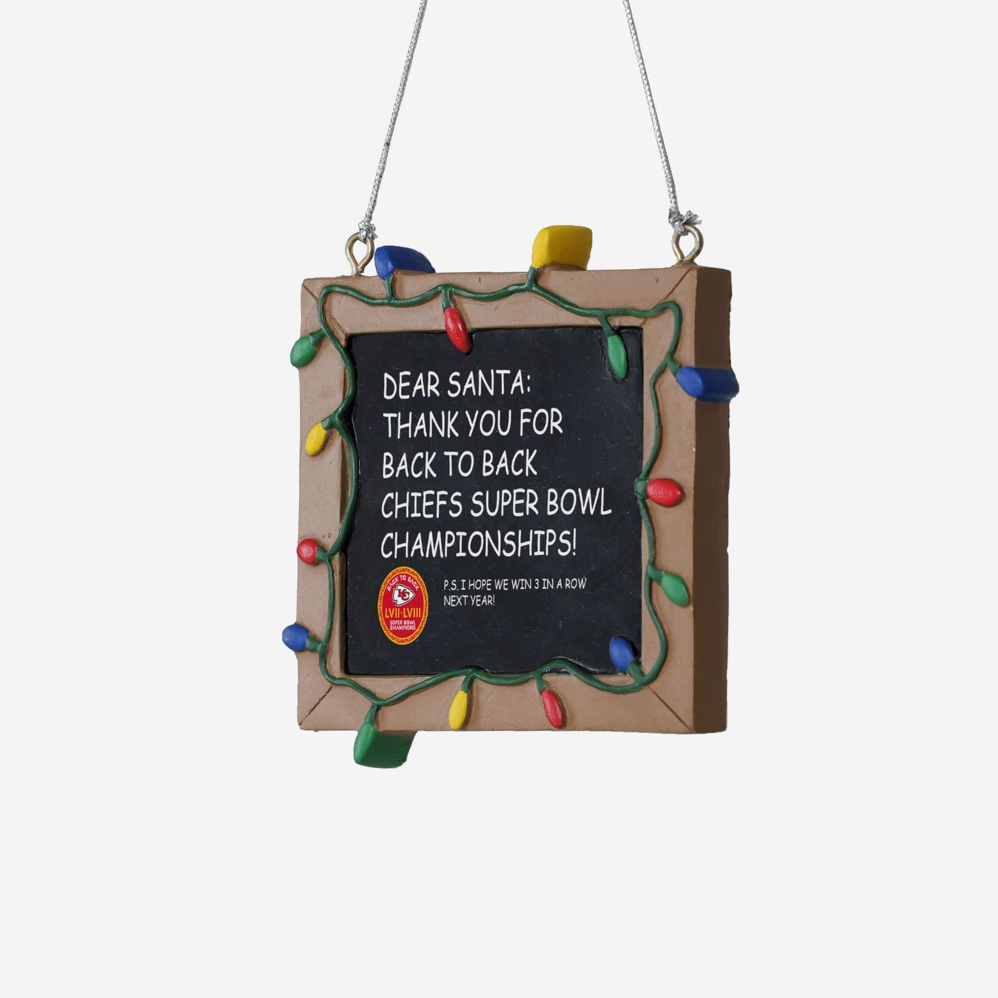 Tis the season to celebrate a Super Bowl championship (it's the season that never ends). Deck the halls with some championship greatness by hanging up this Kansas City Chiefs Super Bowl LVIII Champions Chalkboard Sign Ornament.