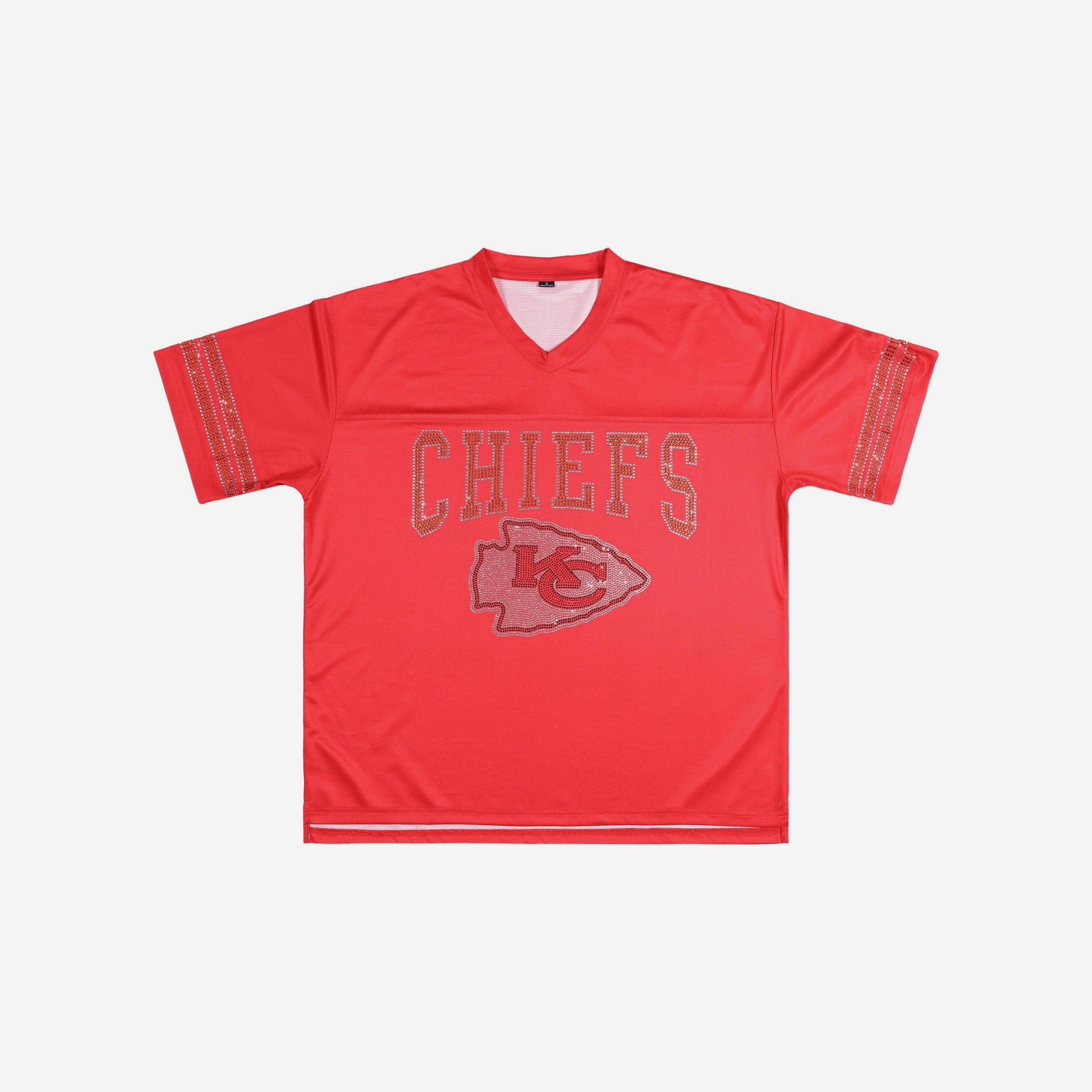 Bring the energy and let your team pride shine. The Kansas City Chiefs Womens Rhinestone Logo Oversized V-Neck Mesh T-Shirt is built for fans who want to stand out while staying comfortable. With a breathable jersey mesh build, bold rhinestone team graphics, and a relaxed oversized fit, this tee is ready for game day, gym sessions, or just repping your squad on the go.