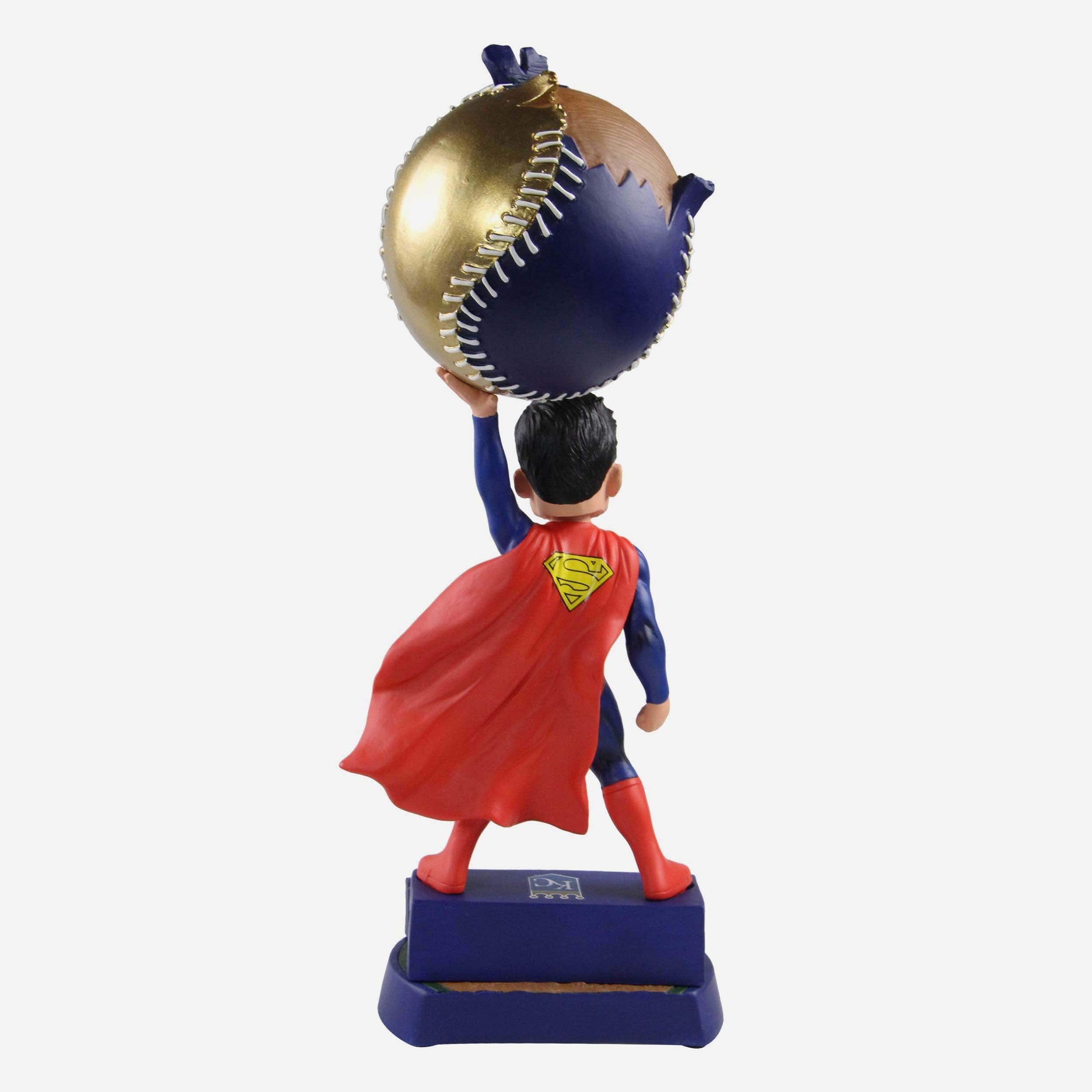 - Portrays Superman posing and holding a team-colored baseball with team logo display, showing off that super strength