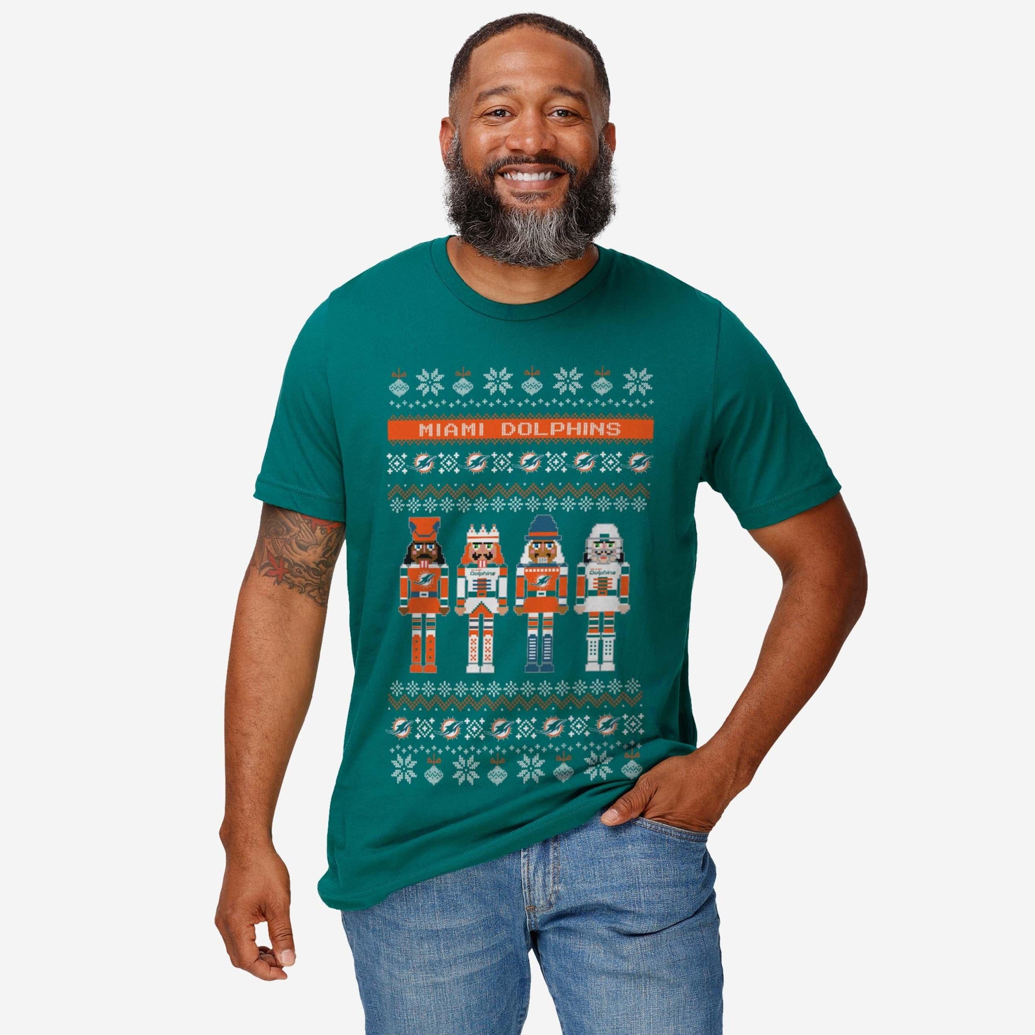 Get ready to get festive with your favorite team. Crack into the holiday spirit with the Miami Dolphins Holiday Nutcracker Sweater T-Shirt.
