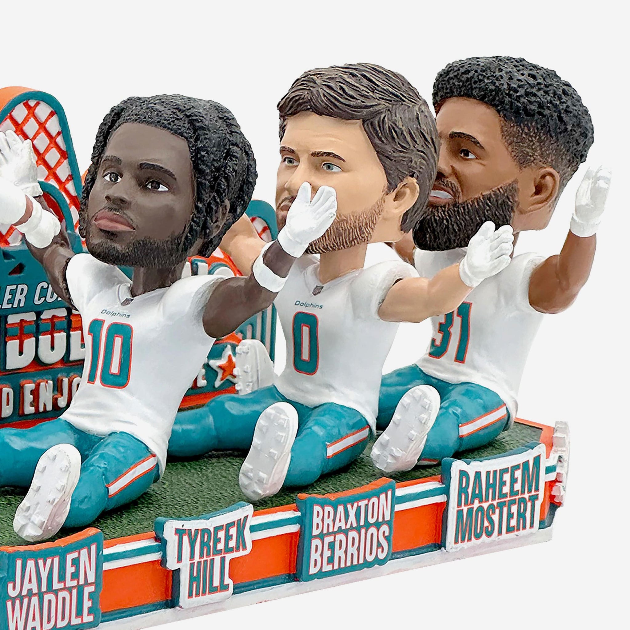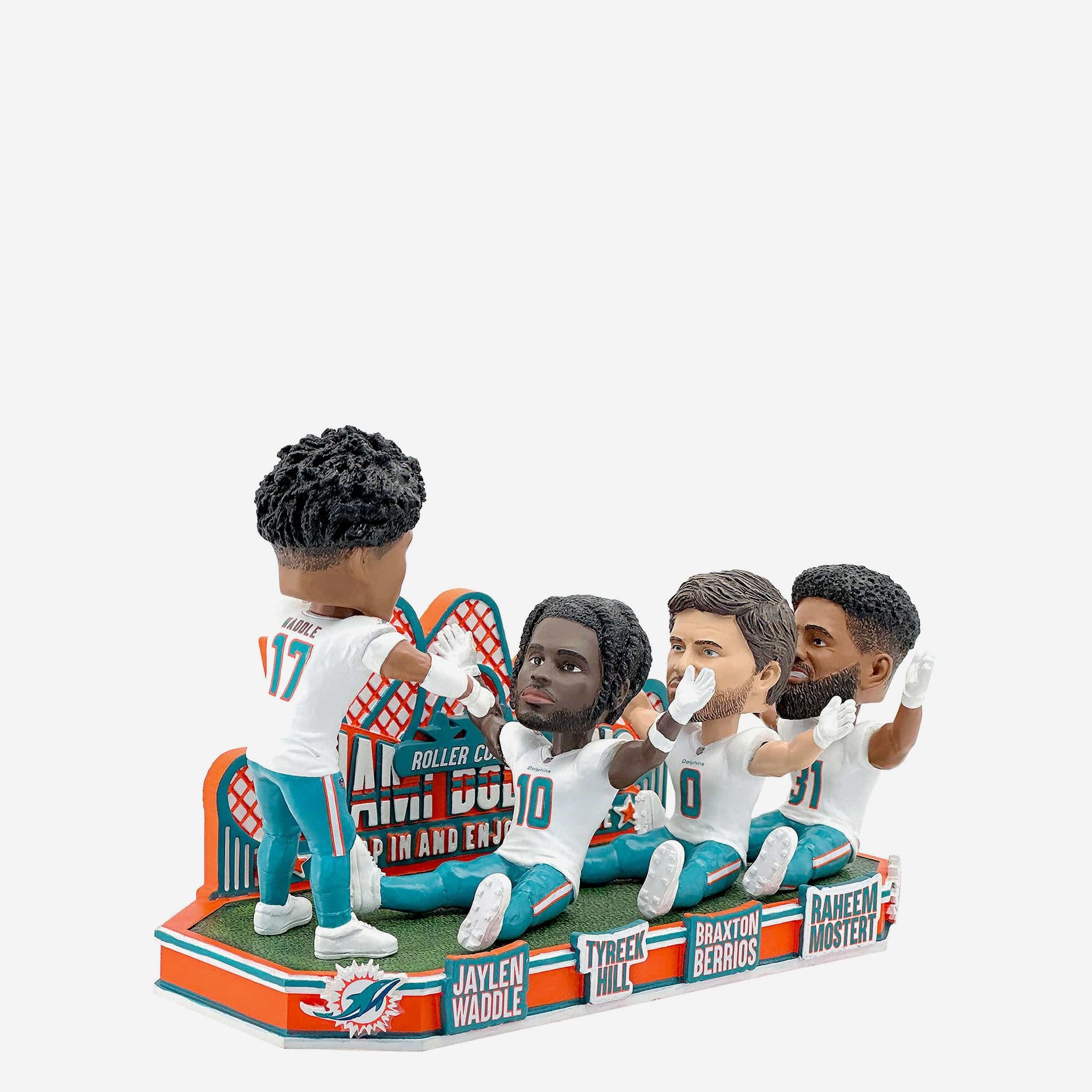 Even the touchdown celebrations of Tyreek Hill are a thrill ride. Lock in your safety bar and remember to keep your hands and feet inside the carts at all times, because Tyreek, Raheem Mostert, Jaylen Waddle, and Braxton Berrios are ready to join your huddle with the Miami Dolphins Roller Coaster Touchdown Celebration Mini Bobblehead Scene.