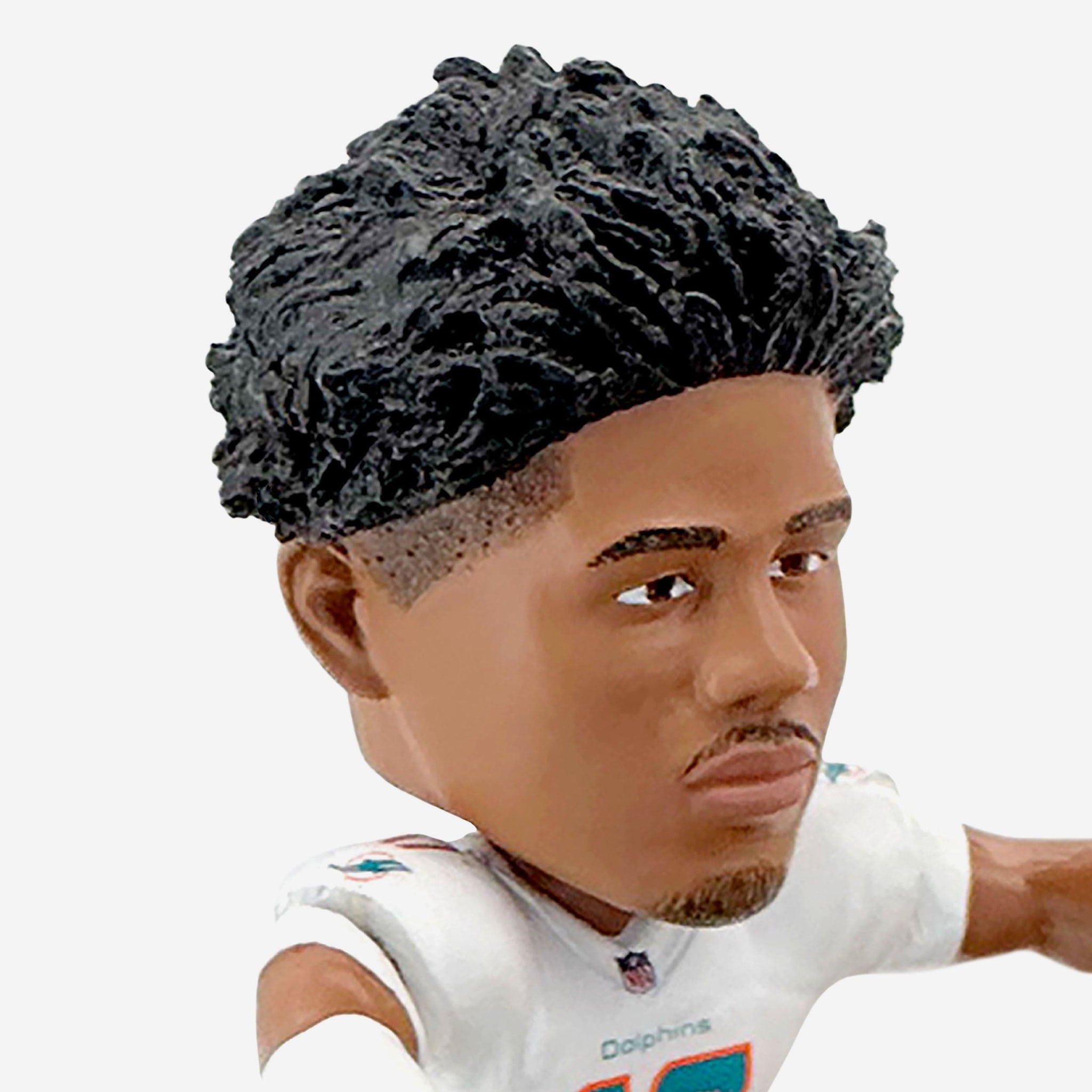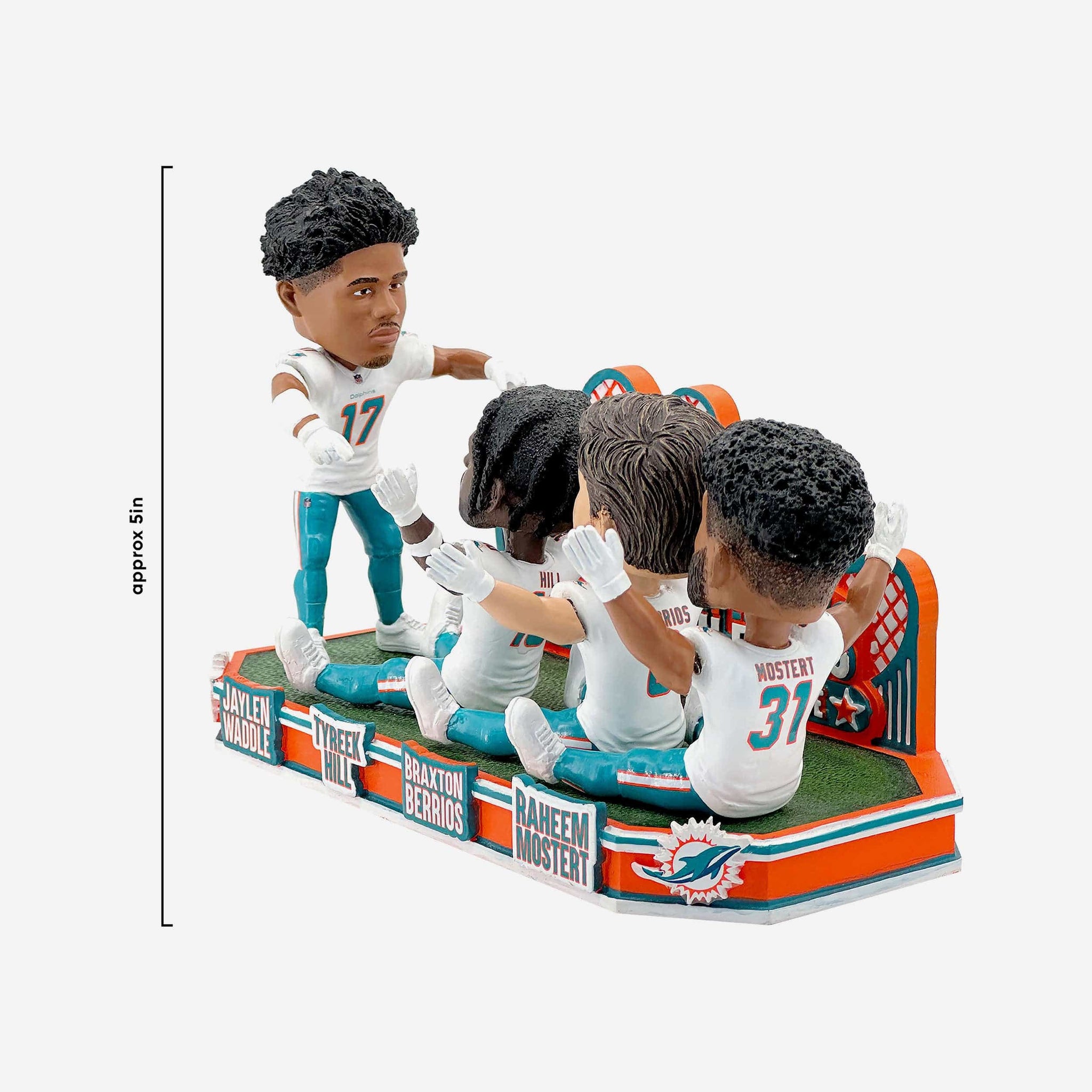 • Portrays Tyreek Hill, Raheem Mostert, Jaylen Waddle, and Braxton Berrios wearing their white and aqua gameday uniforms in a celebratory pose, re-creating their amazing touchdown celebration