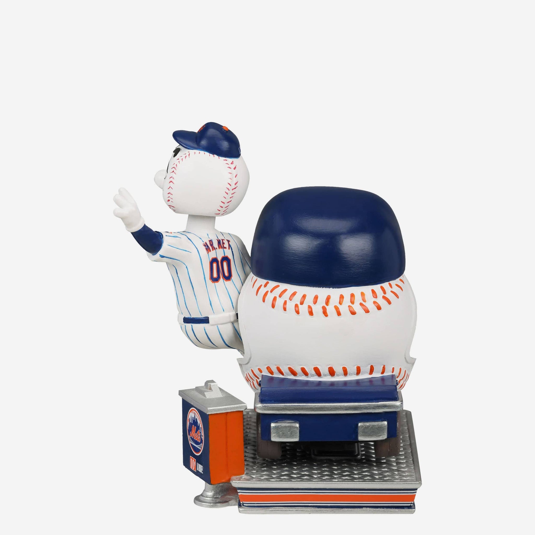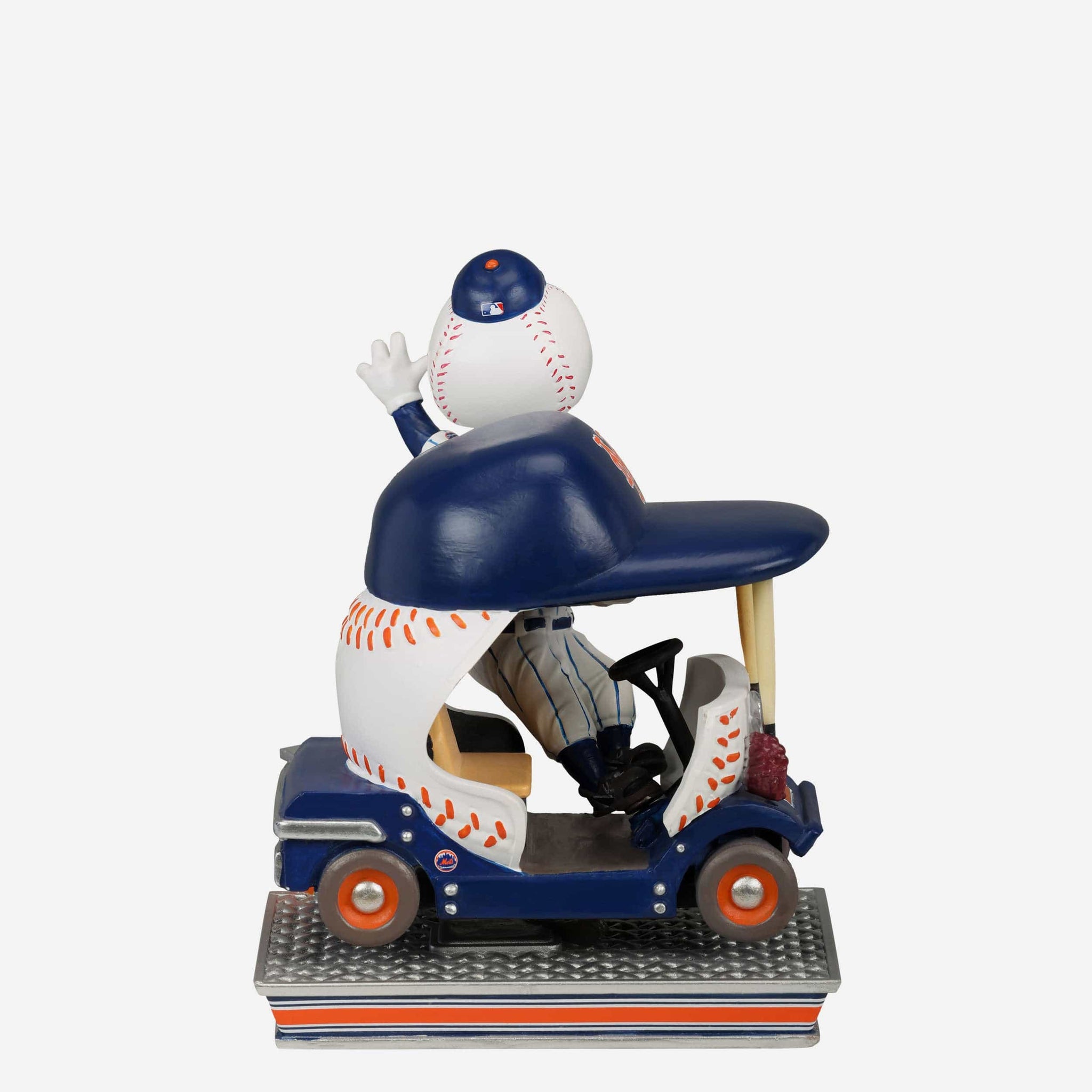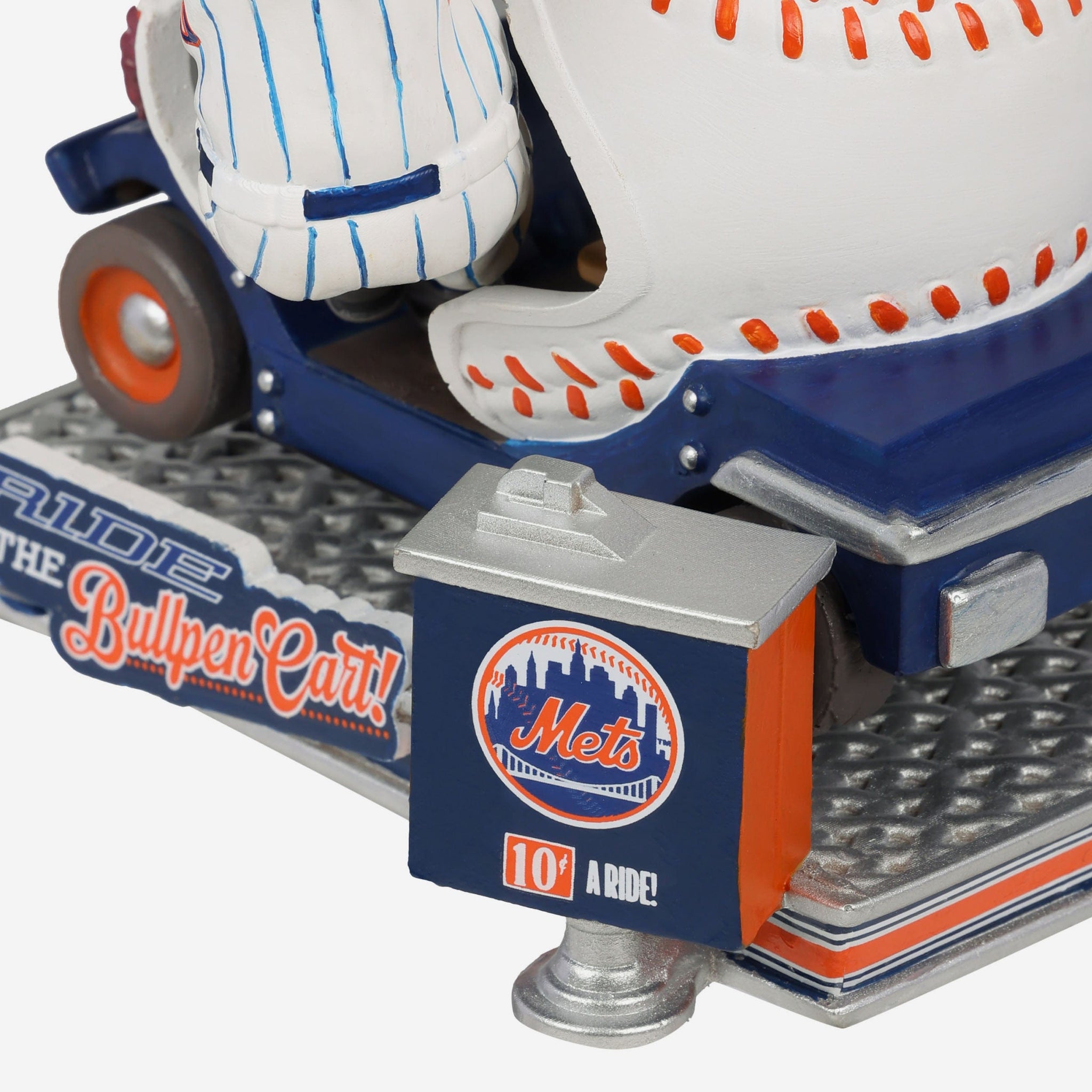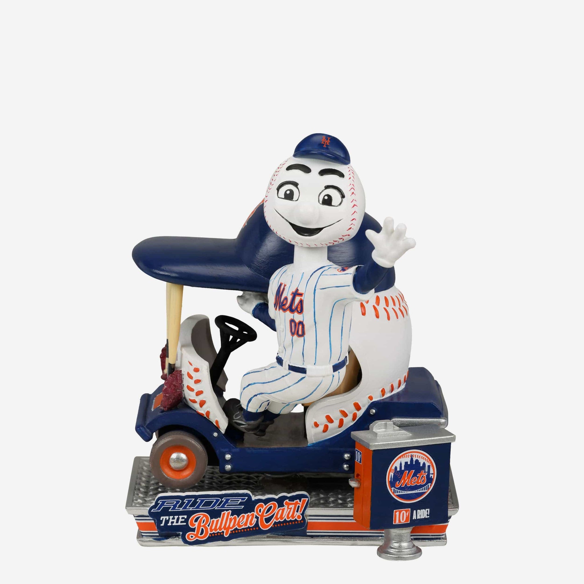 Ride the bullpen cart with Mr. Met! Drop in a dime and get ready to play ball with this Mr. Met New York Mets Bullpen Cart Mascot Bobblehead.