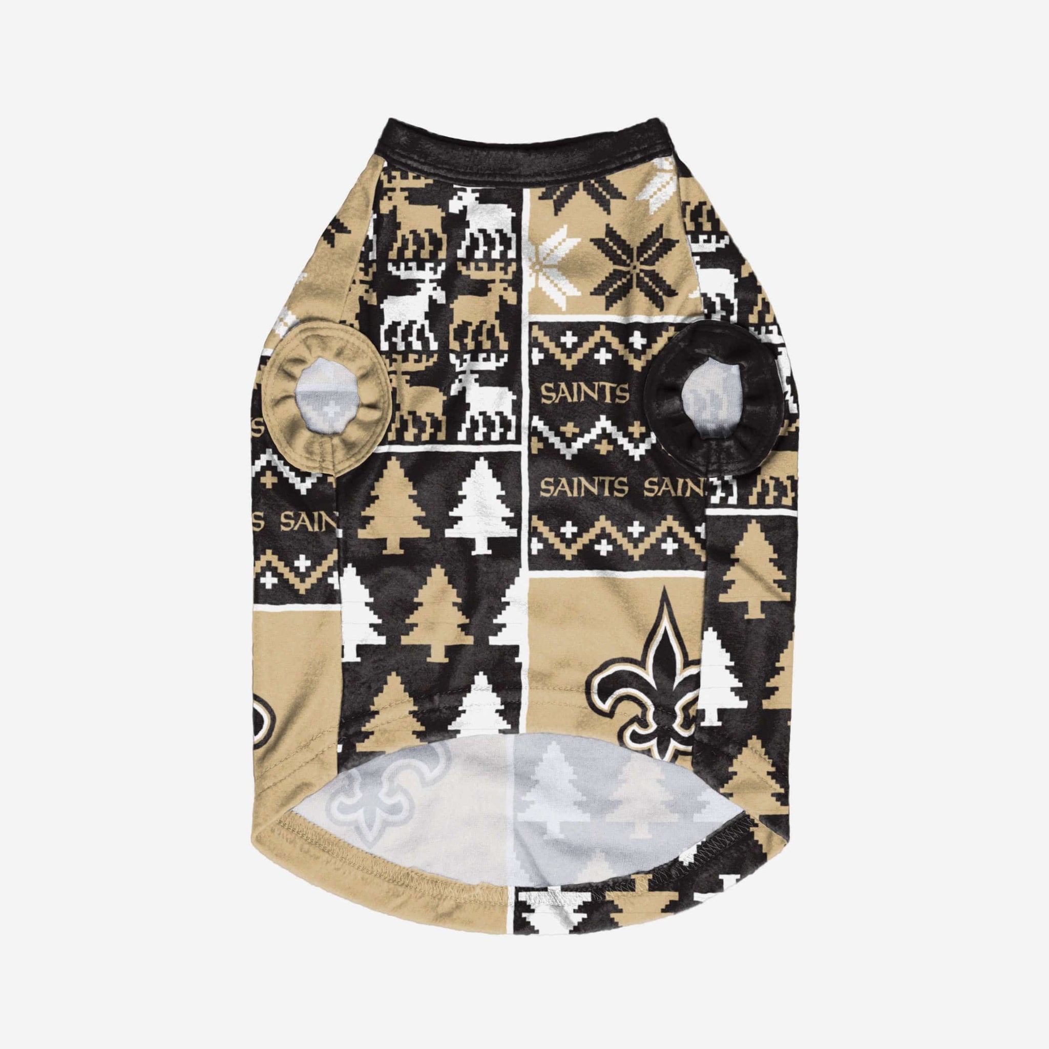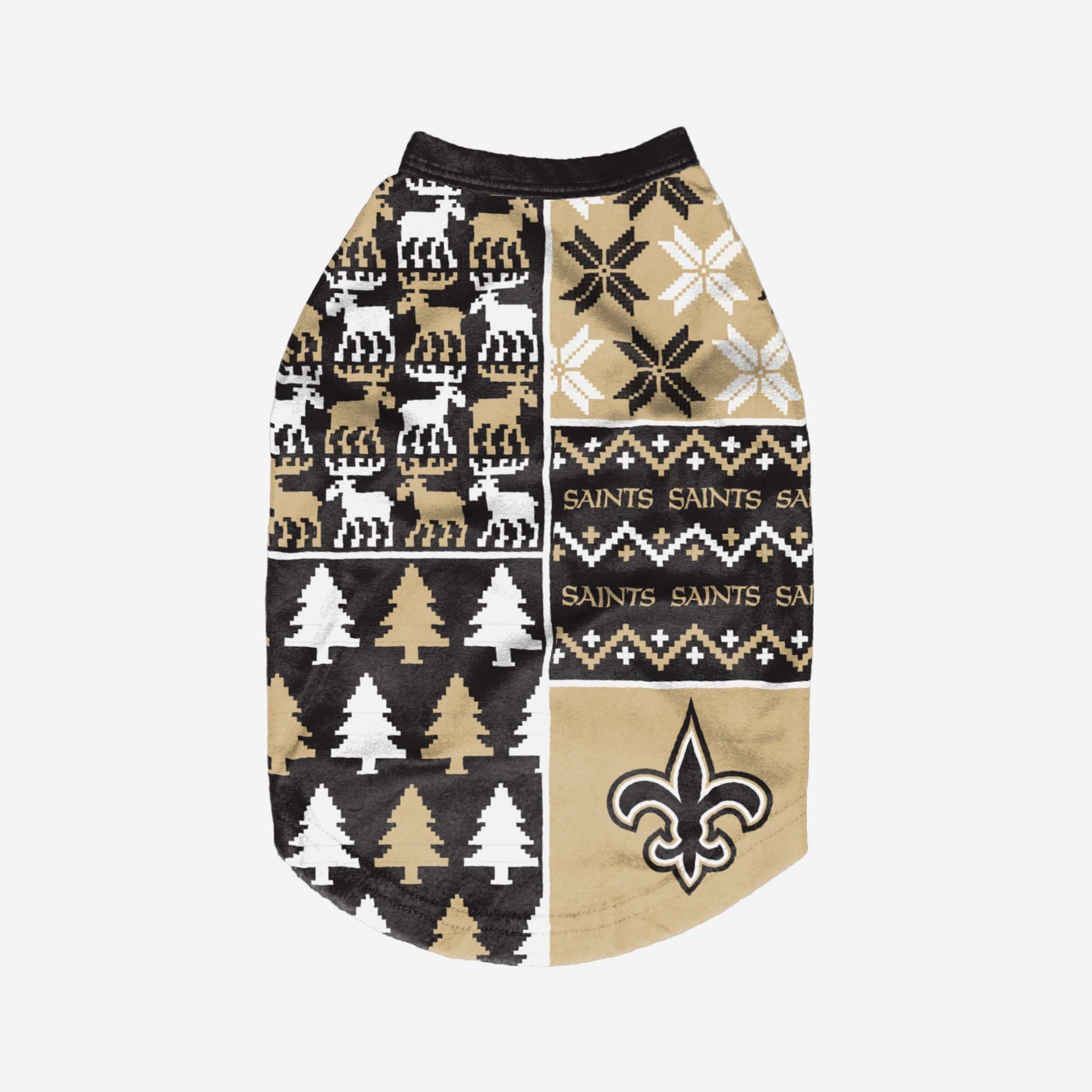 Show off your pet's holiday spirit with this dog sweater! Your good boy (or girl) will love this New Orleans Saints Busy Block Dog Sweater so much, they'll be saying "woof bark awooo" (that's "thank you" in pup language). Don't forget to match your canine's sweater with a set of matching holiday pajamas!