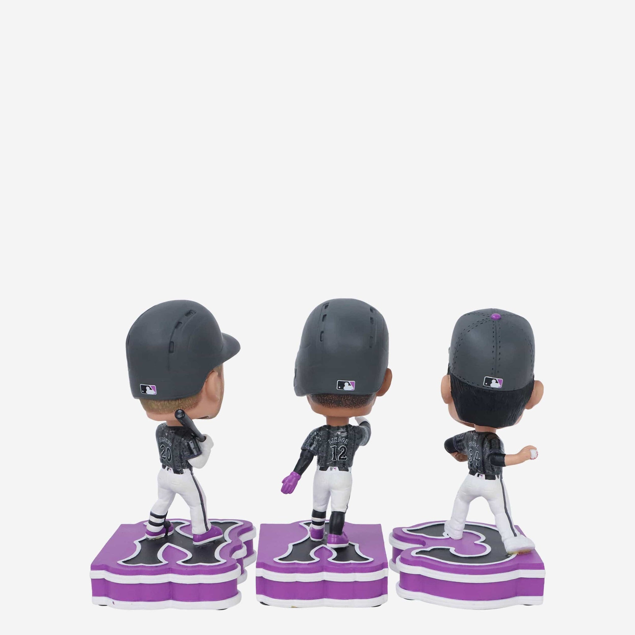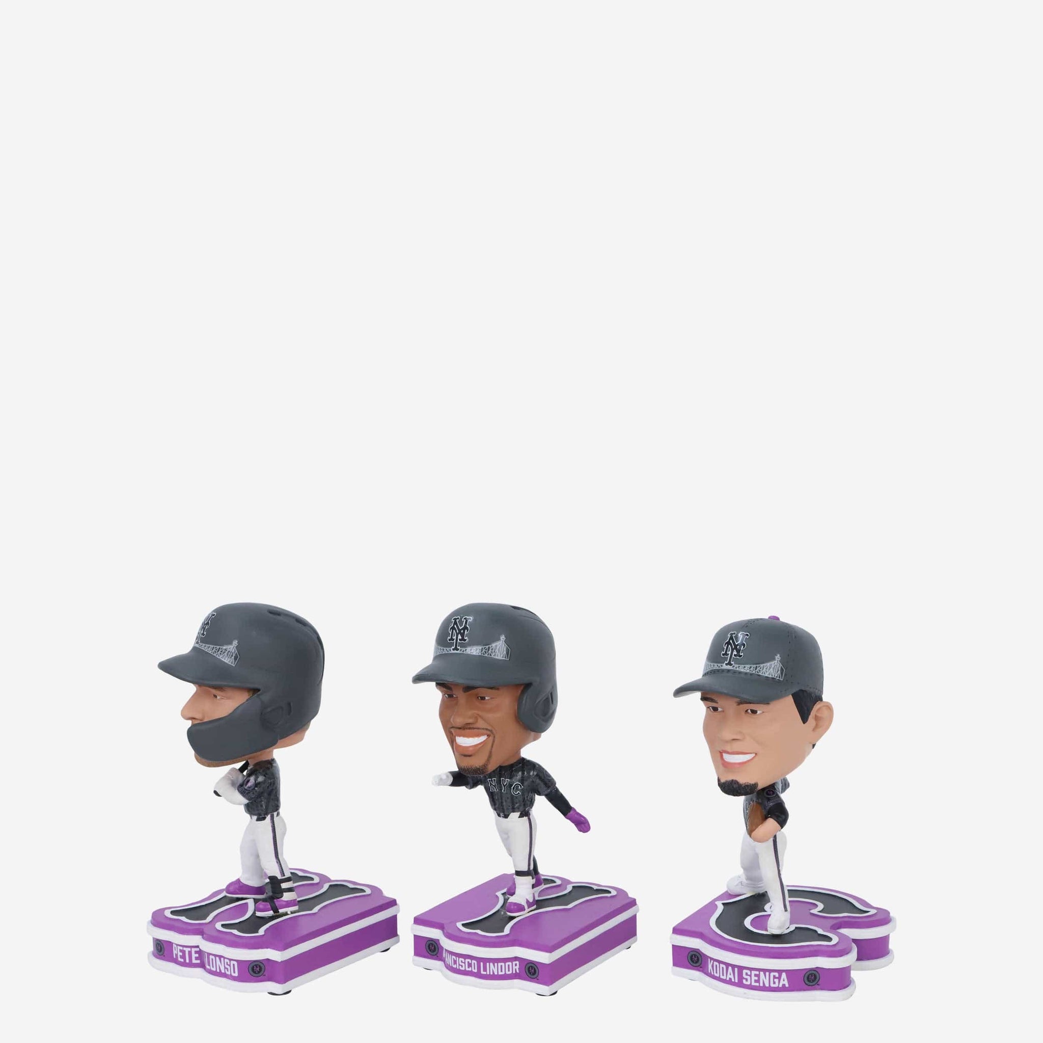 Alonso. Lindor. Senga. Good things come in threes, and this New York Mets 2024 City Connect Connecting Base 3 Pack Mini Bighead Bobblehead Set is no exception!