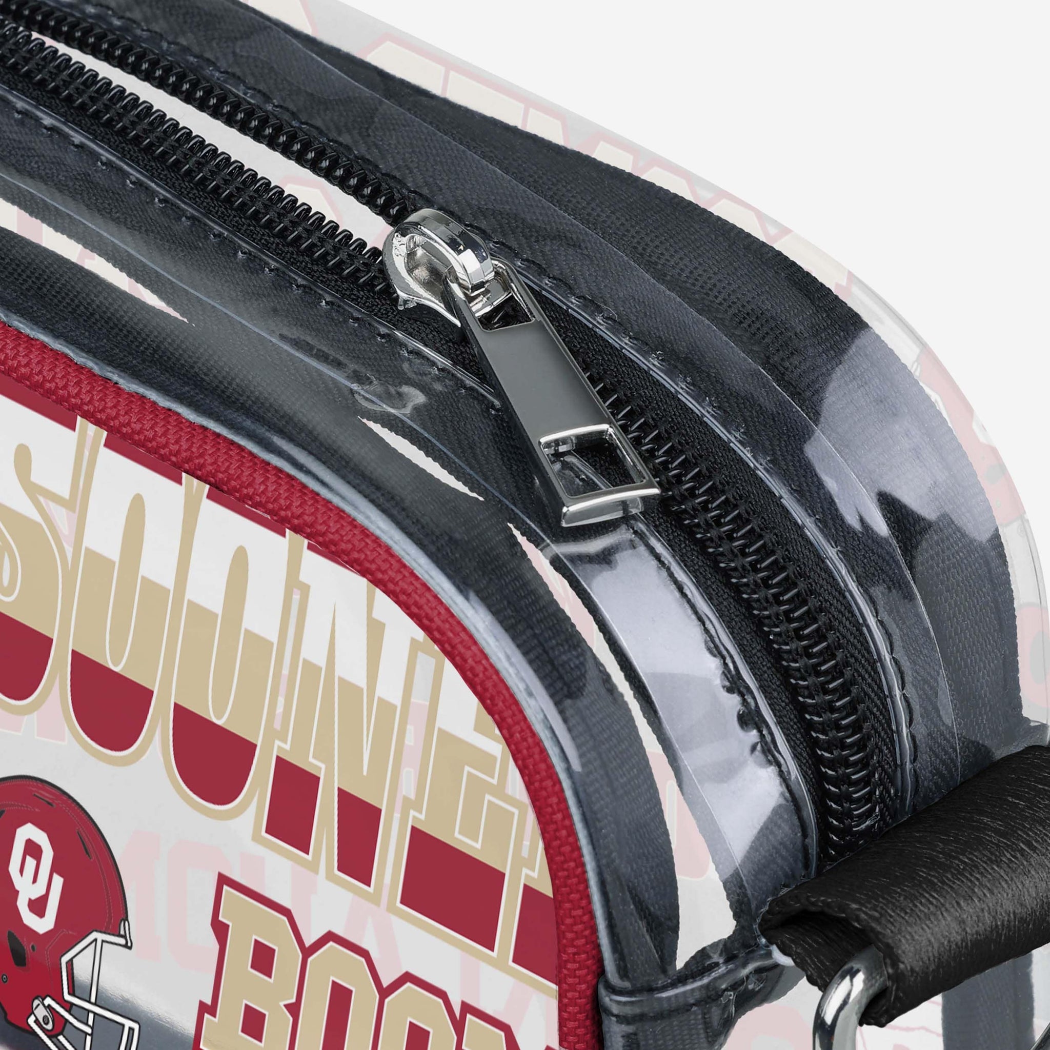 Over your shoulder and off to the game. Whether you're running errands on the town or running the tailgate in the parking lot, this Oklahoma Sooners Repeat Retro Print Clear Crossbody Bag is the perfect way to carry the team like never before.