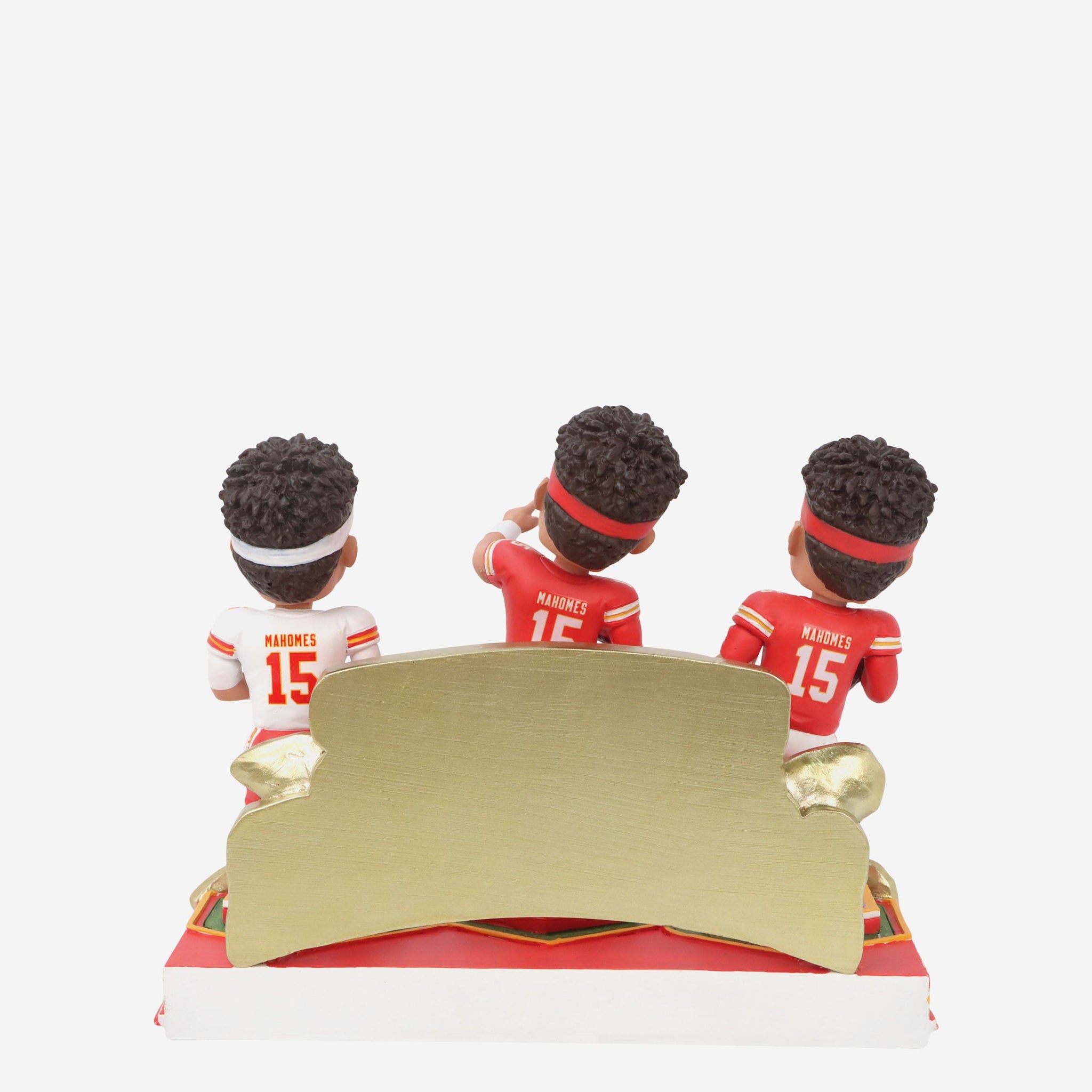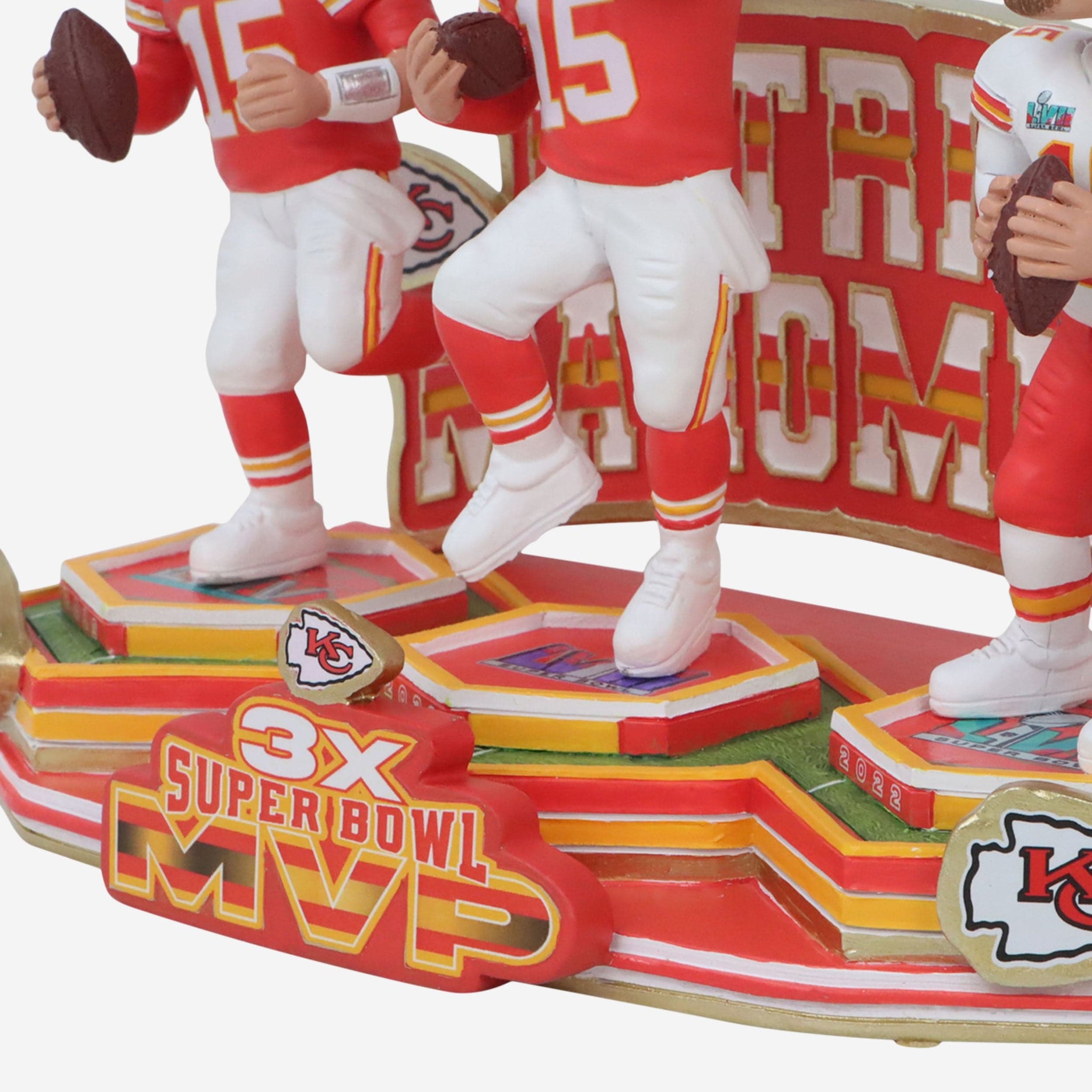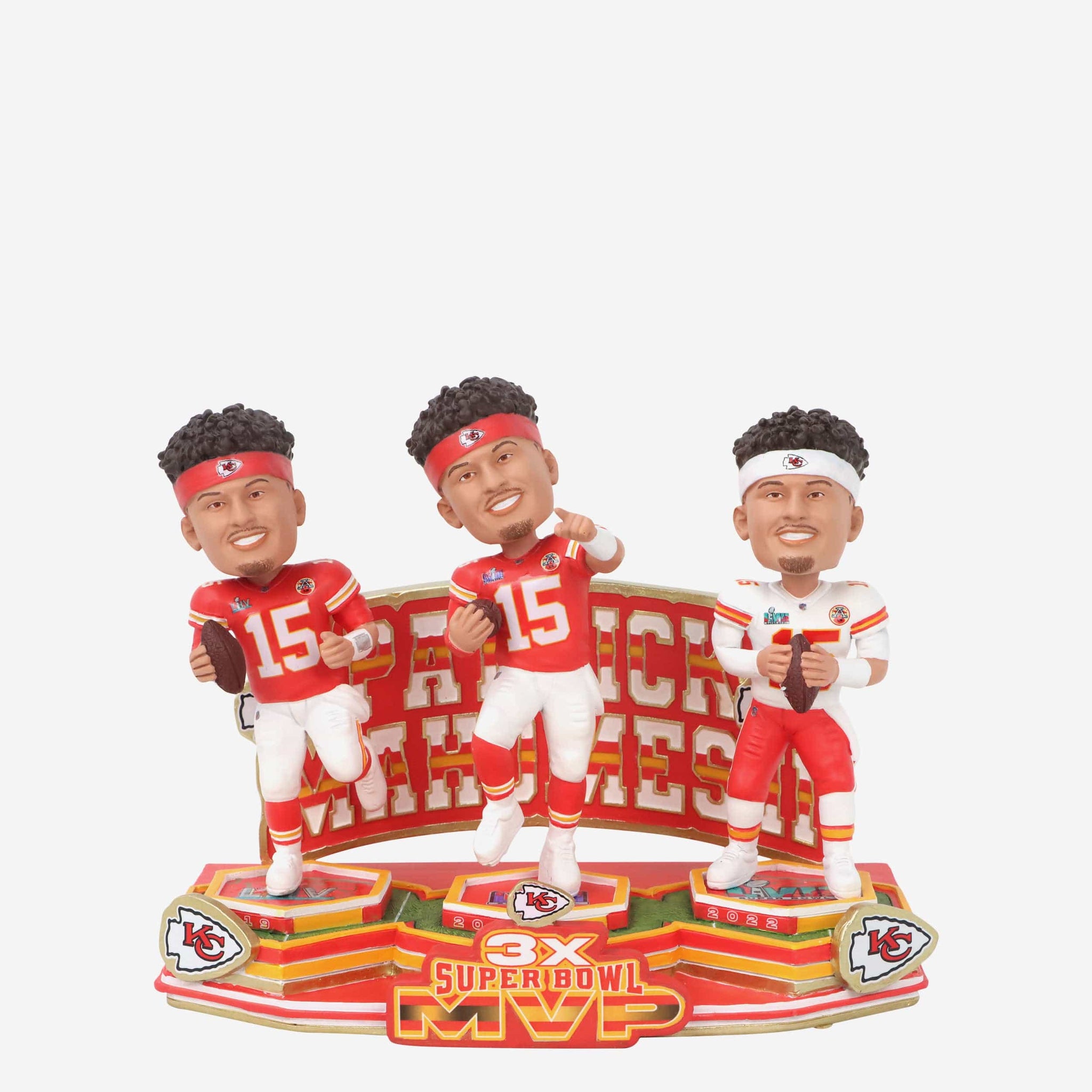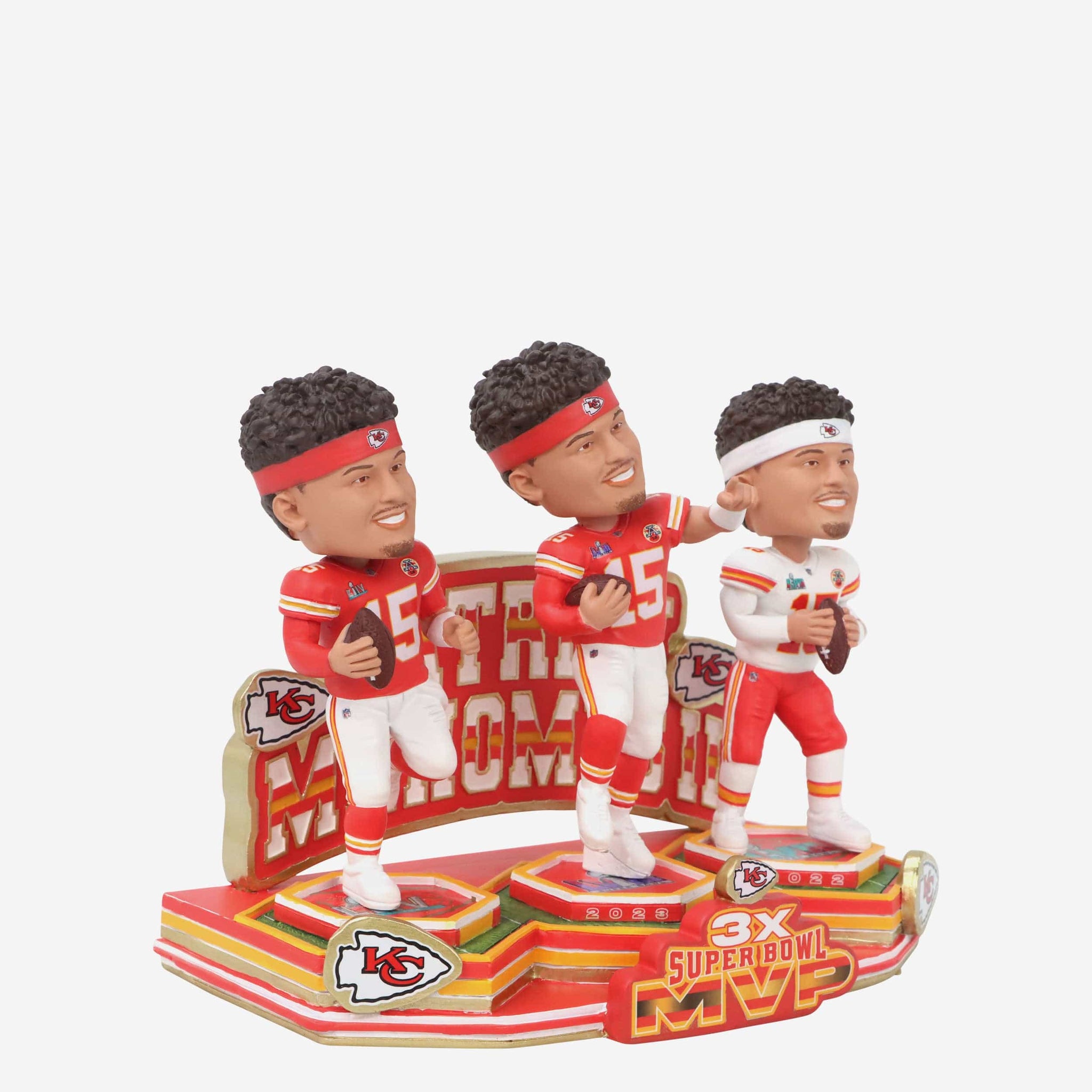 M-V-P! M-V-P! M-V-P! Triple down on your most valuable collection with the officially licensed Patrick Mahomes Kansas City Chiefs 3x Super Bowl MVP Bobblehead