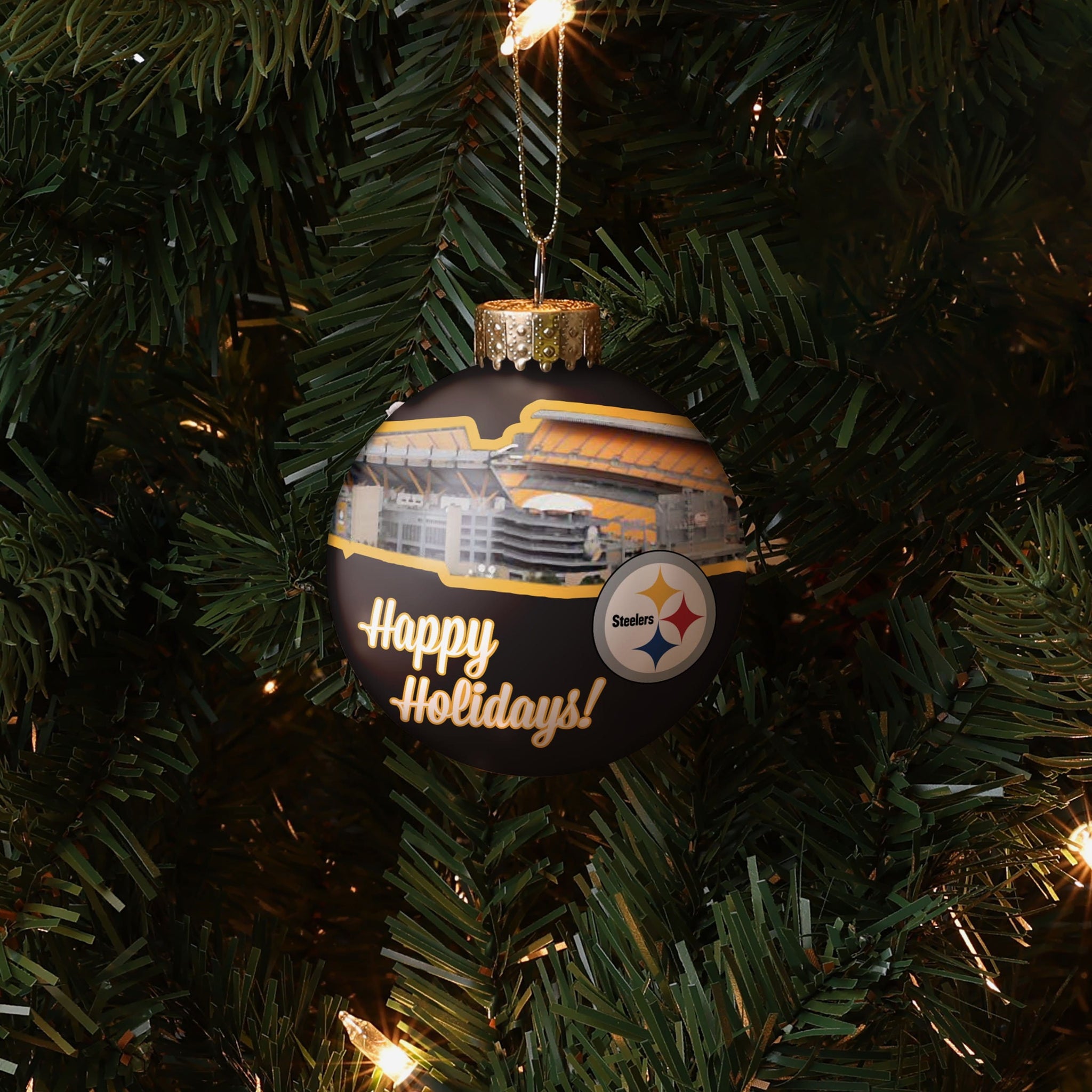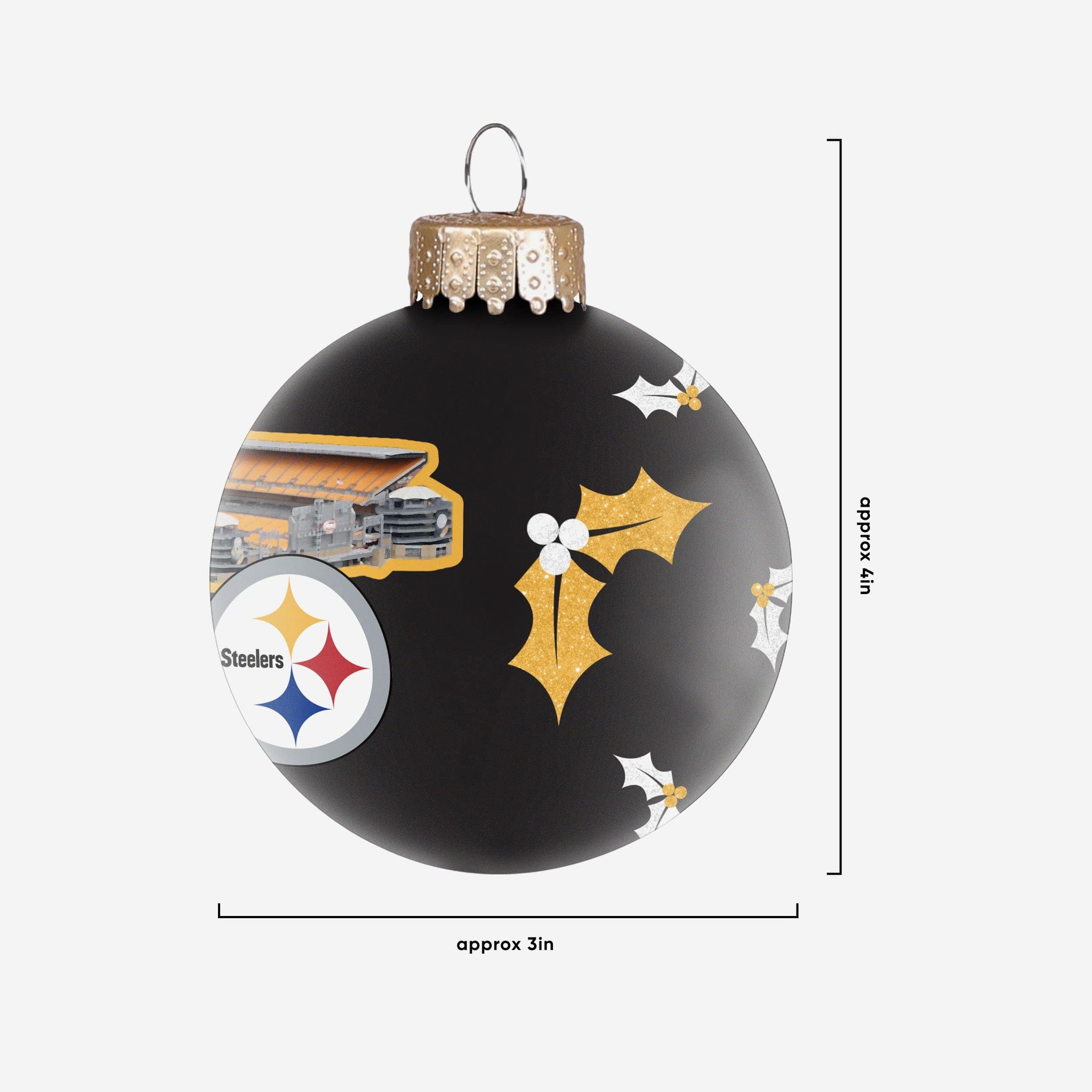 Bring some home field advantage to your home for the holidays. Now every day will feel like gameday during the holidays with this Pittsburgh Steelers Stadium Print Glass Ball Ornament on display!