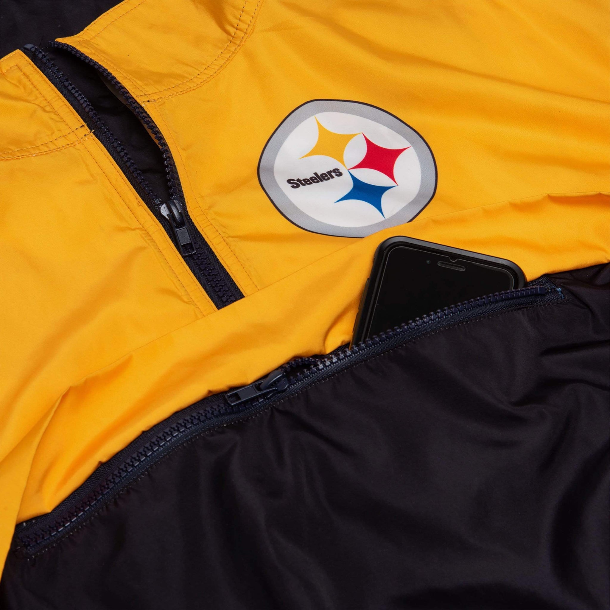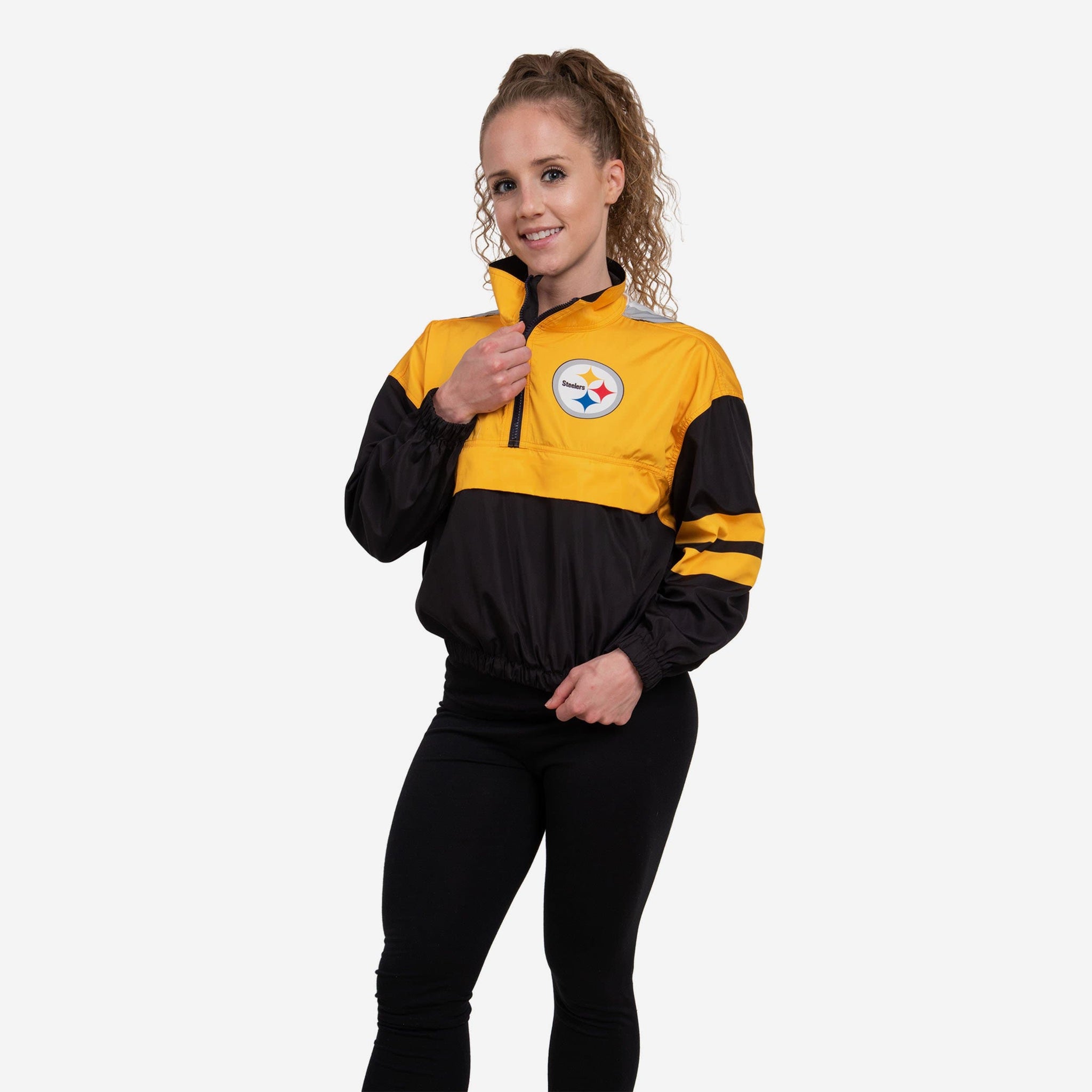 This Pittsburgh Steelers Women's Winning Play Windbreaker has a bold team logo on the back, so you can show off your team spirit to everyone you leave in the dust while you run the track.