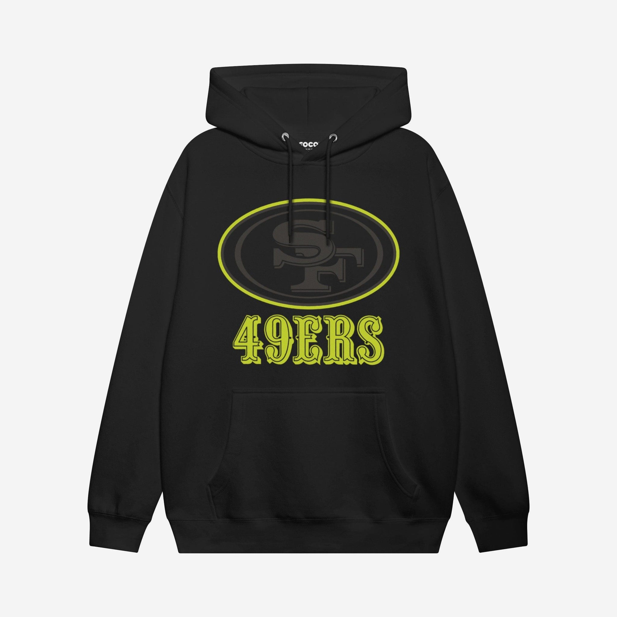 - Team logo display with highlight outline: The front of this apparel features a black San Francisco 49ers team logo display outlined in neon, and a neon team name display
