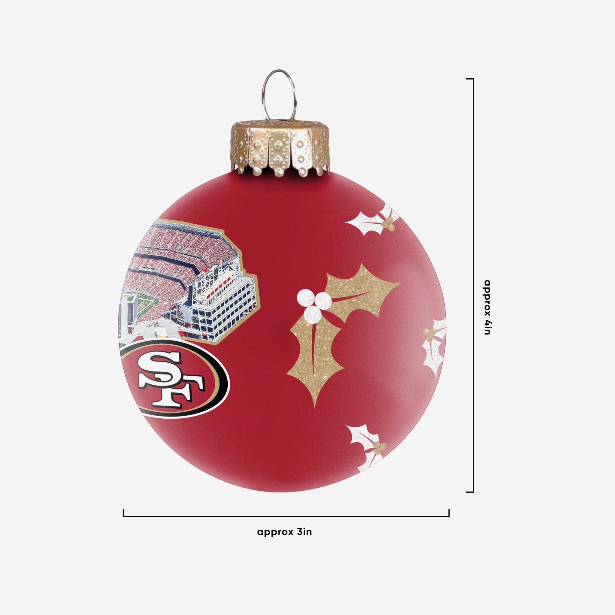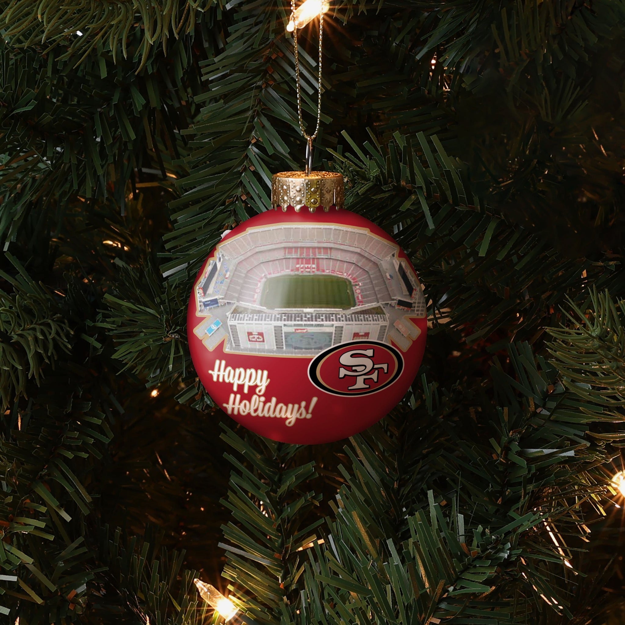 Bring some home field advantage to your home for the holidays. Now every day will feel like gameday during the holidays with this San Francisco 49ers Stadium Print Glass Ball Ornament on display!