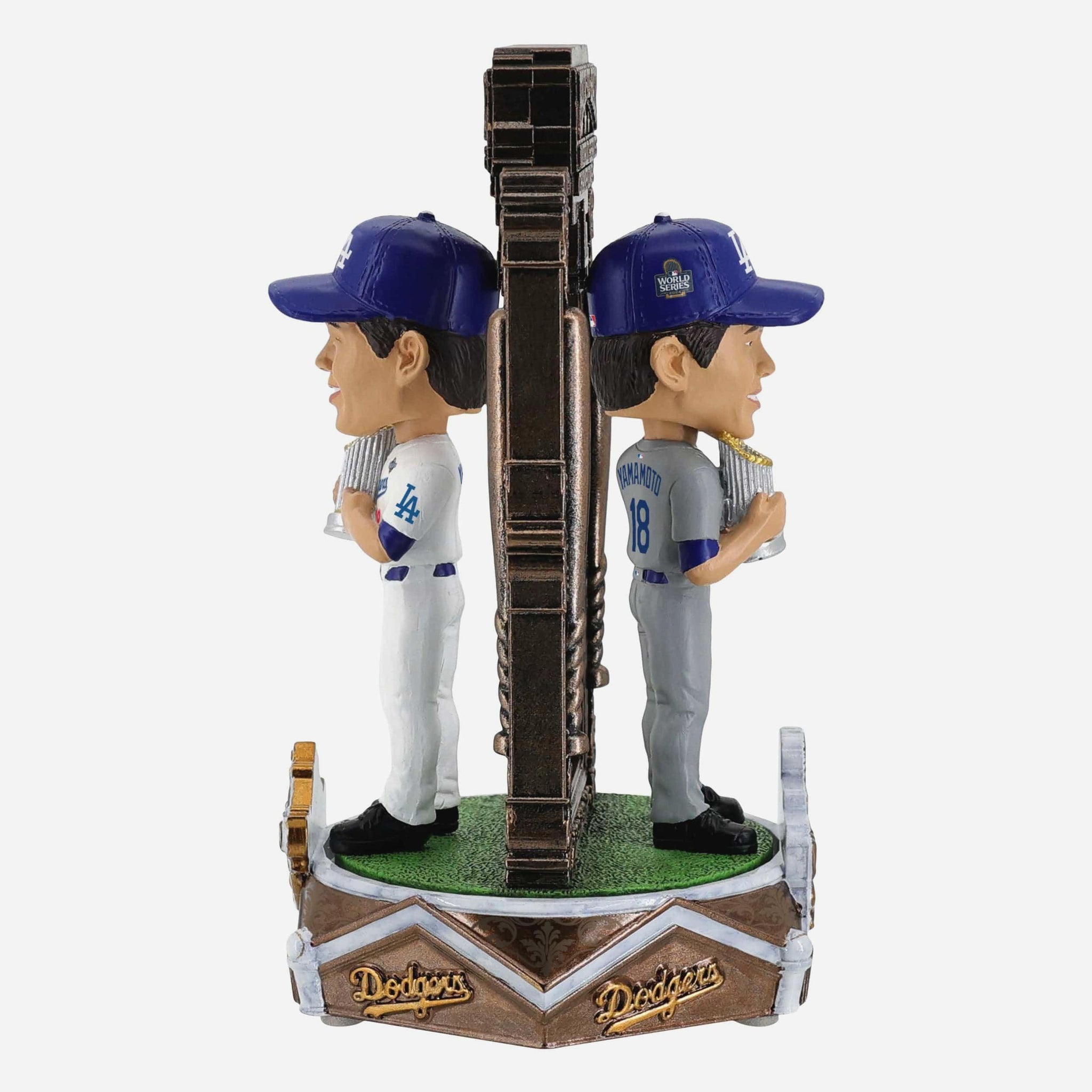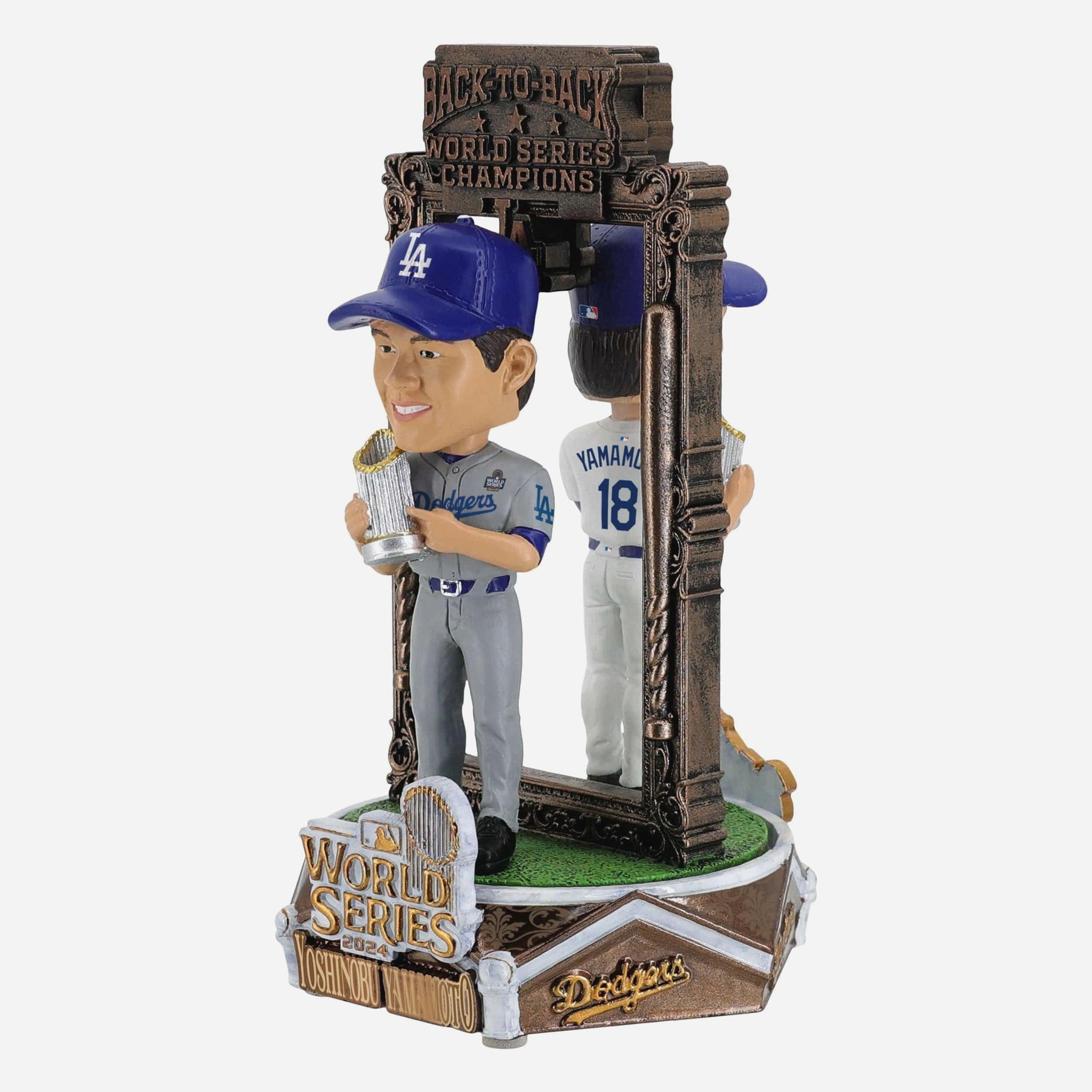 • Portrays two figures of Yoshinobu Yamamoto standing tall in his home and away uniform, proudly holding the World Series trophy for the ultimate championship flex