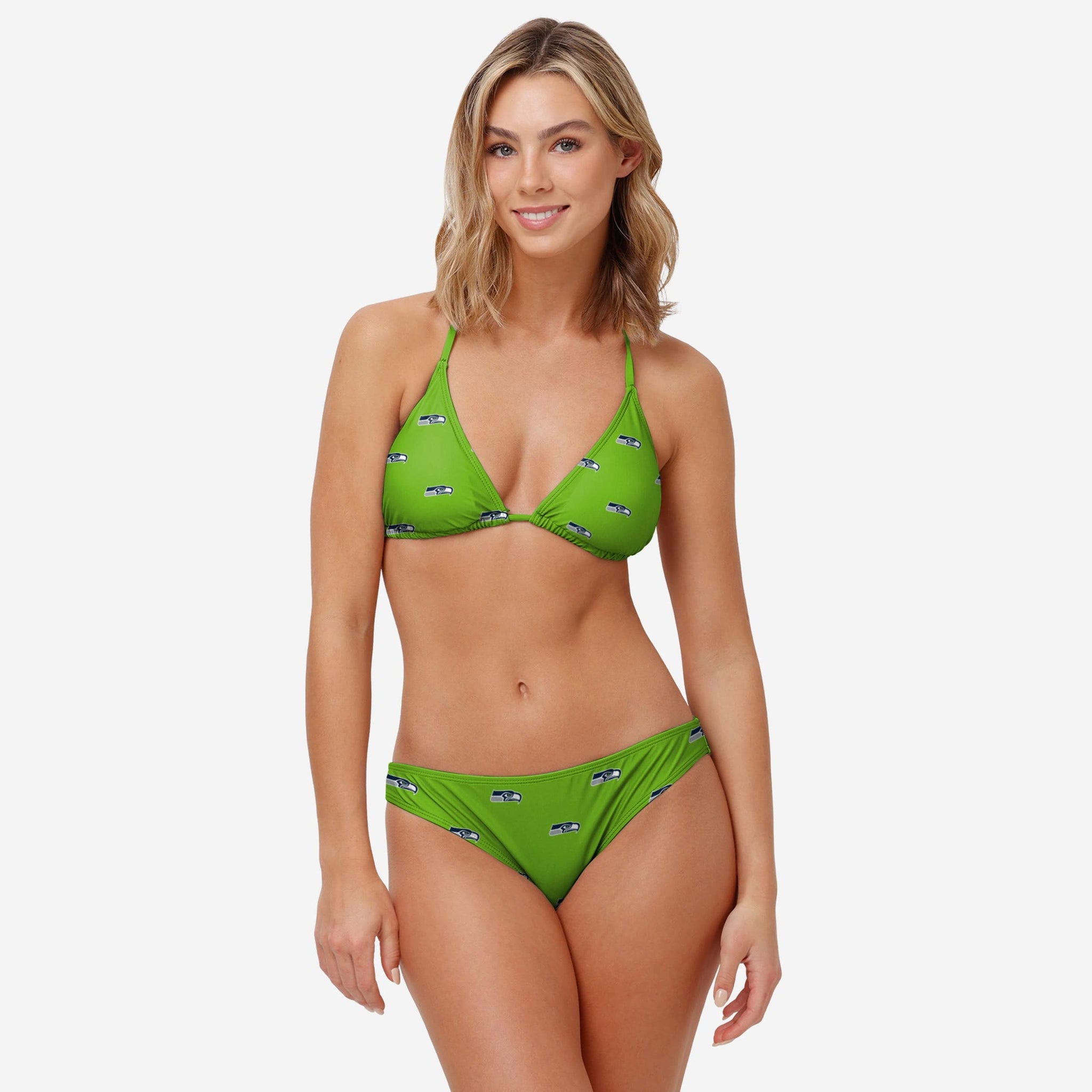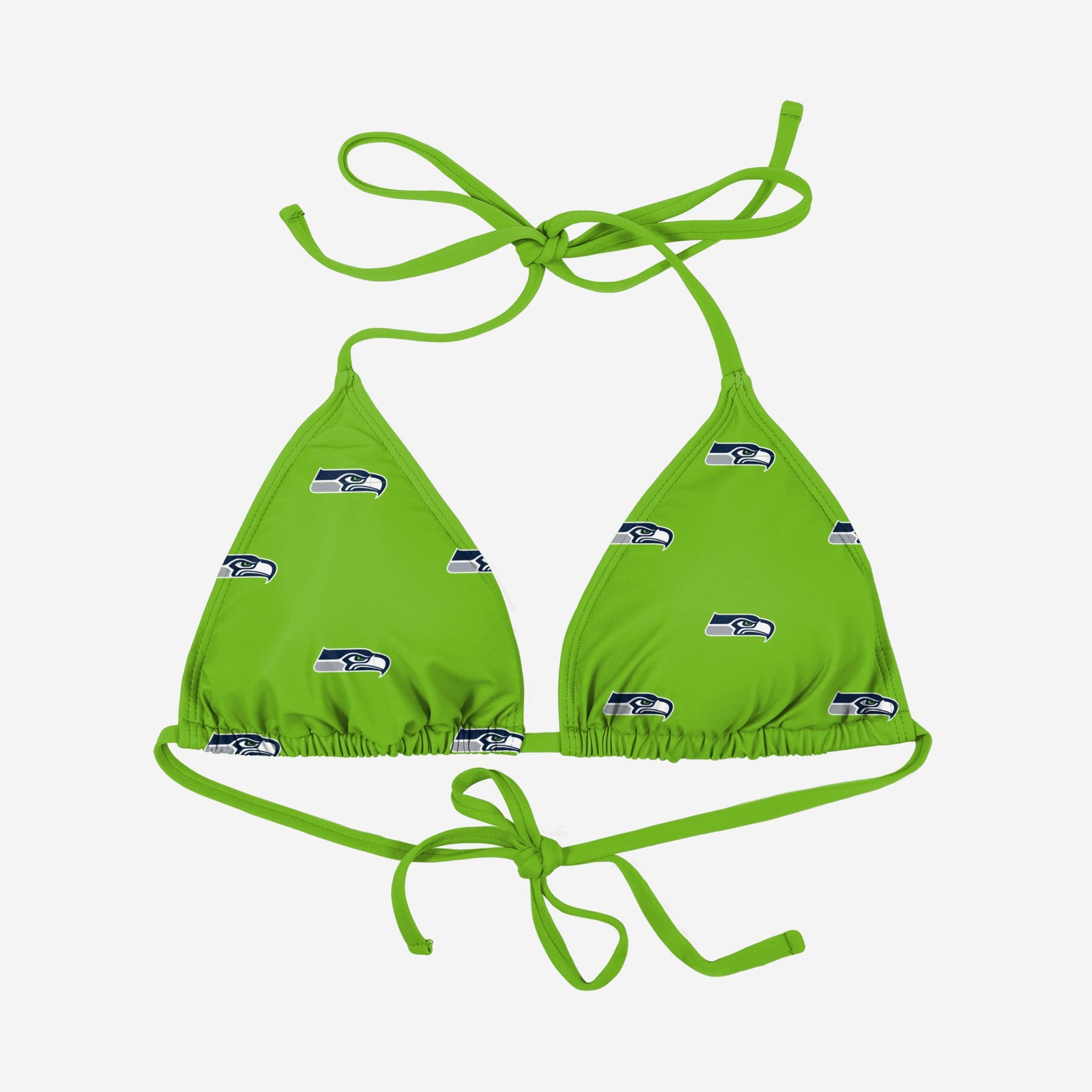 Take your team pride poolside and lounge like a legend in the Seattle Seahawks Women's Mini Print Bikini Top!