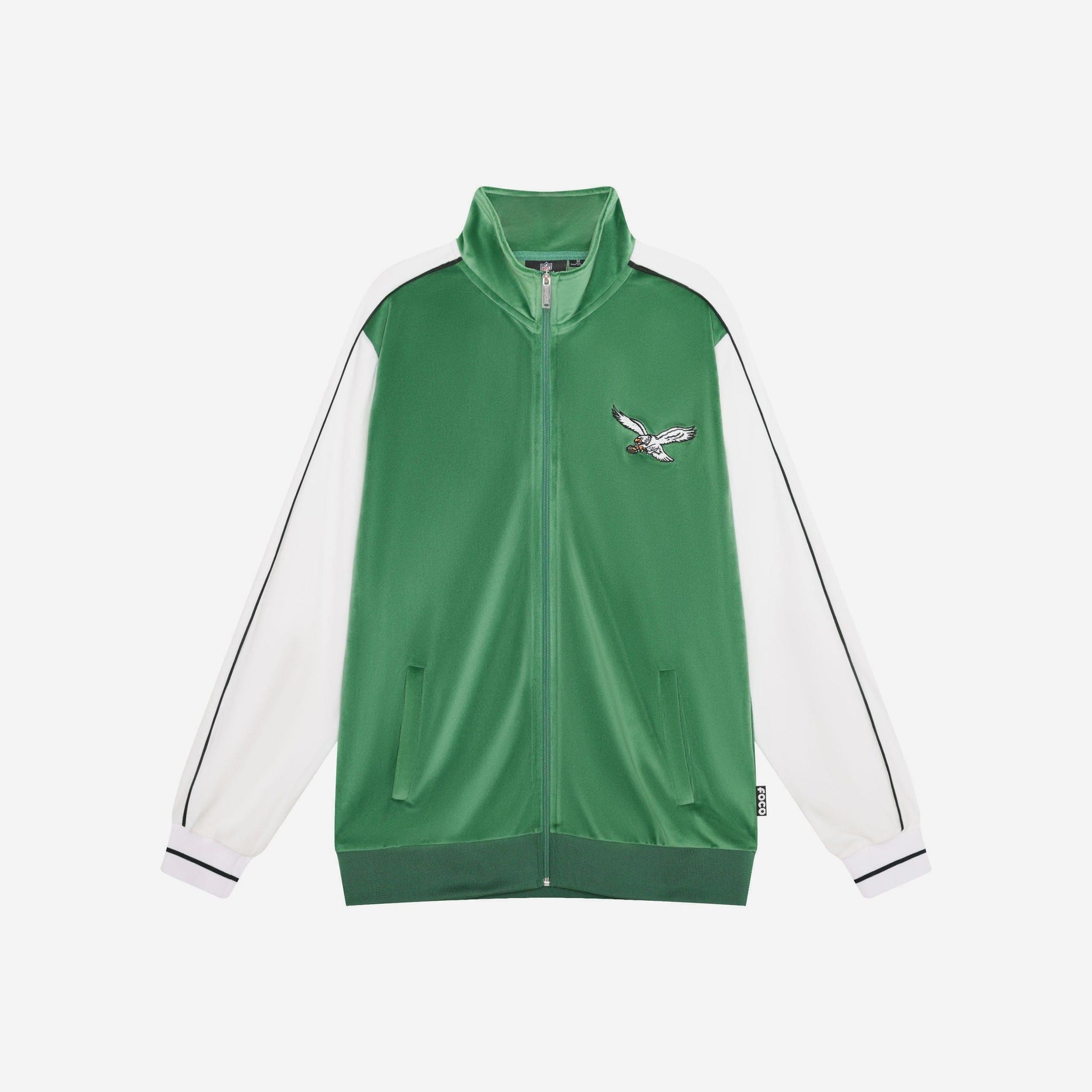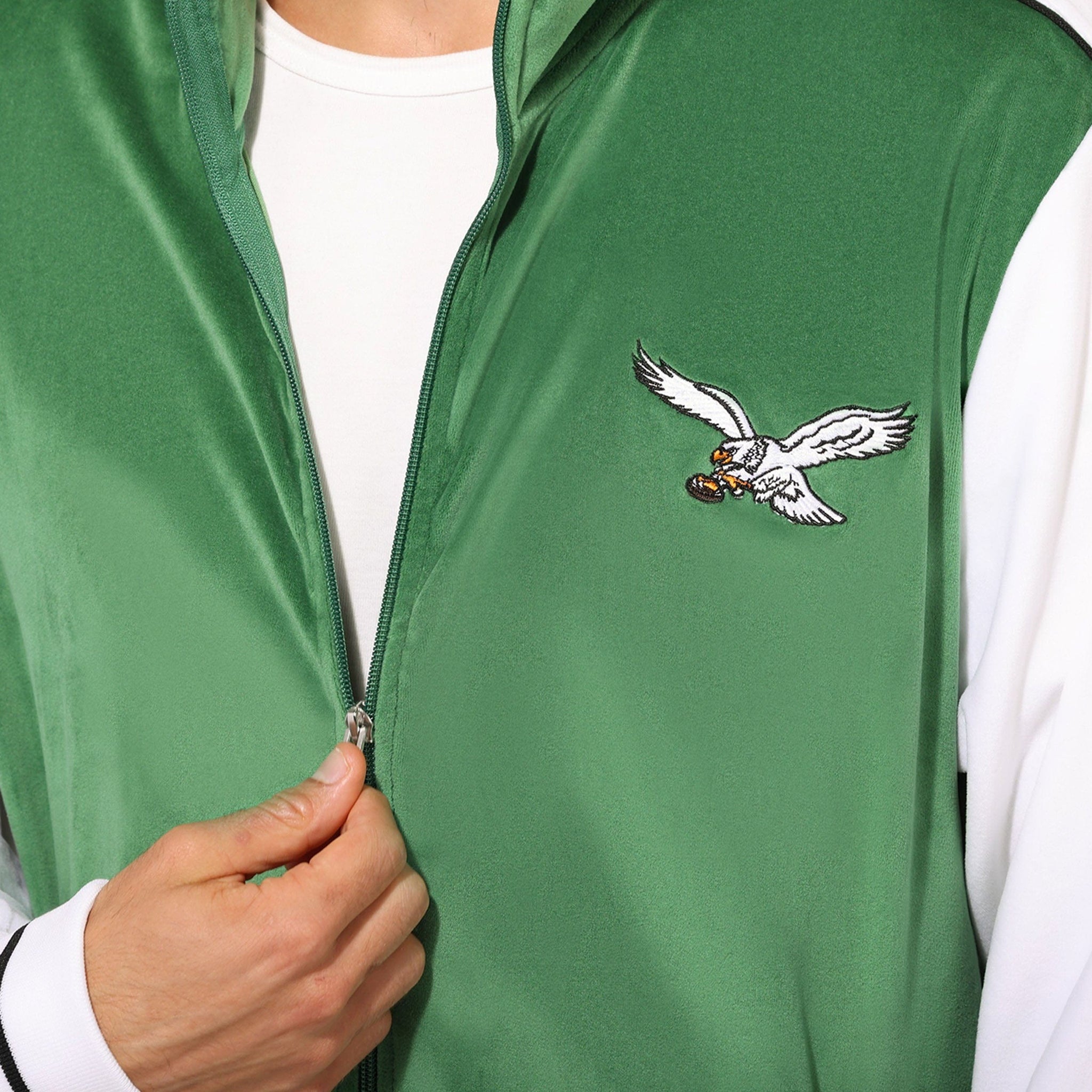 Soft, stylish, and straight-up iconic. Elevate your fan fit with this Philadelphia Eagles Kelly Green Two Tone Velour Zip Up Top! Featuring a sleek two-tone design, ultra-soft velour fabric, and a full front zipper, this top brings comfort, warmth, and team pride together in one stylish package.