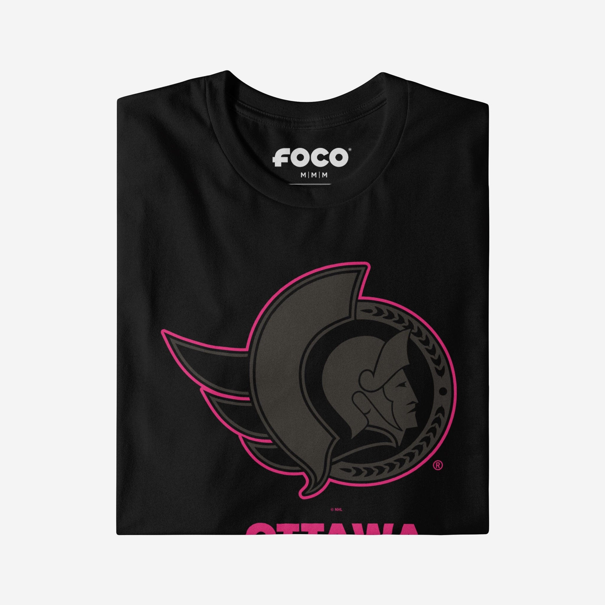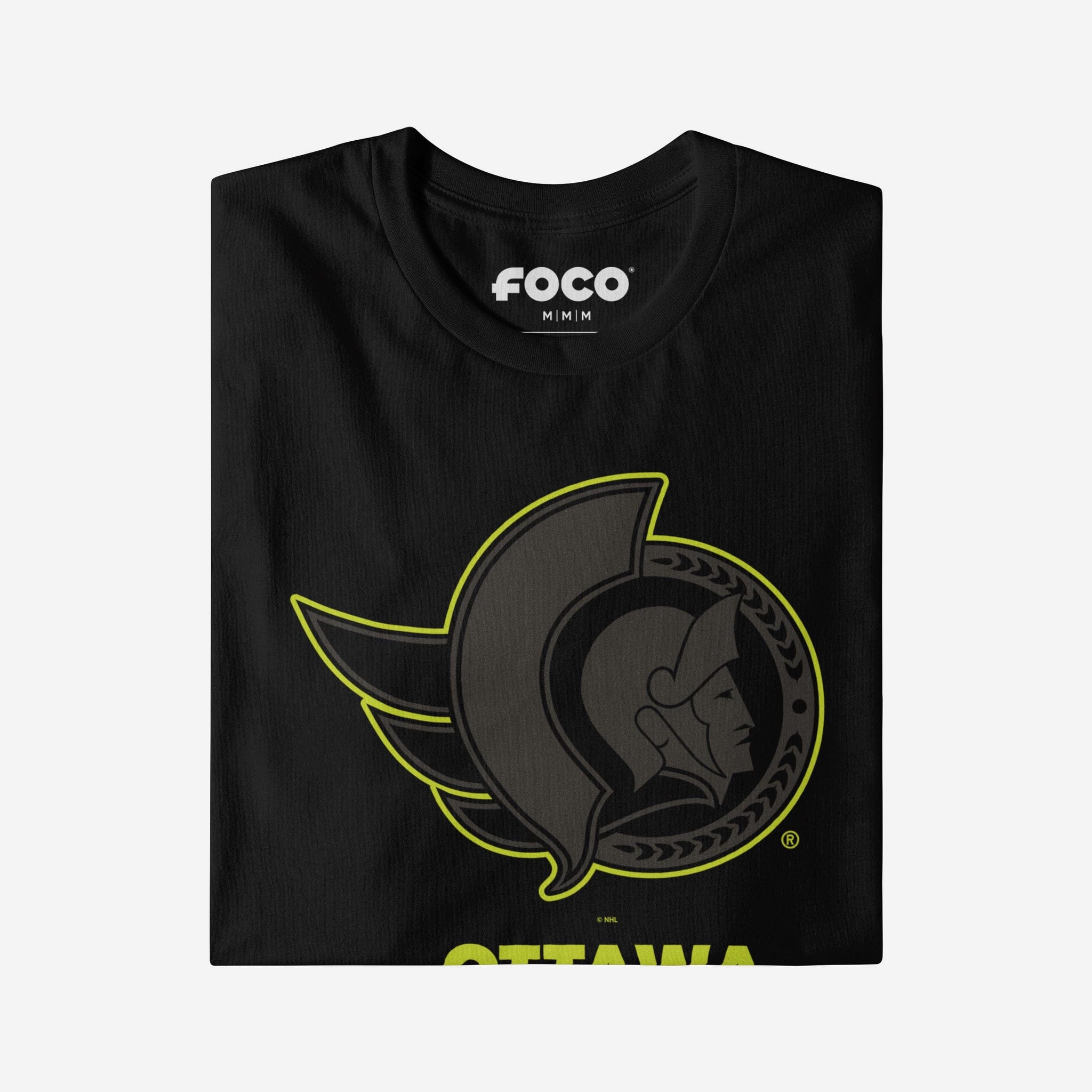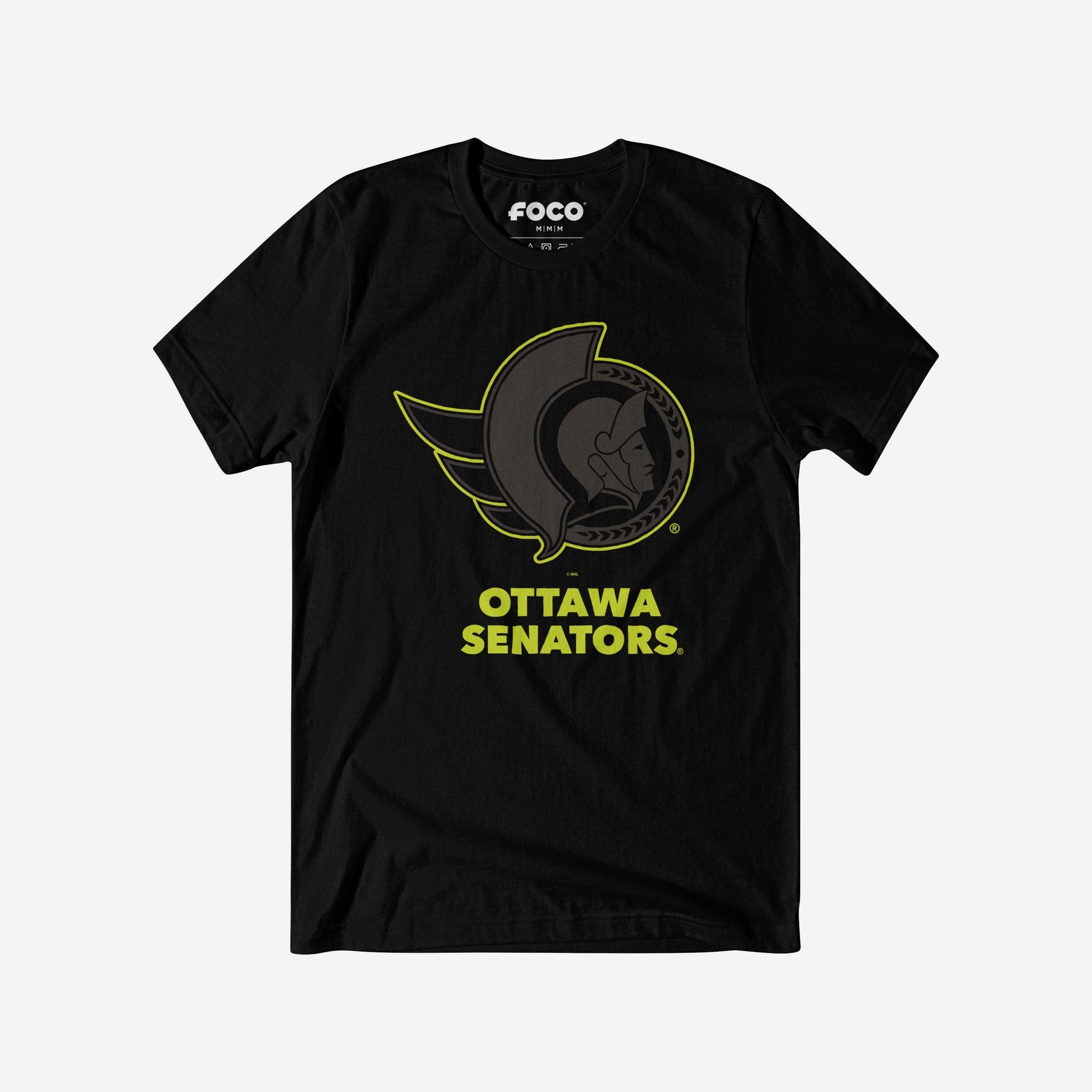 - Team logo display with highlight outline: The front of this apparel features a black Ottawa Senators team logo display outlined in neon, and a neon wordmark team name display