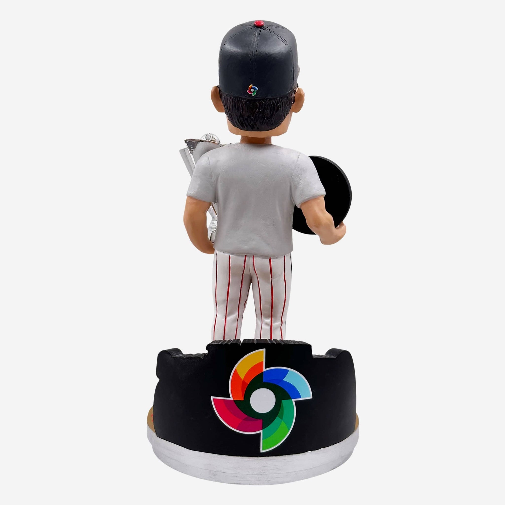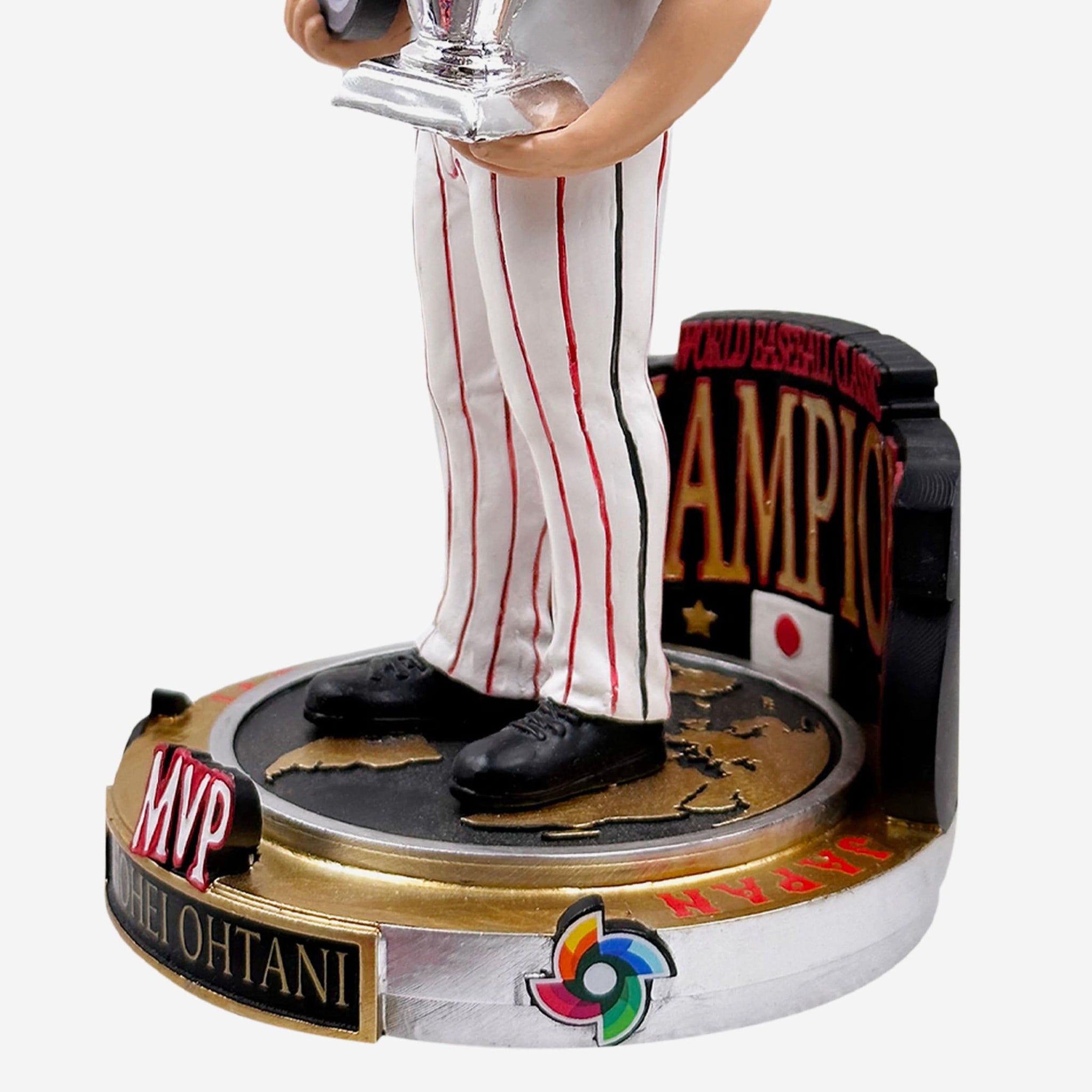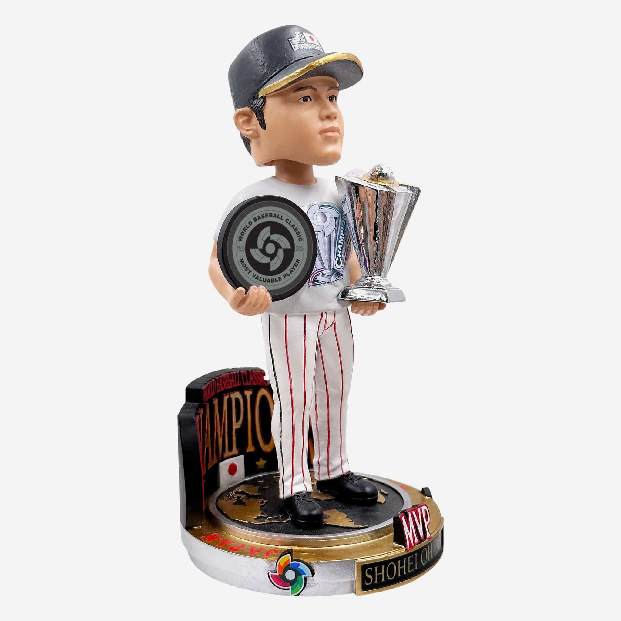- Portrays Ohtani posing in his white gameday uniform, championship cap, and championship t-shirt while holding miniature championship trophy and WBC MVP trophy accents, because he's GOTTA show off the hardware