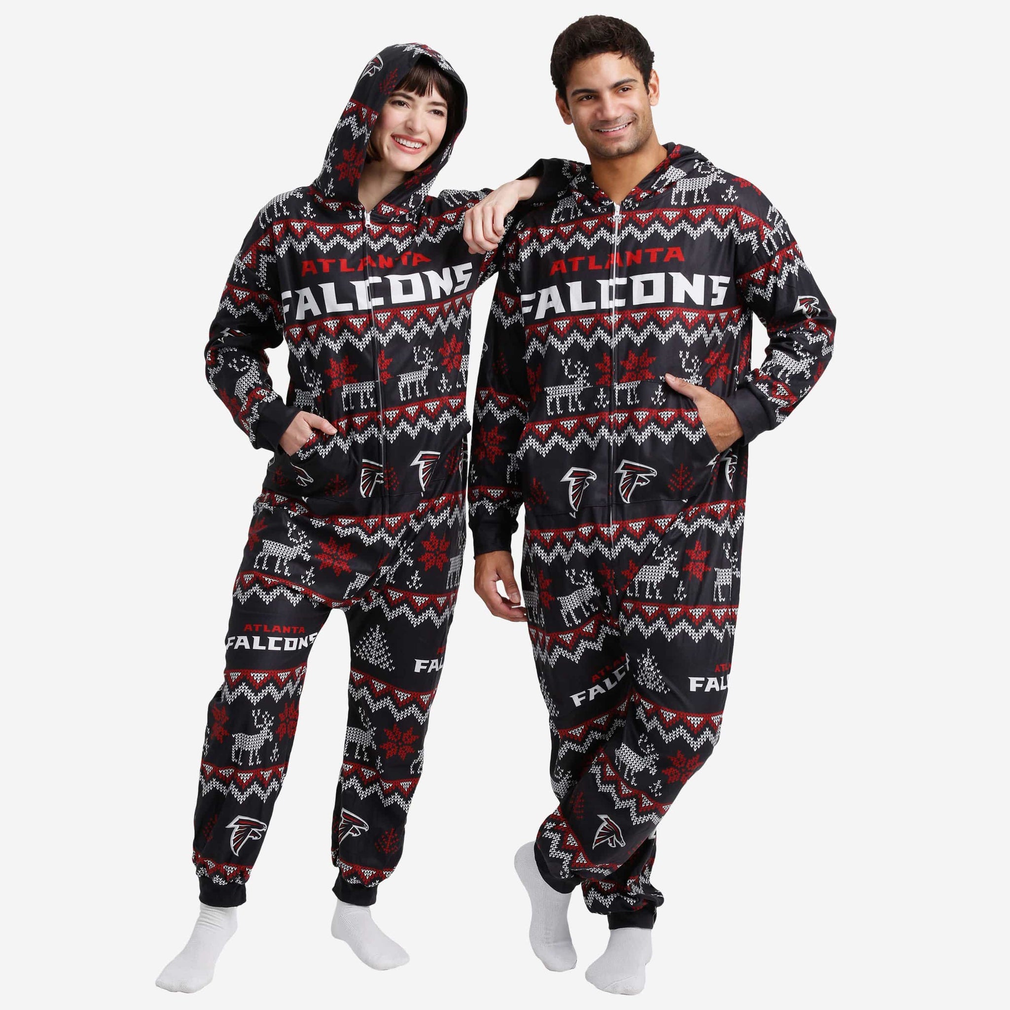 Get some matching family pajamas and dress to impress this holiday season! You won't want to miss these onesie team pajamas! These men's and women's PJ's are comfortable and show off your team spirit in the form of some sweet one piece jammies. Introducing the Atlanta Falcons Ugly Pattern One Piece Pajamas! Don't forget to take your holiday photo with the whole family wearing matching Christmas pajamas!