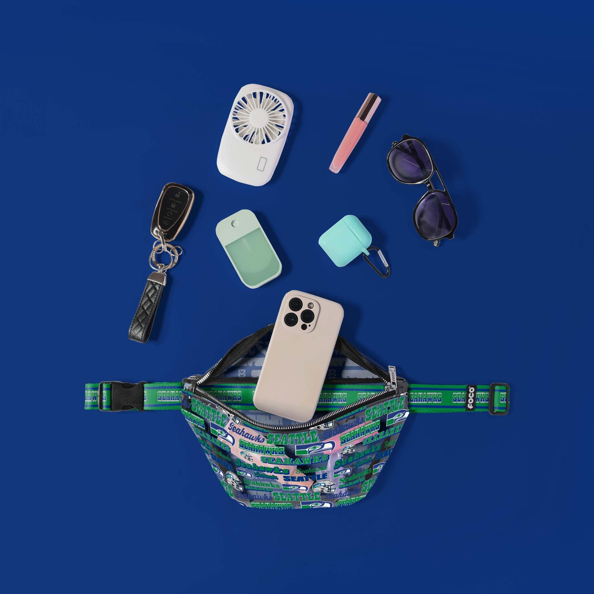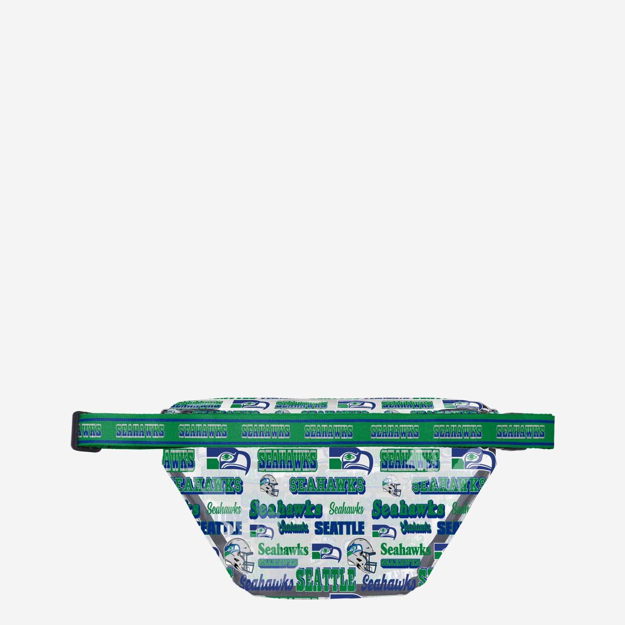 - Repeat Seattle Seahawks current and retro team logo and wordmark displays on the fanny pack, in case there were any doubts where your allegiances lie
